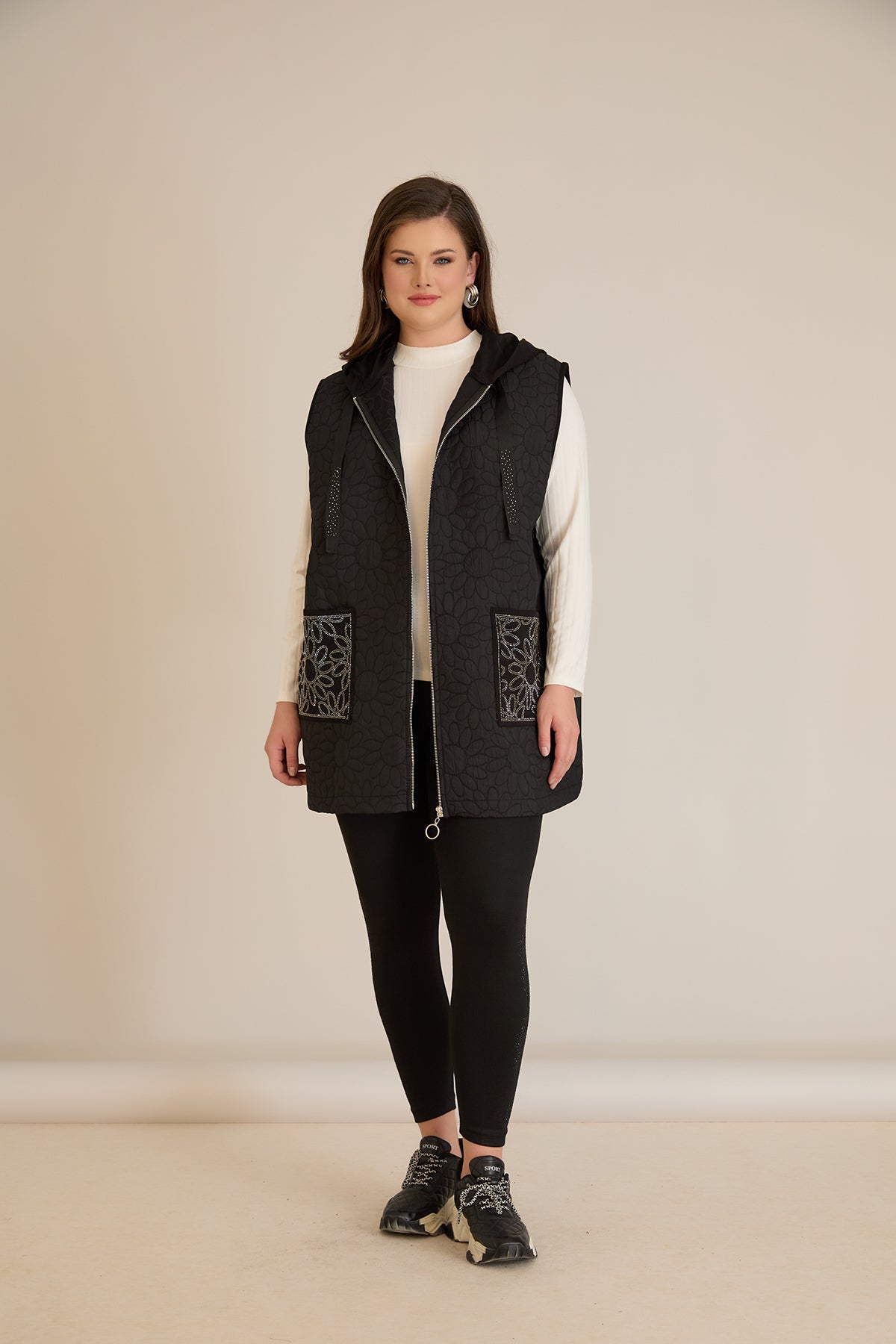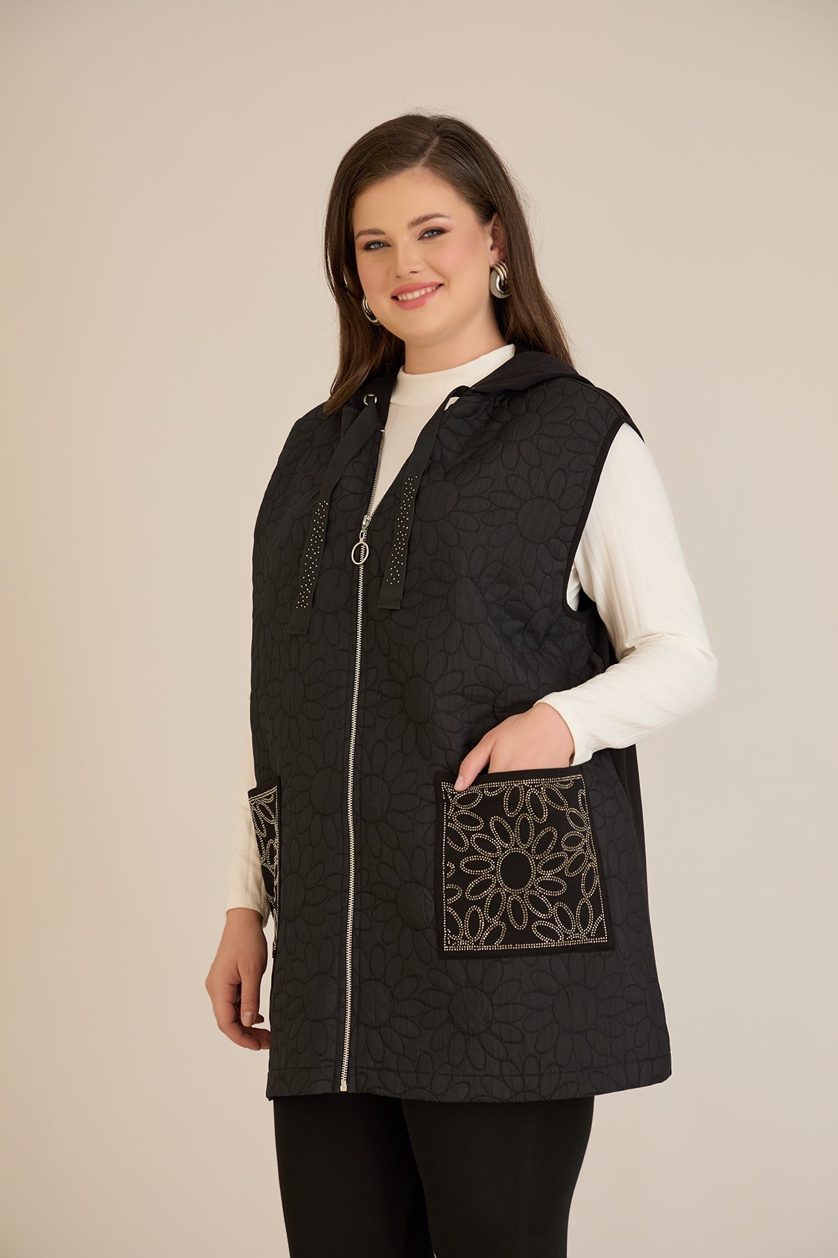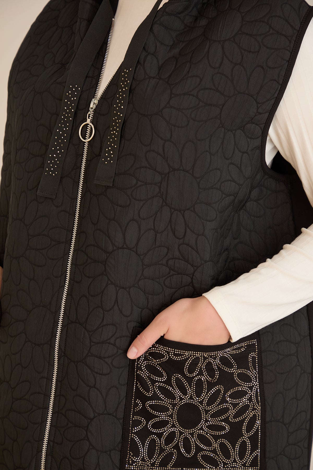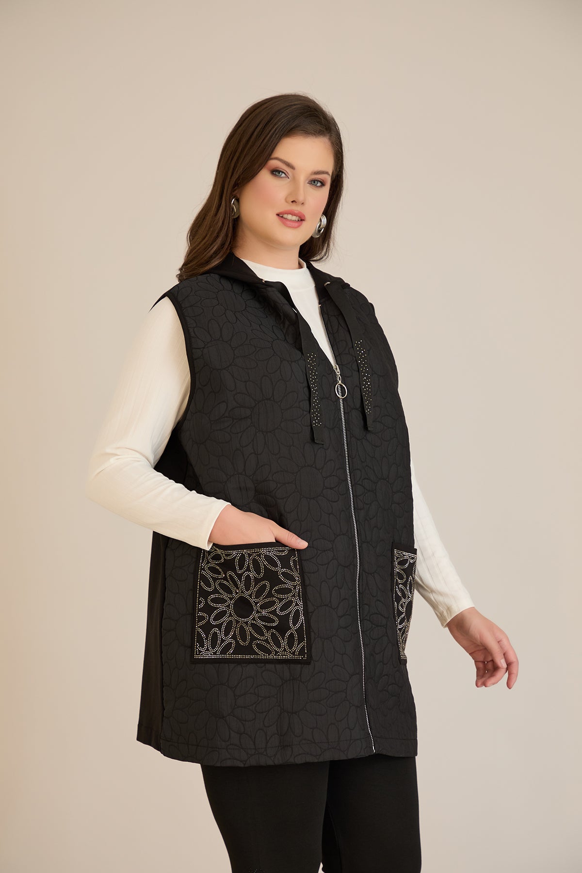Γιλέκο με κουκούλα και στρας από ανάγλυφο ύφασμα- Μαύρο