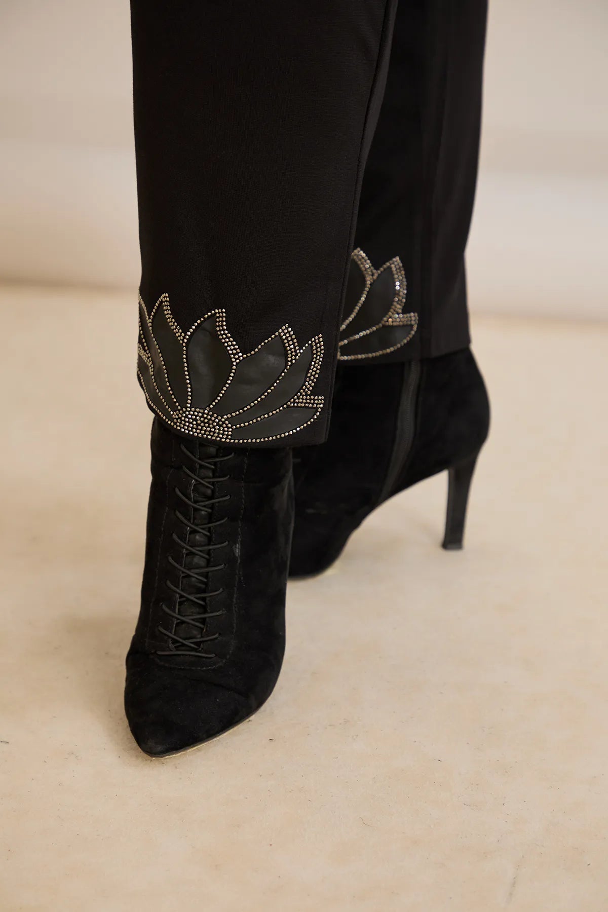 • Λεπτομέρεια από δερμάτινα λουλούδια στα μπατζάκια, διακοσμημένα με στρασάκια