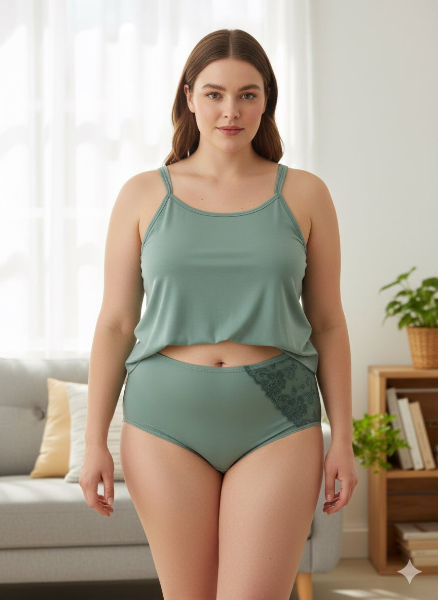 *Δεν είναι δεκτή αλλαγή και επιστροφή εσωρούχων! Σλιπ σε απαλό χρώμα μέντας, με πολυτελή διακόσμηση από τούλι, ιδανικό για γυναίκες με καμπύλες. Κατασκευασμένο από συνδυασμό βαμβακιού και πολυτελές τούλι, προσφέρει άνεση, σταθερότητα και κομψό στυλ. Το σλιπ έχει σχεδιαστεί ειδικά για γυναίκες με καμπύλες που θέλουν να αισθάνονται άνετα και με αυτοπεποίθηση. Προσφέρει τέλεια εφαρμογή και κομψό σχεδιασμό που αναδεικνύει τη θηλυκότητα. Οι πολυτελείς λεπτομέρειες προσθέτουν φινέτσα, καθιστώντας το ιδανική επιλογή για κάθε γυναίκα που εκτιμά την ποιότητα και την κομψότητα.
