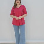 Ένα ελκυστικό βαμβακερό κόσμημα - έτσι θα λέγαμε την τελευταία μας δημιουργία. Με την εξαιρετικά ελκυστική και πιο σημαντική προφορά της - μαύρο βαμβακερό ρέλι, αυτή η μπλούζα θα ταιριάζει τέλεια με κάθε κολάν, παντελόνι ή τζιν σε σκούρο χρώμα. Το αγαπημένο μανίκι 7/8 και η V λαιμόκοψη είναι οι συνήθεις λεπτομέρειες για άνεση και καλό στυλ. Απόλυτα κατάλληλο για να φορεθεί κάτω από τις ζακέτες, τα μπουφάν, τα bomber jackets μας.