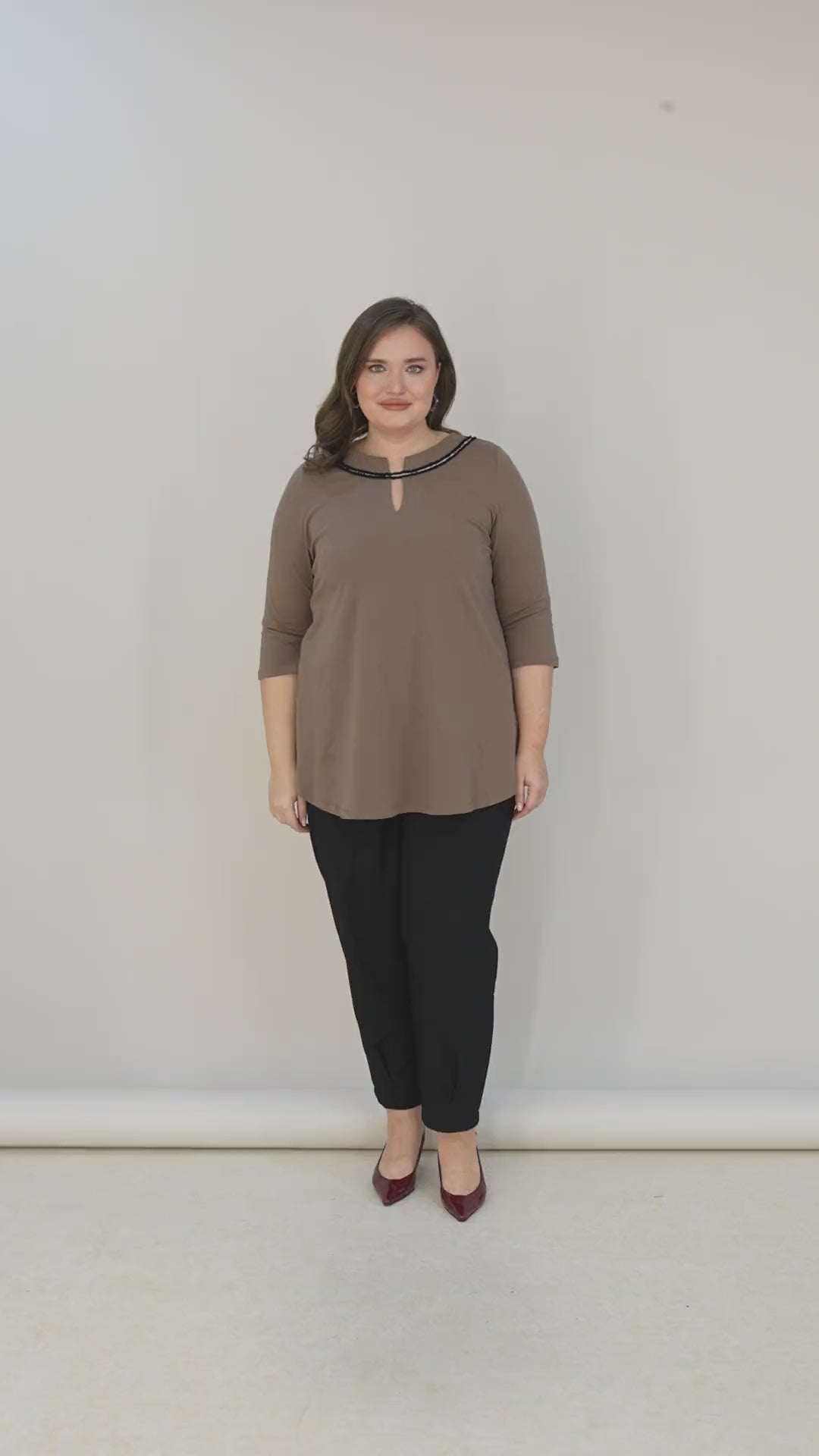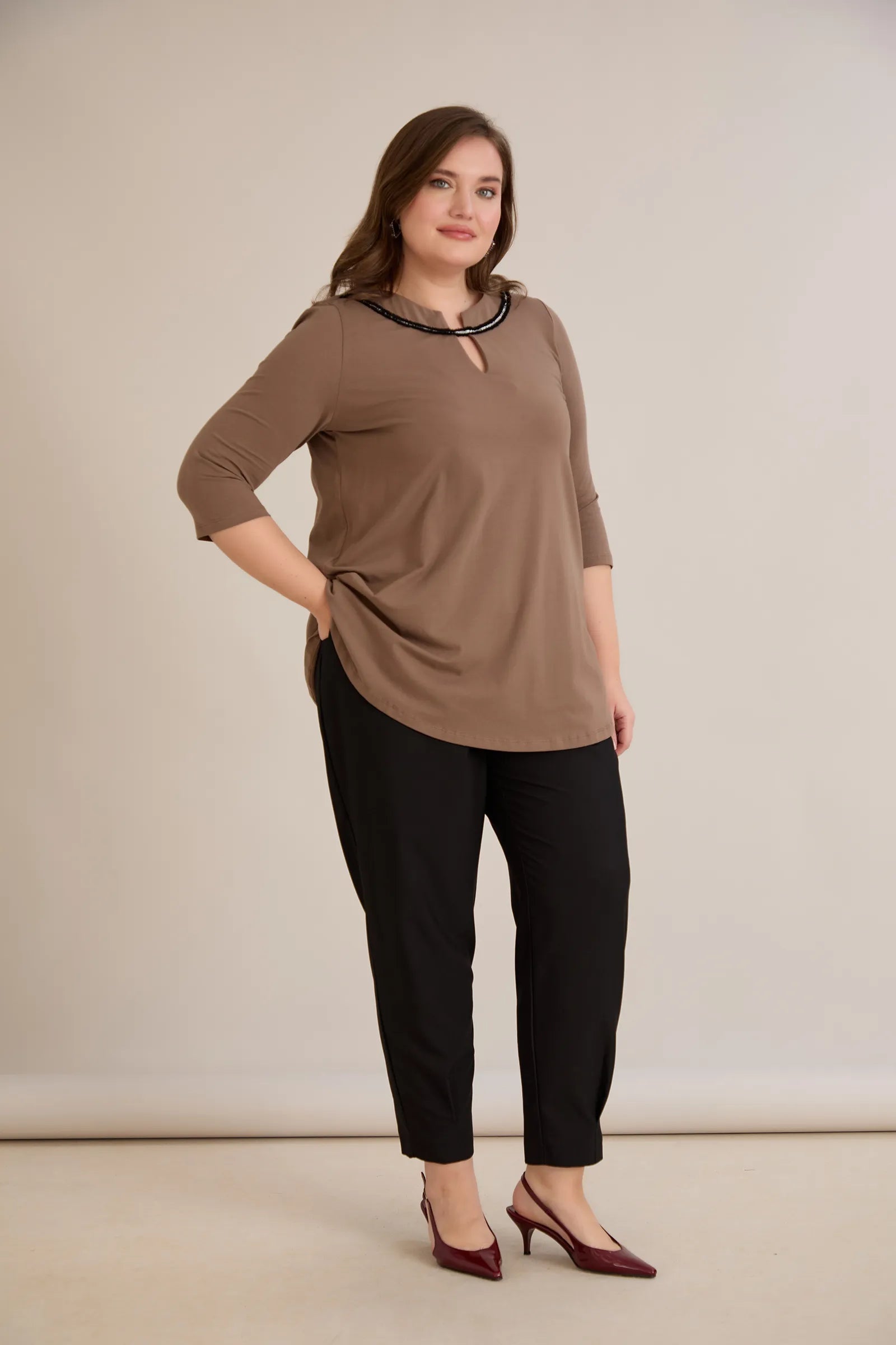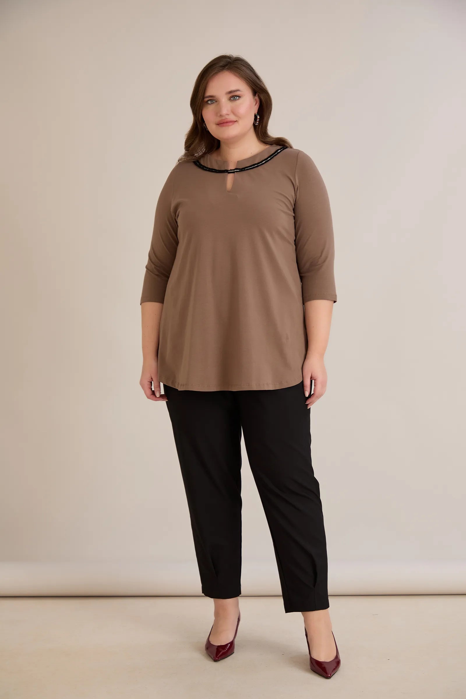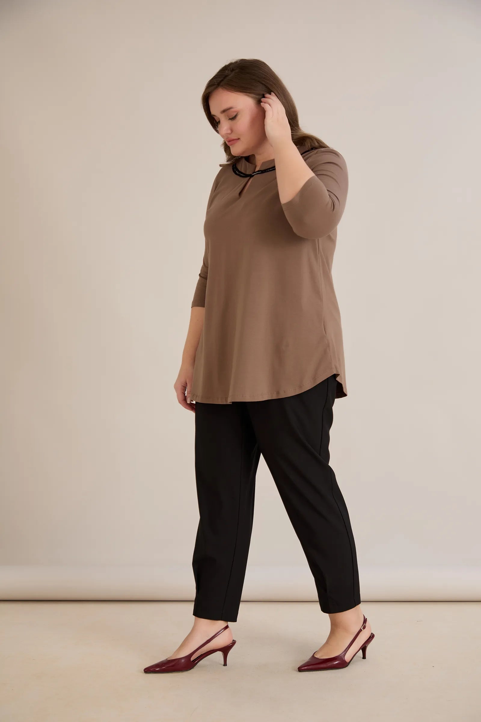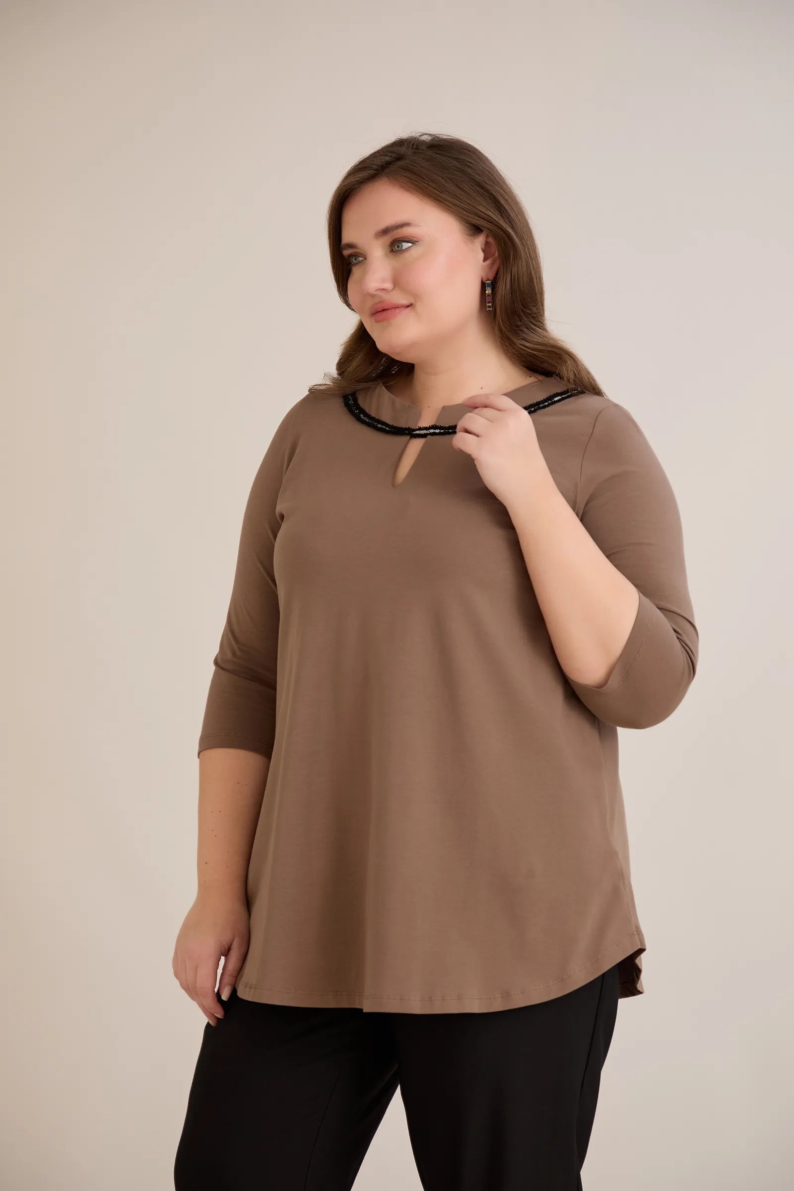 Βαμβακερή τουνίκ με εντυπωσιακό ντεκολτέ με ασημί λεπτομέρεια – Μόκα