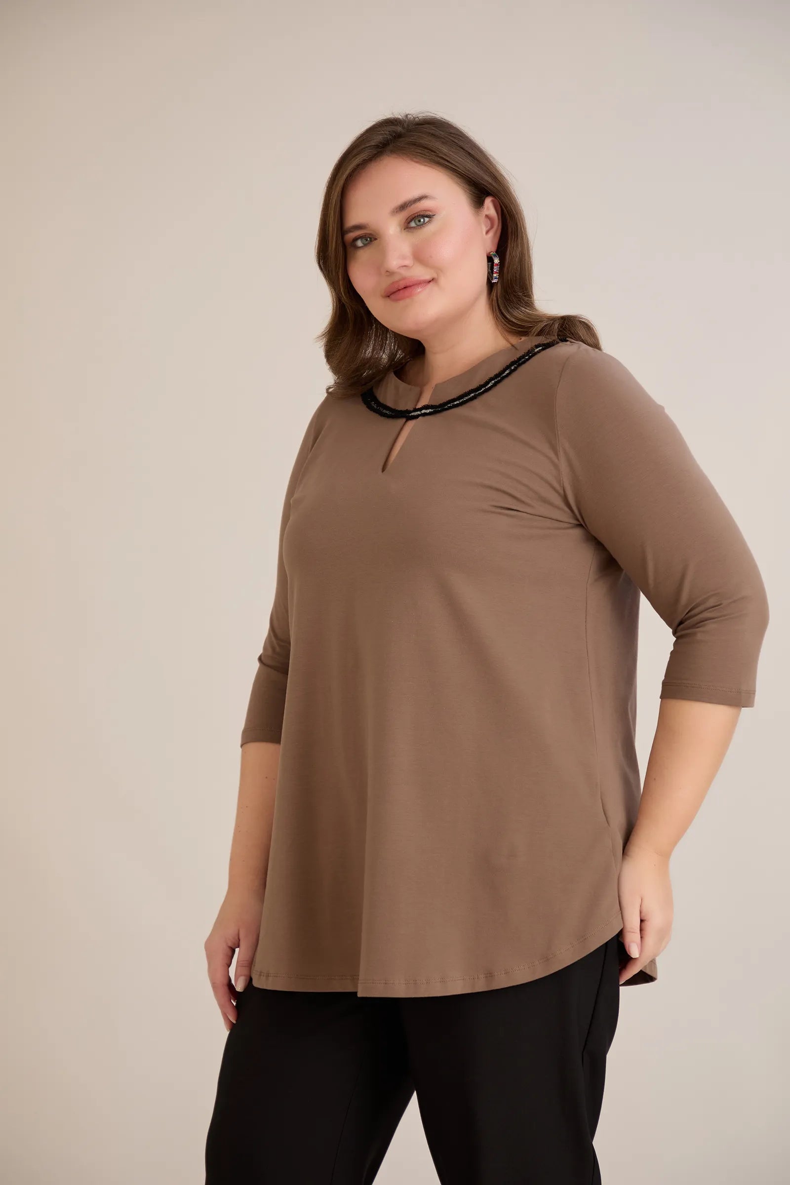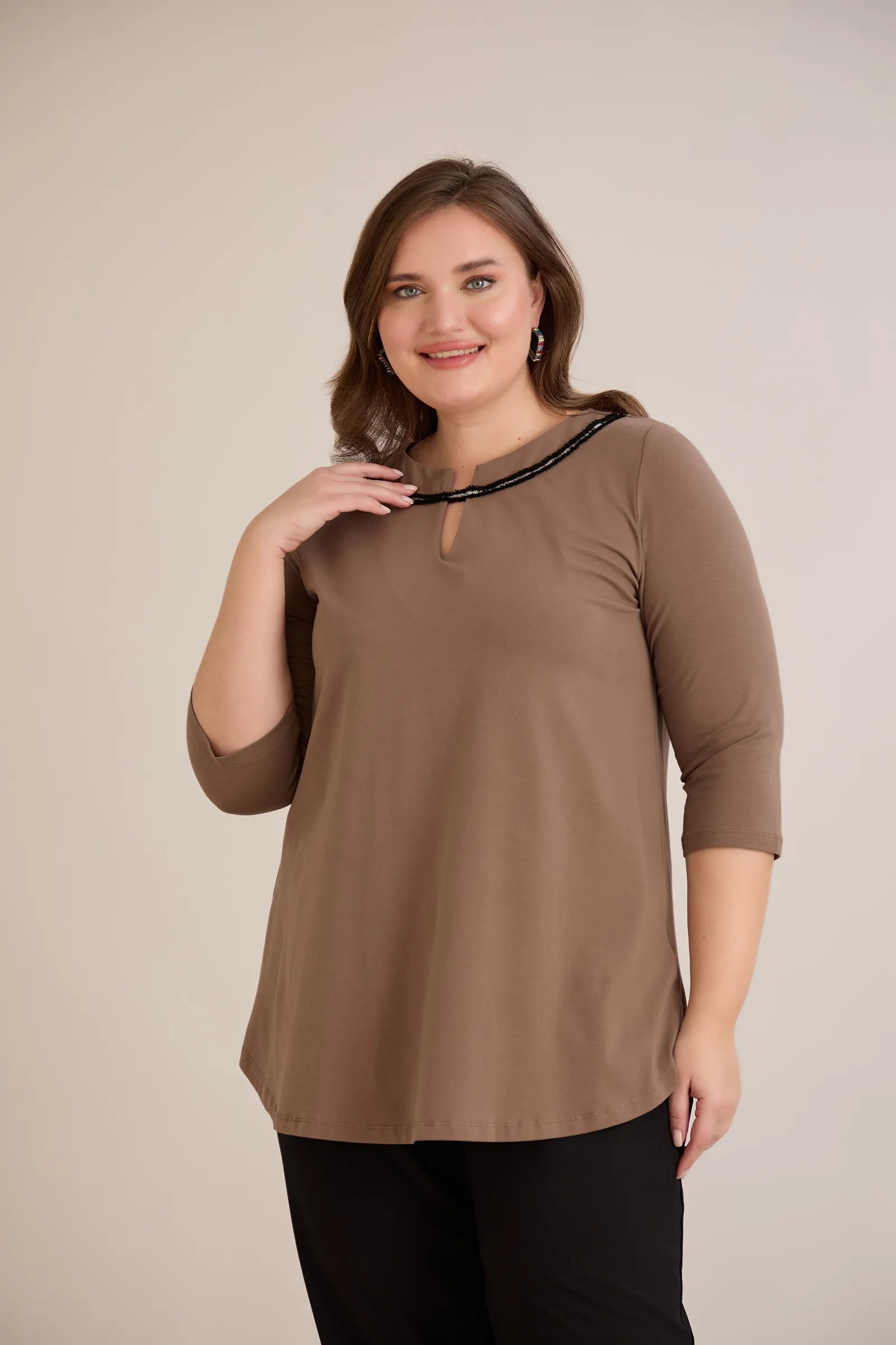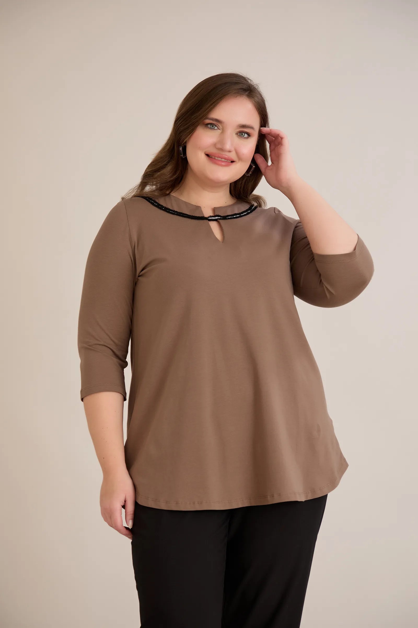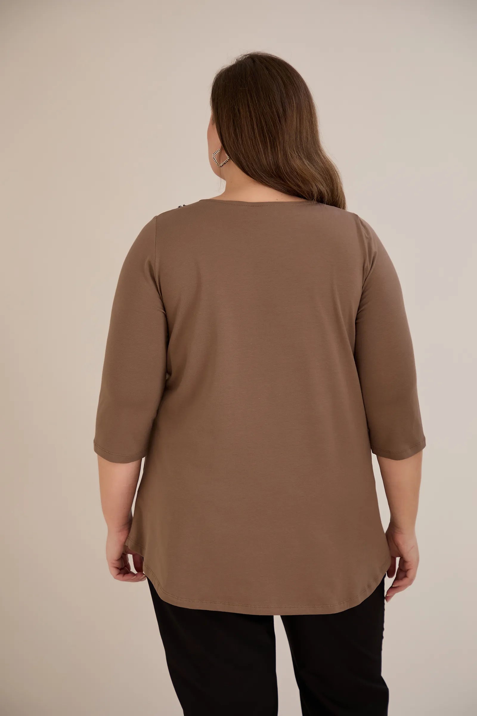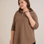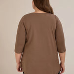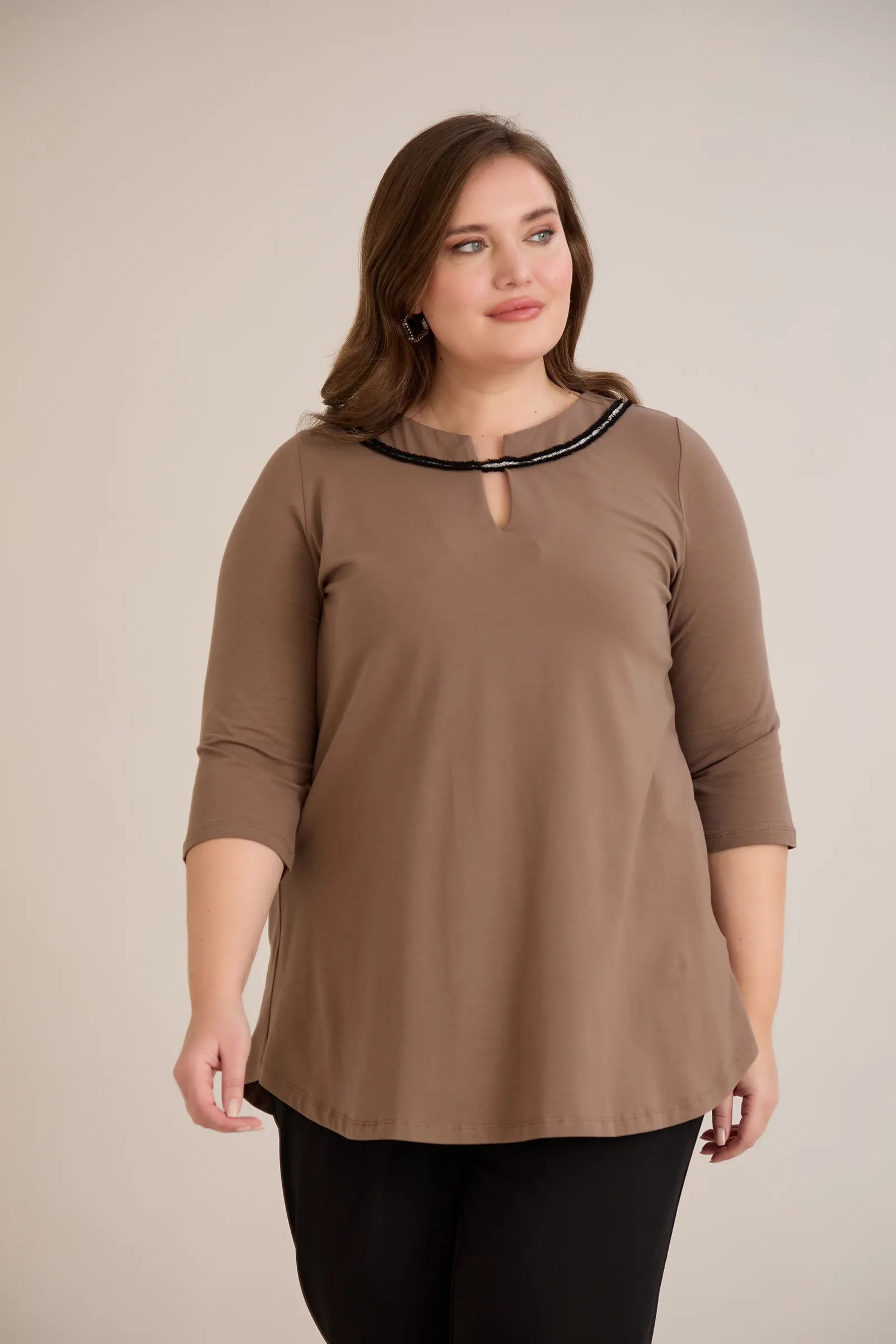 Βαμβακερή τουνίκ με εντυπωσιακό ντεκολτέ με ασημί λεπτομέρεια σε Μόκα χρώμα σε μεγάλα μεγέθη