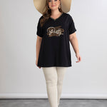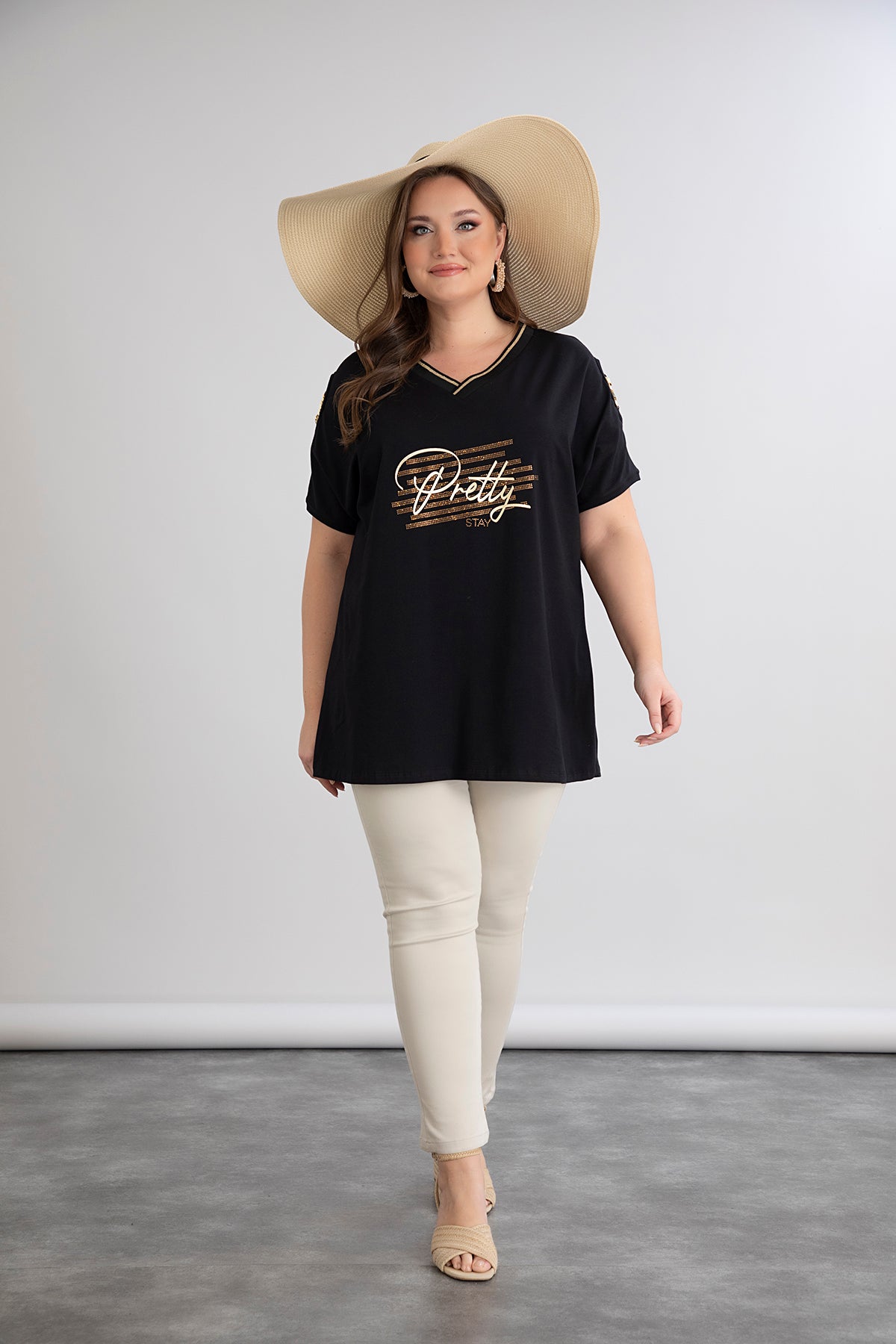 Βαμβακερό μπλουζάκι με χρυσά στοιχεία σε μαύρο χρώμα σε μεγάλα μεγέθη