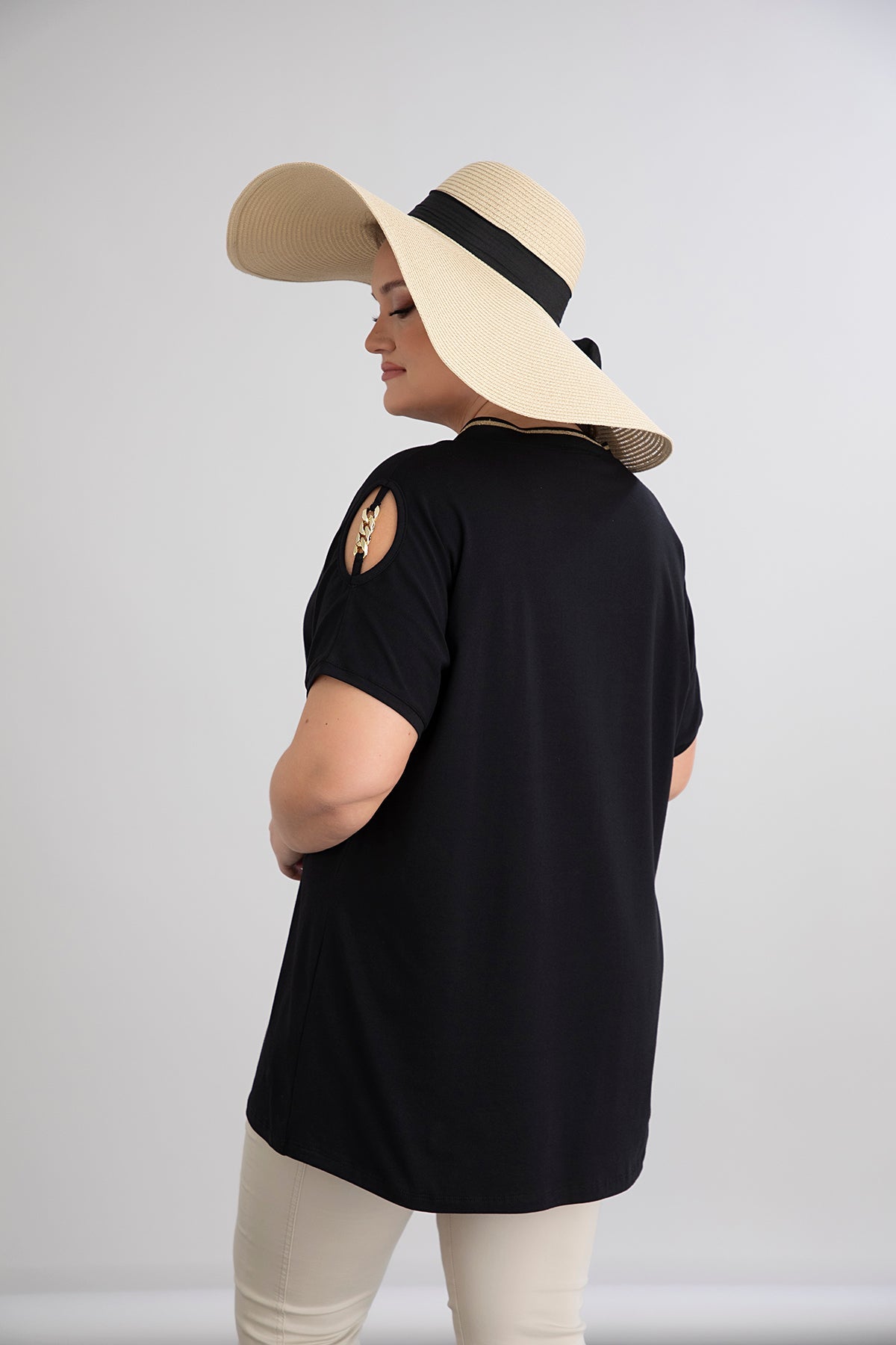Βαμβακερή μπλούζα με άνοιγμα στους ώμους και χρυσά στοιχεία. Το άνοιγμα είναι στρογγυλεμένο και ενώνεται με χρυσή αλυσίδα, η οποία προσθέτει μια κομψή και μοντέρνα πινελιά στο σχέδιο. Αυτό το διακοσμητικό στοιχείο κάνει τη μπλούζα πιο ιδιαίτερη, προσθέτοντας λάμψη και στυλ σε ένα απλό, αλλά κομψό ρούχο.