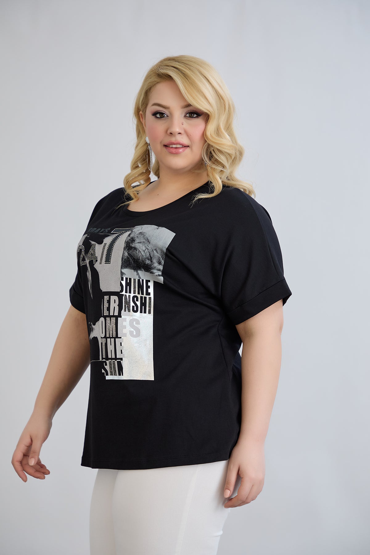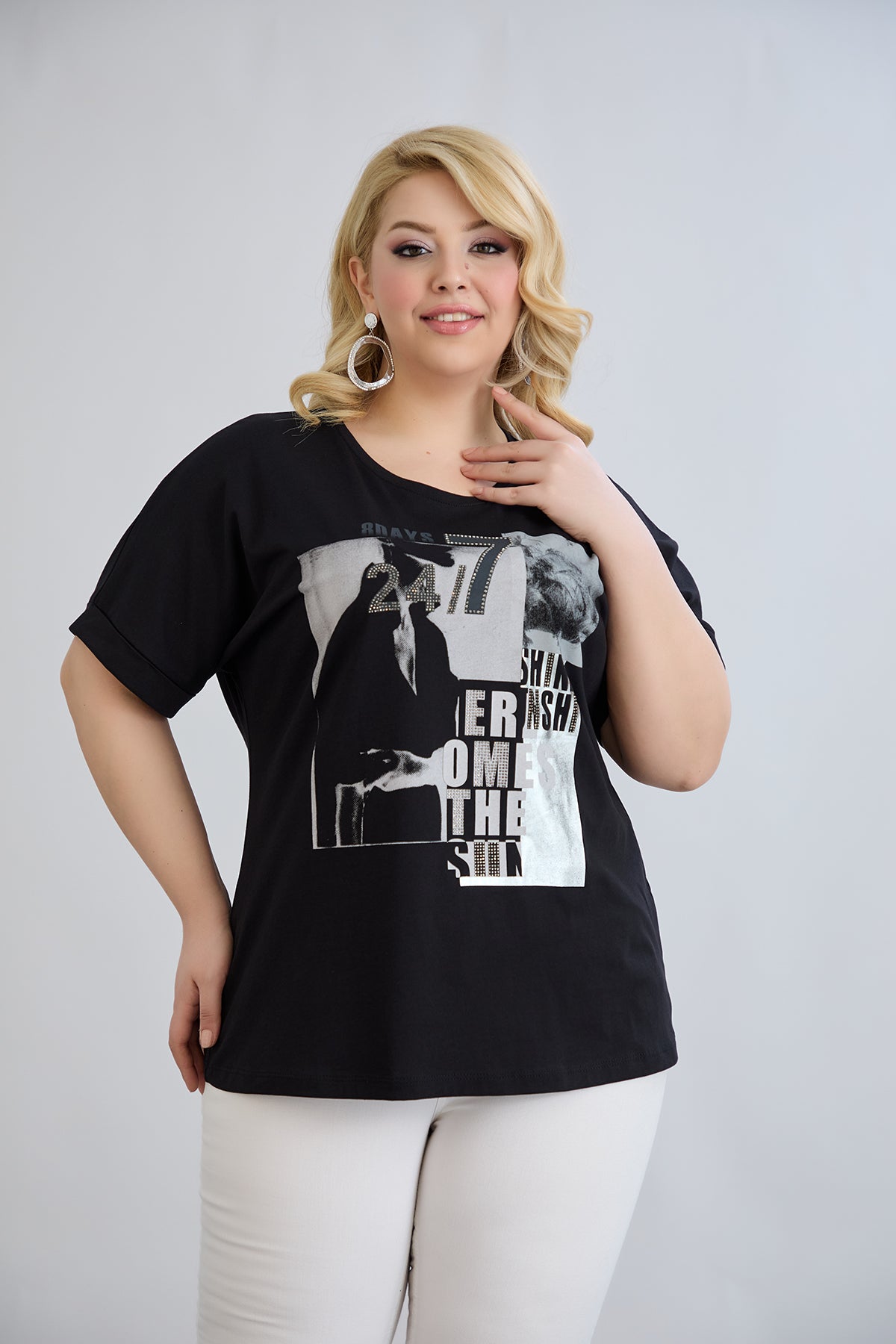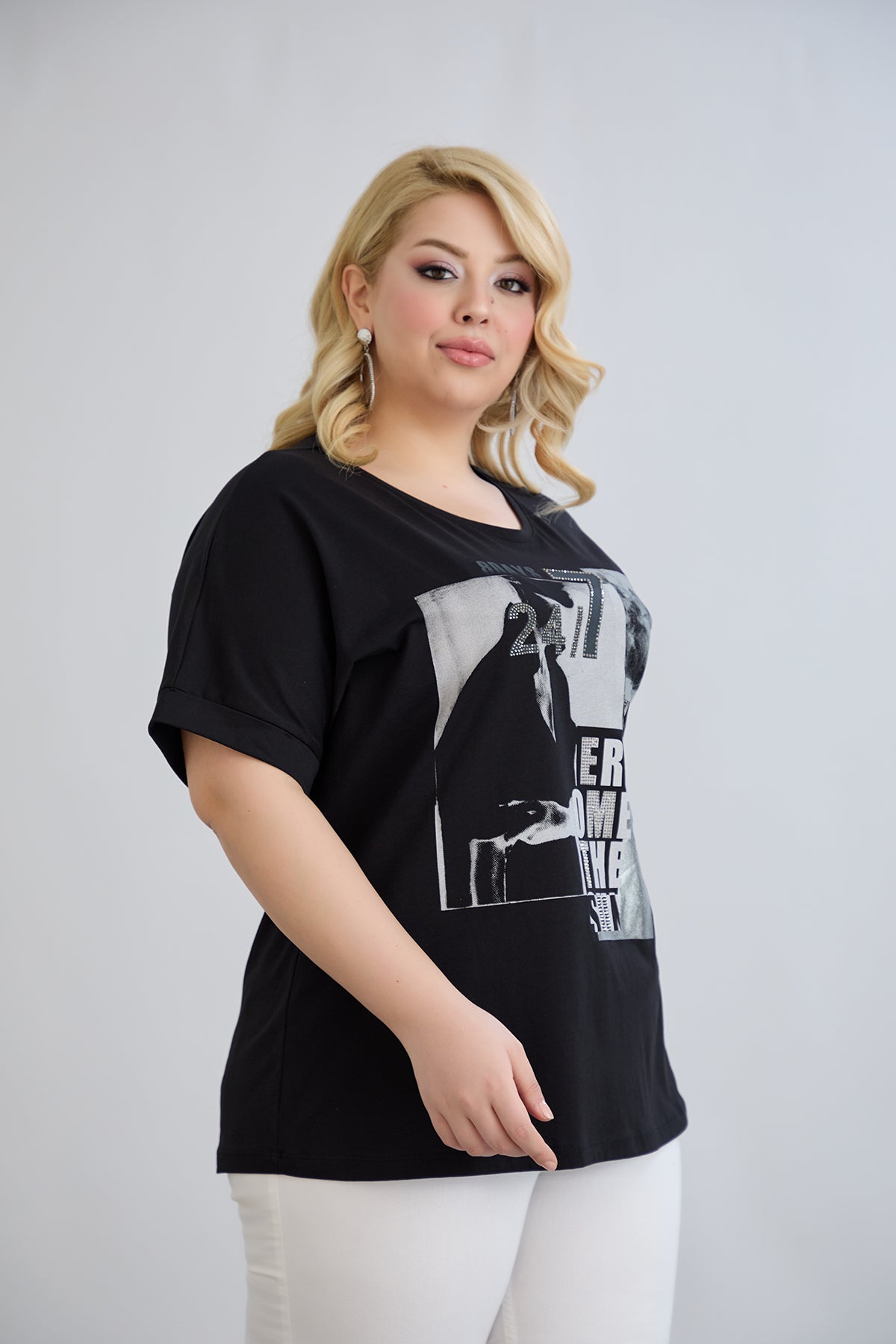 Βαμβακερό μπλουζάκι με στρασάκια και τύπωμα 24/7 σε μαύρο χρώμα σε μεγάλα μεγέθη