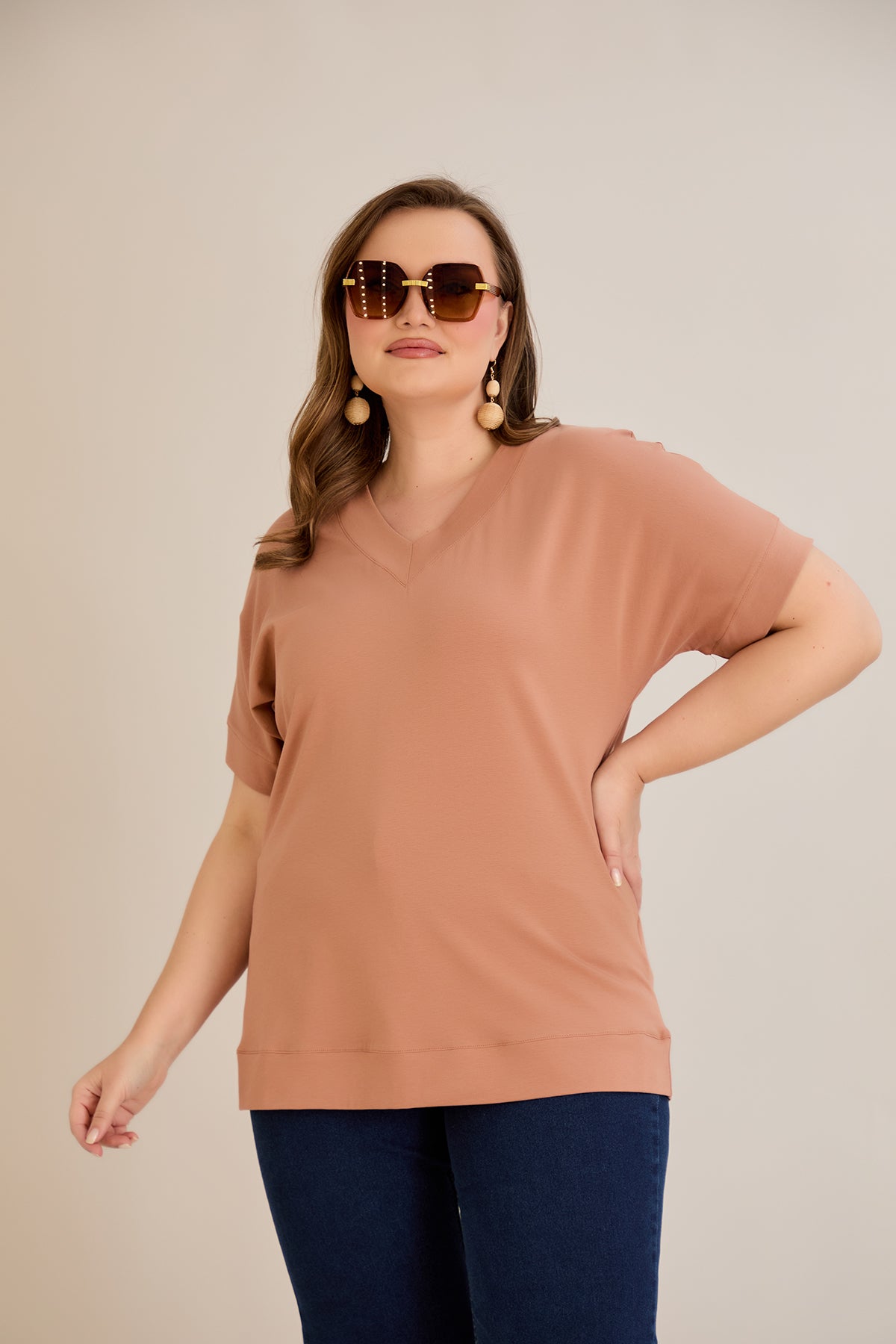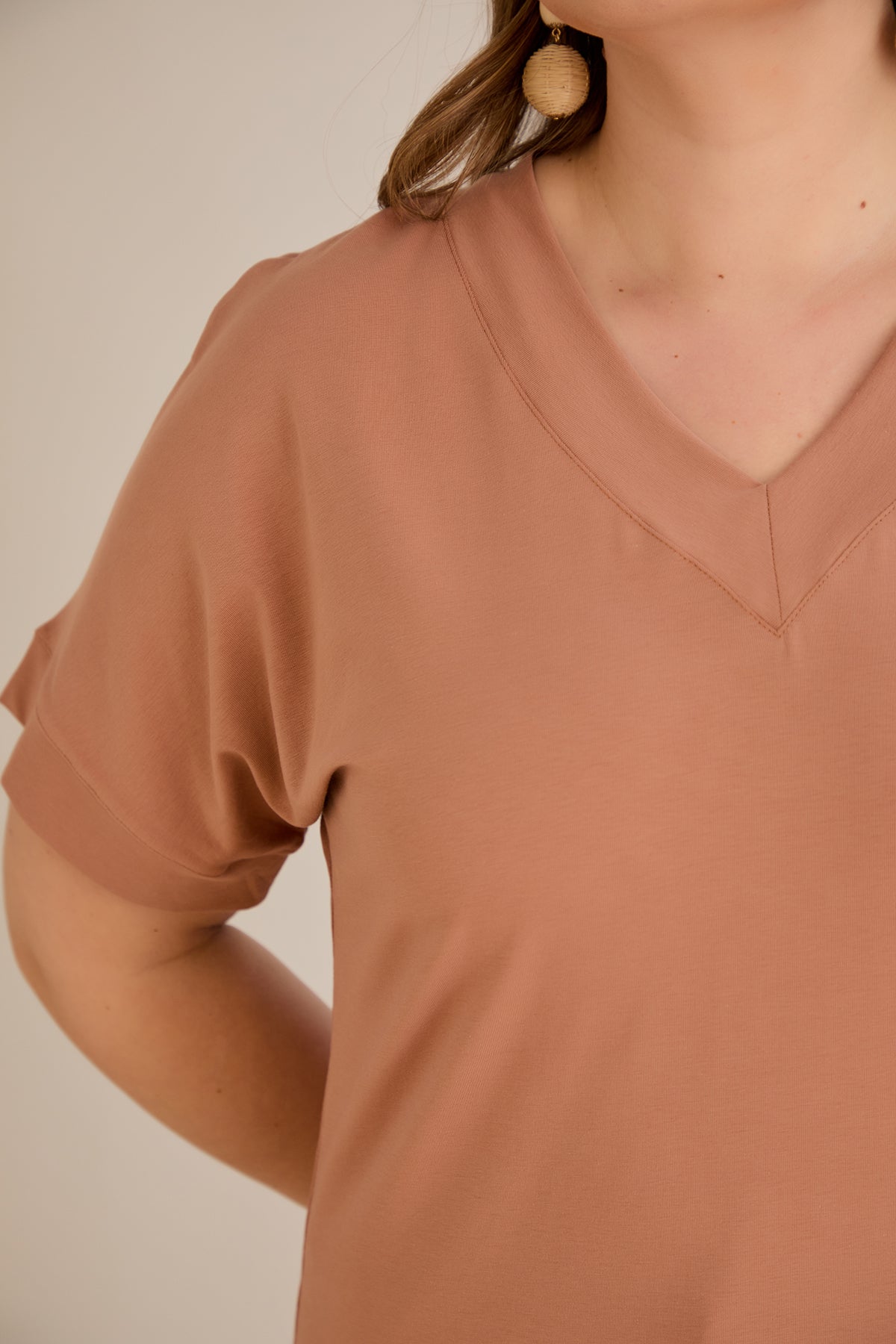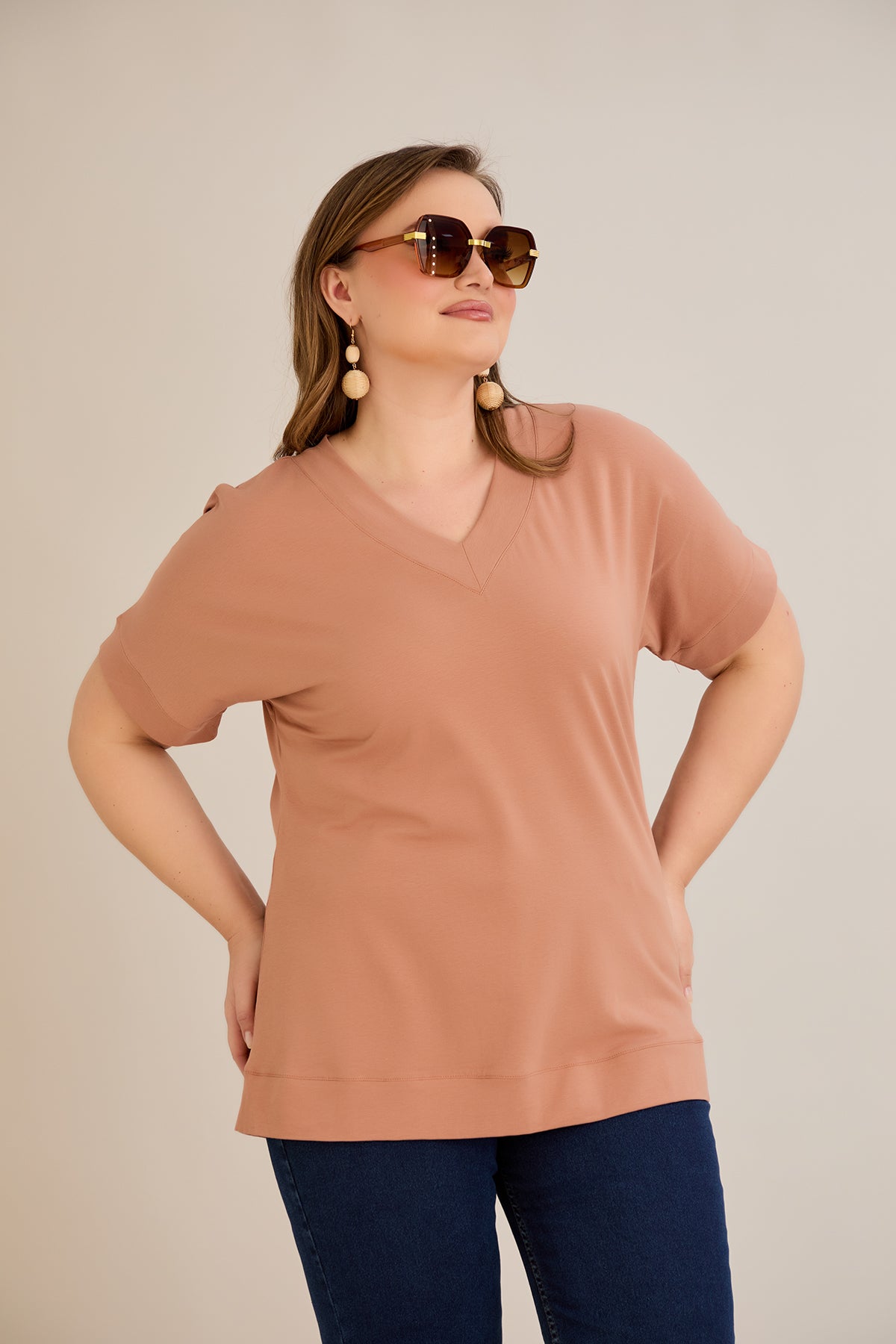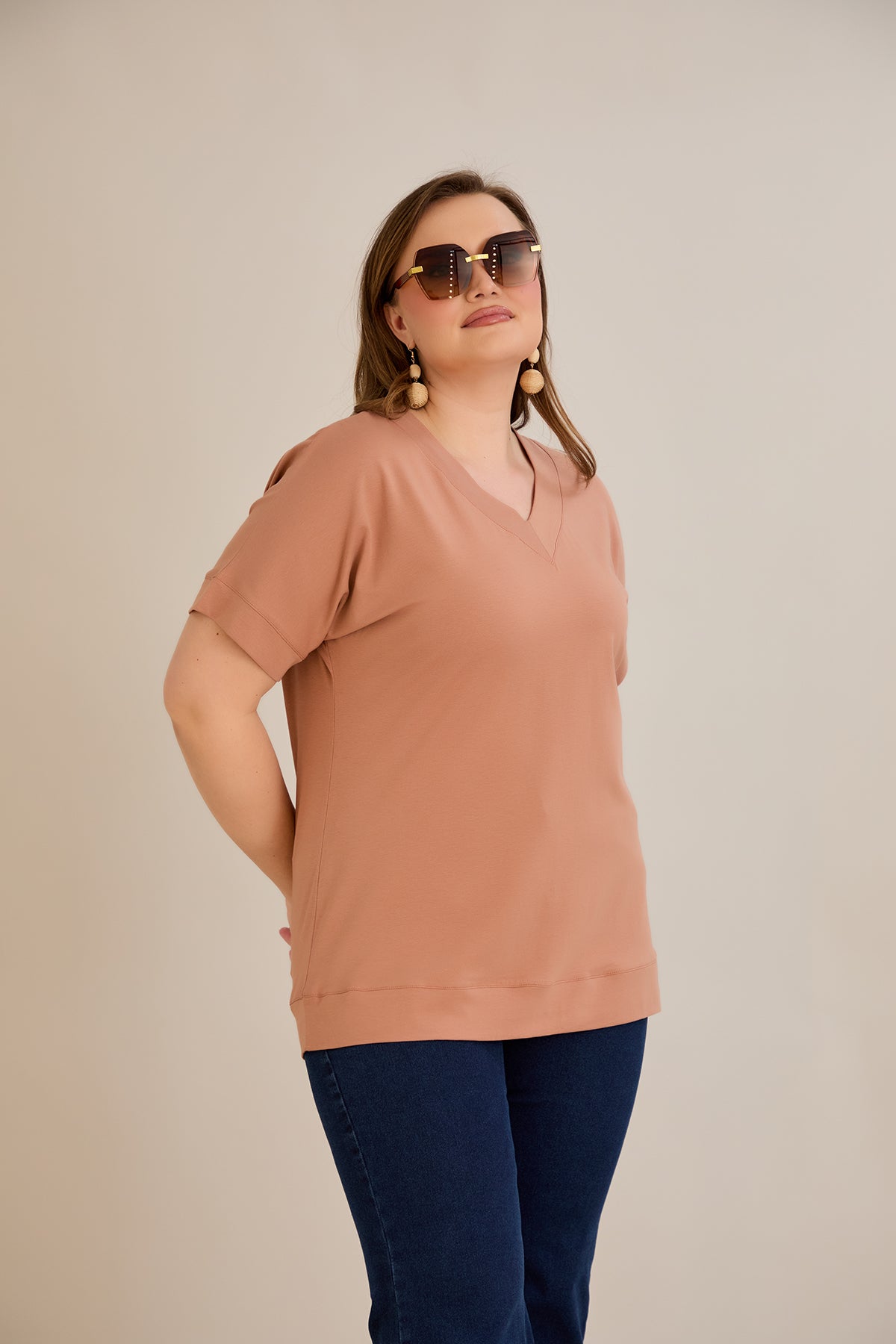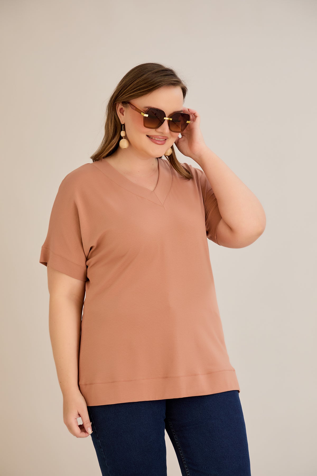 Βαμβακερό μπλουζάκι με V λαιμόκοψη σε Καραμελέ χρώμα σε μεγάλα μεγέθη