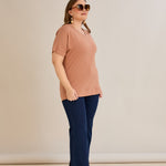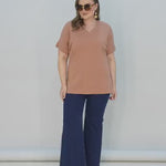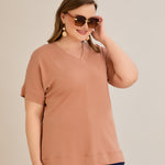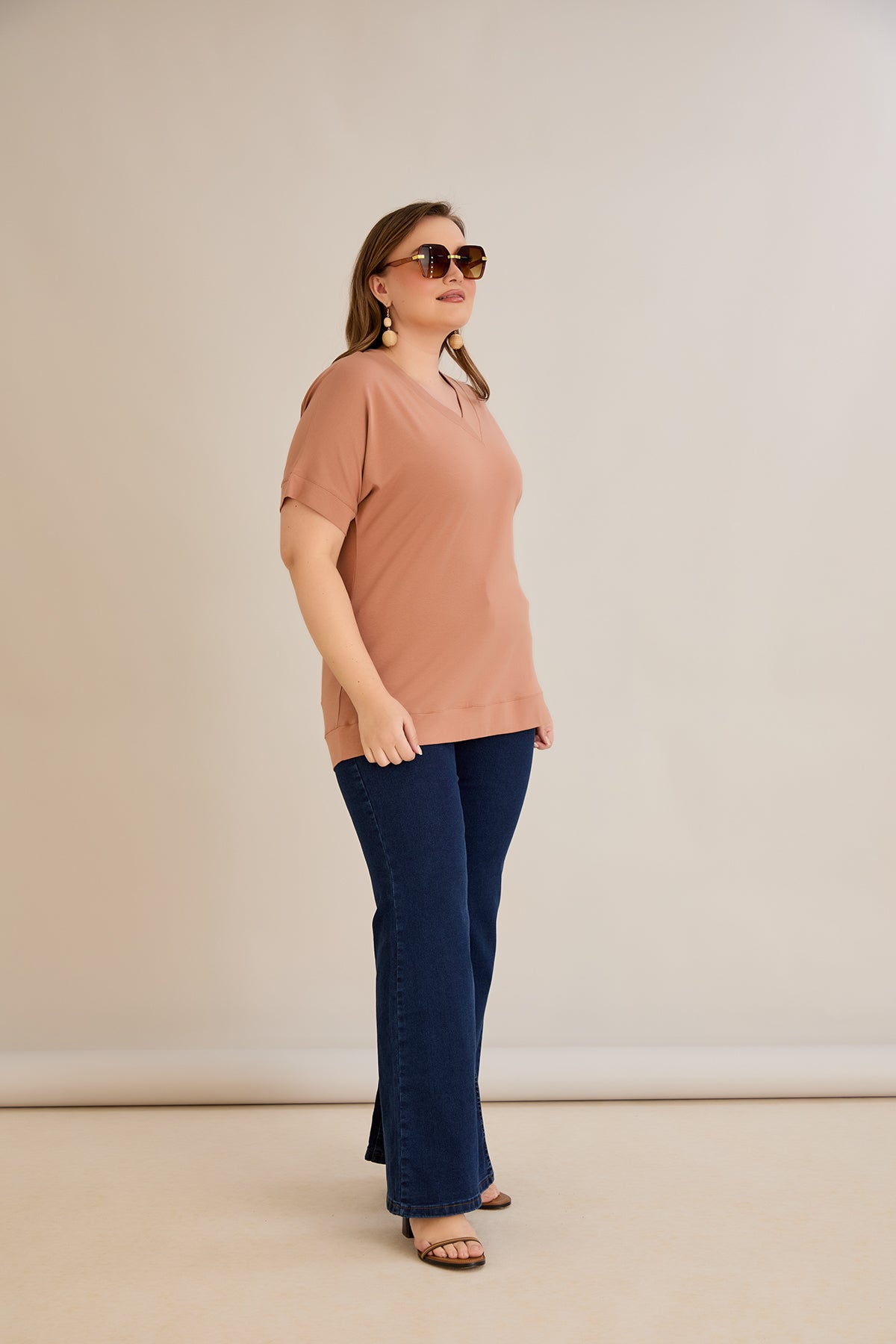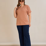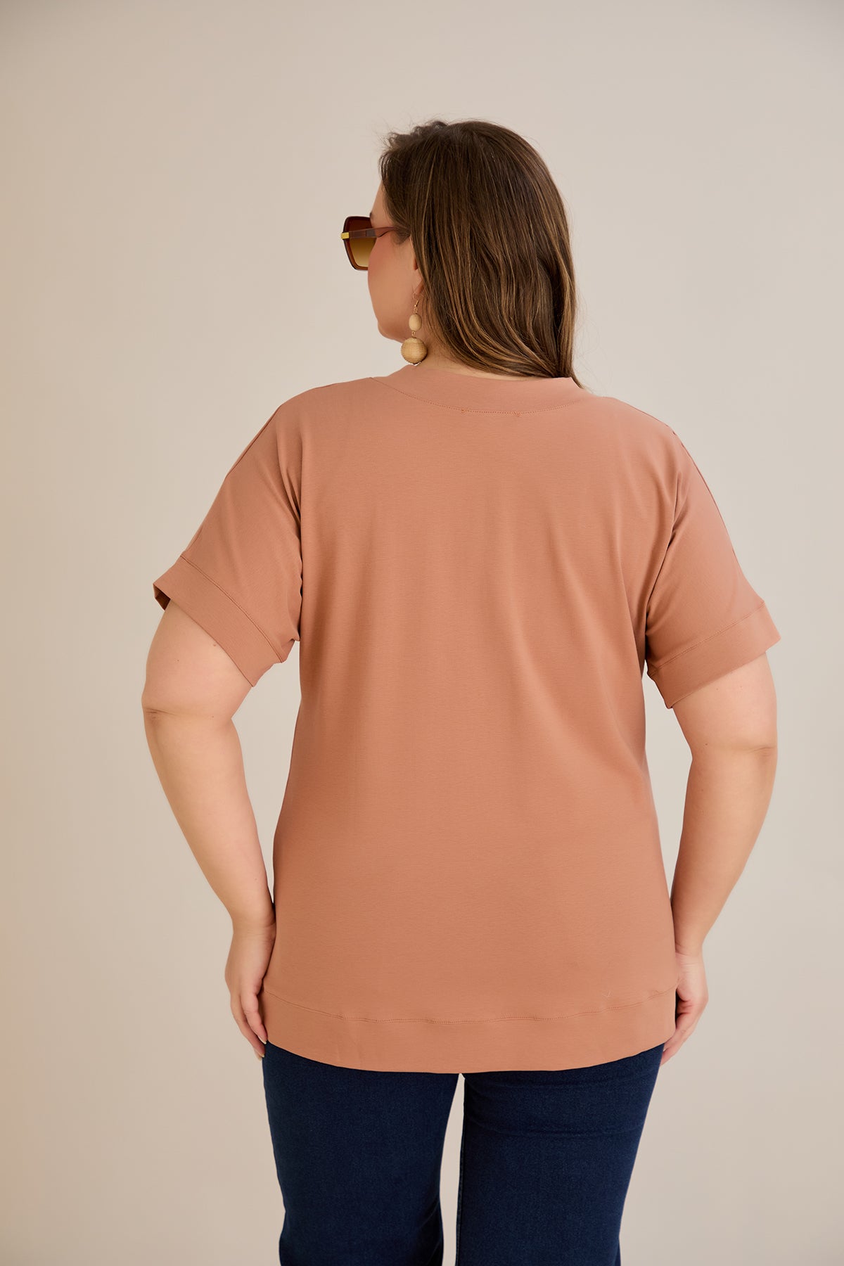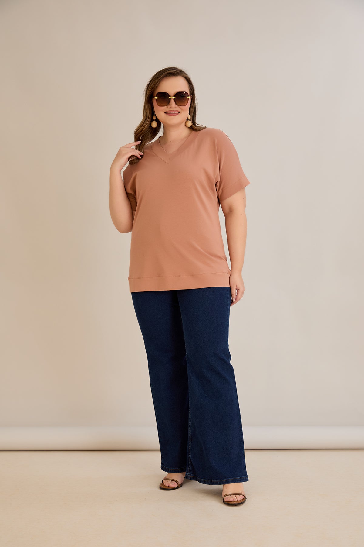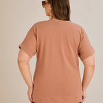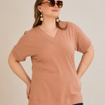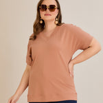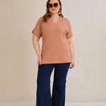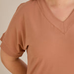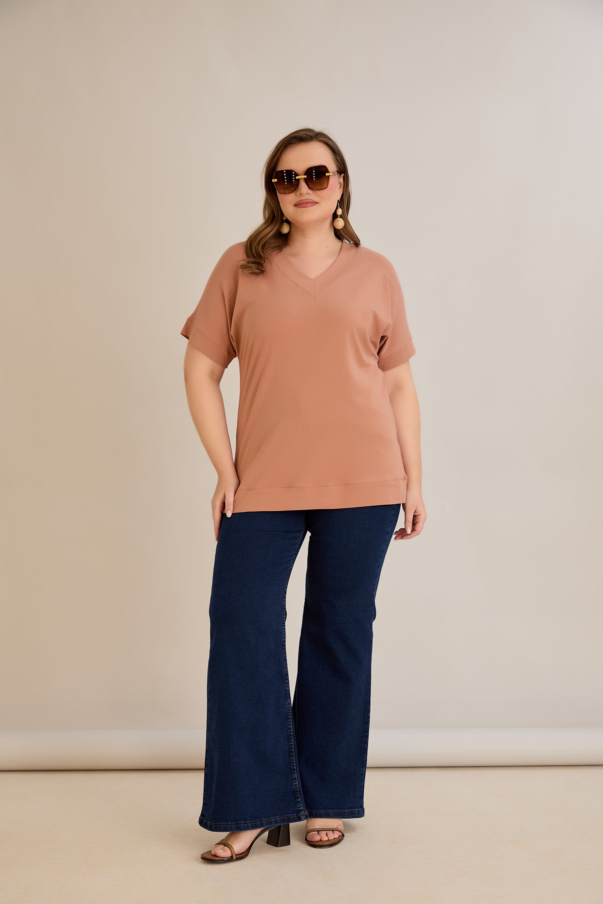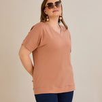 Βαμβακερό μπλουζάκι με V λαιμόκοψη σε Καραμελέ χρώμα σε μεγάλα μεγέθη