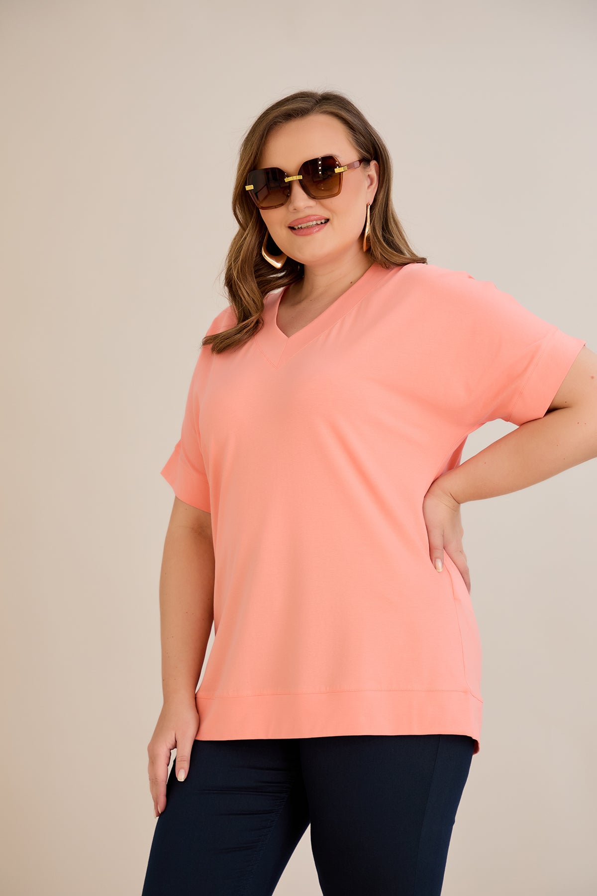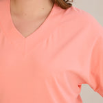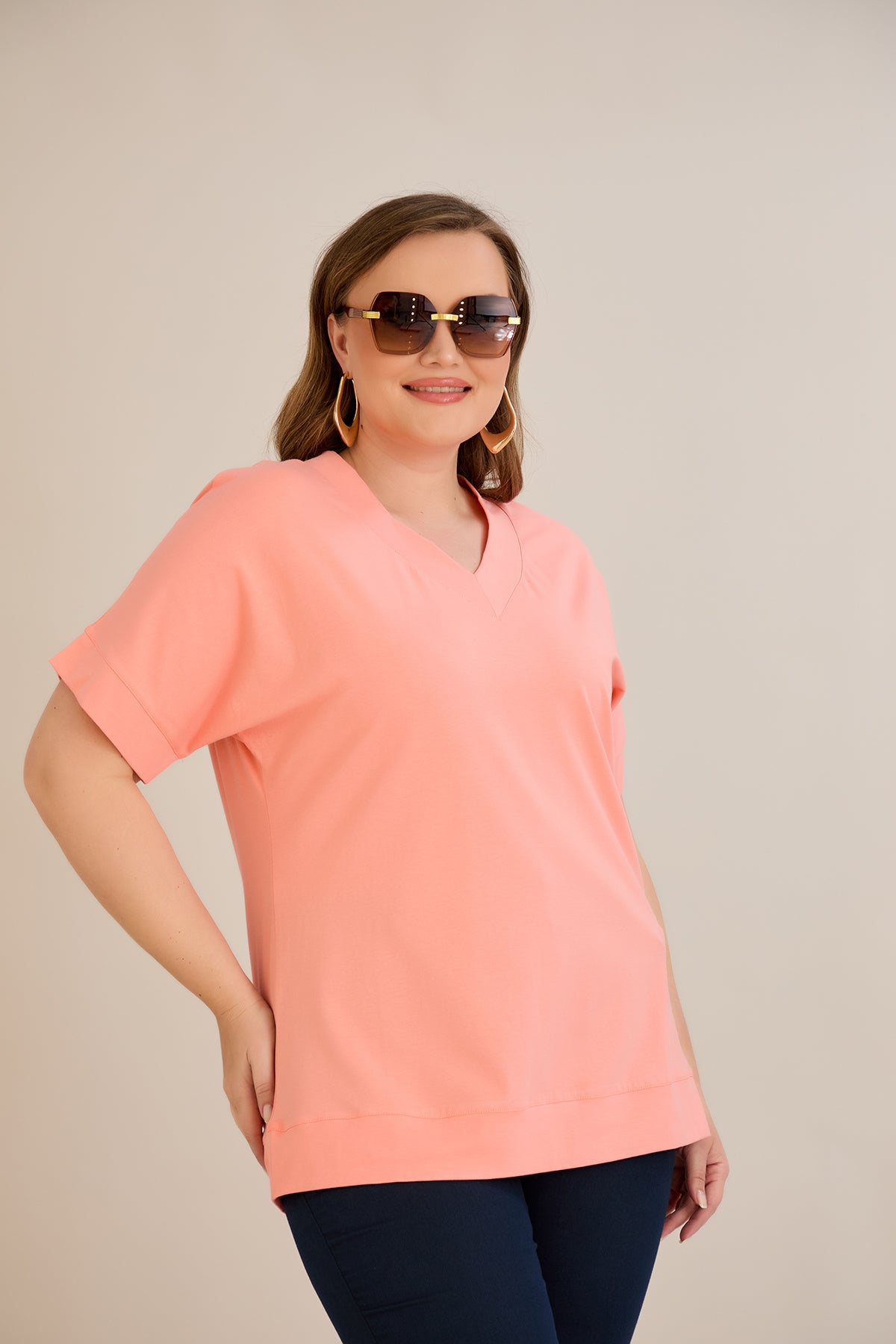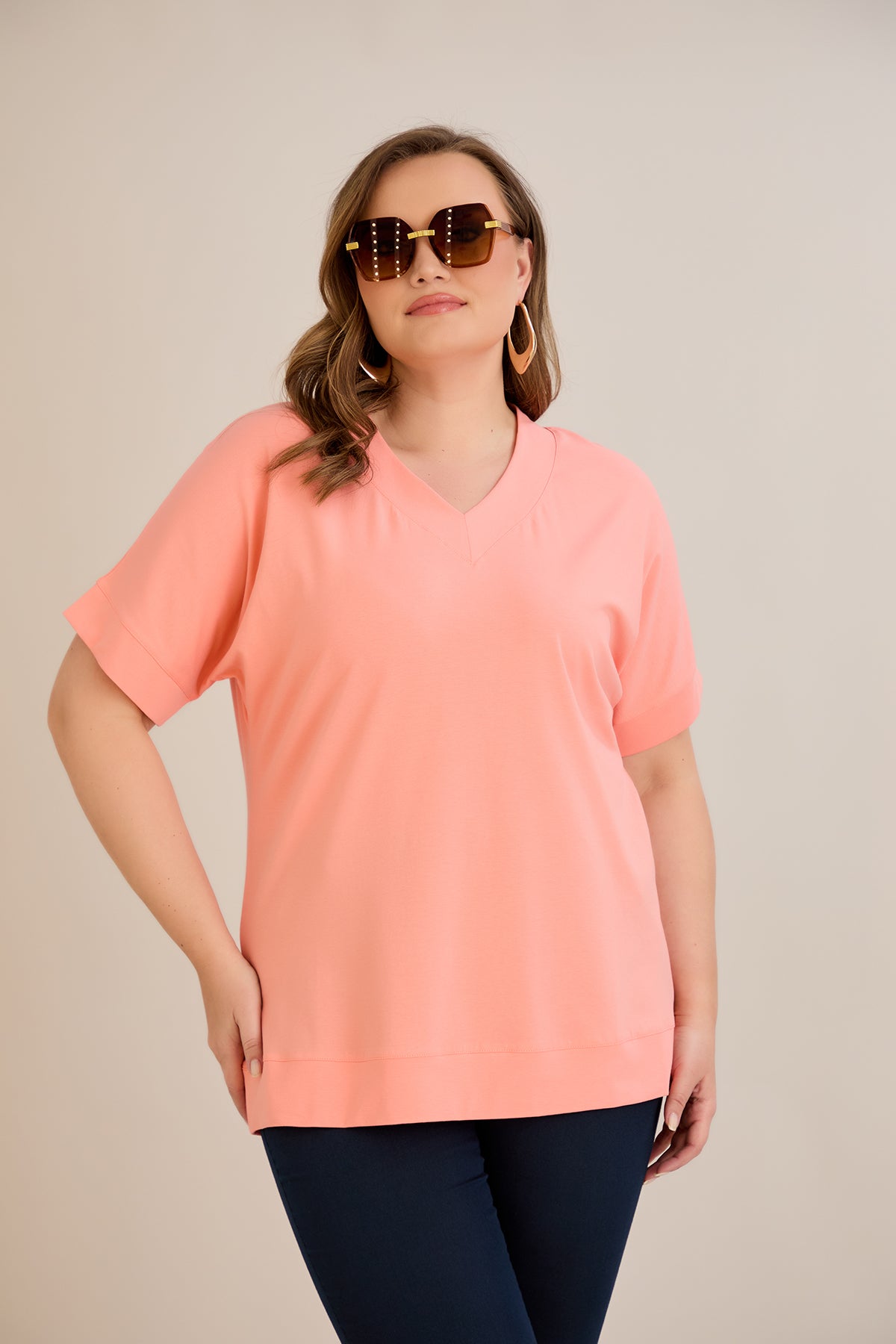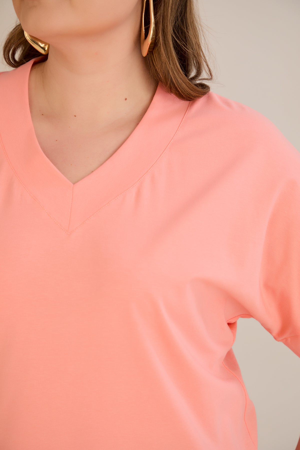 Βαμβακερό μπλουζάκι με V λαιμόκοψη - Ροδακινί