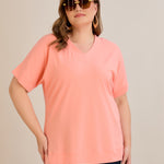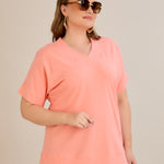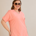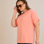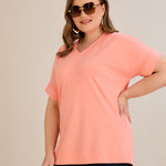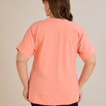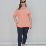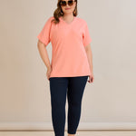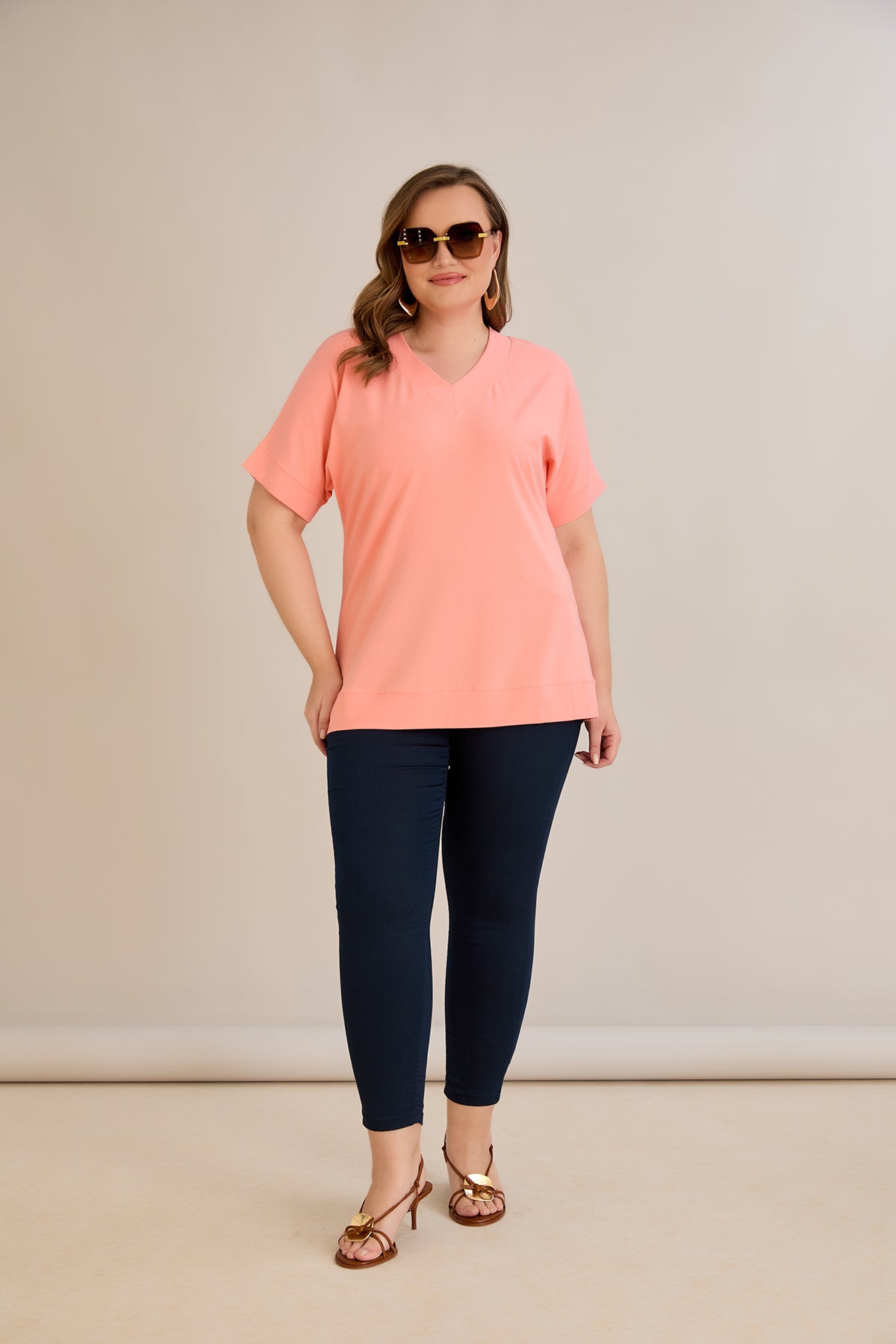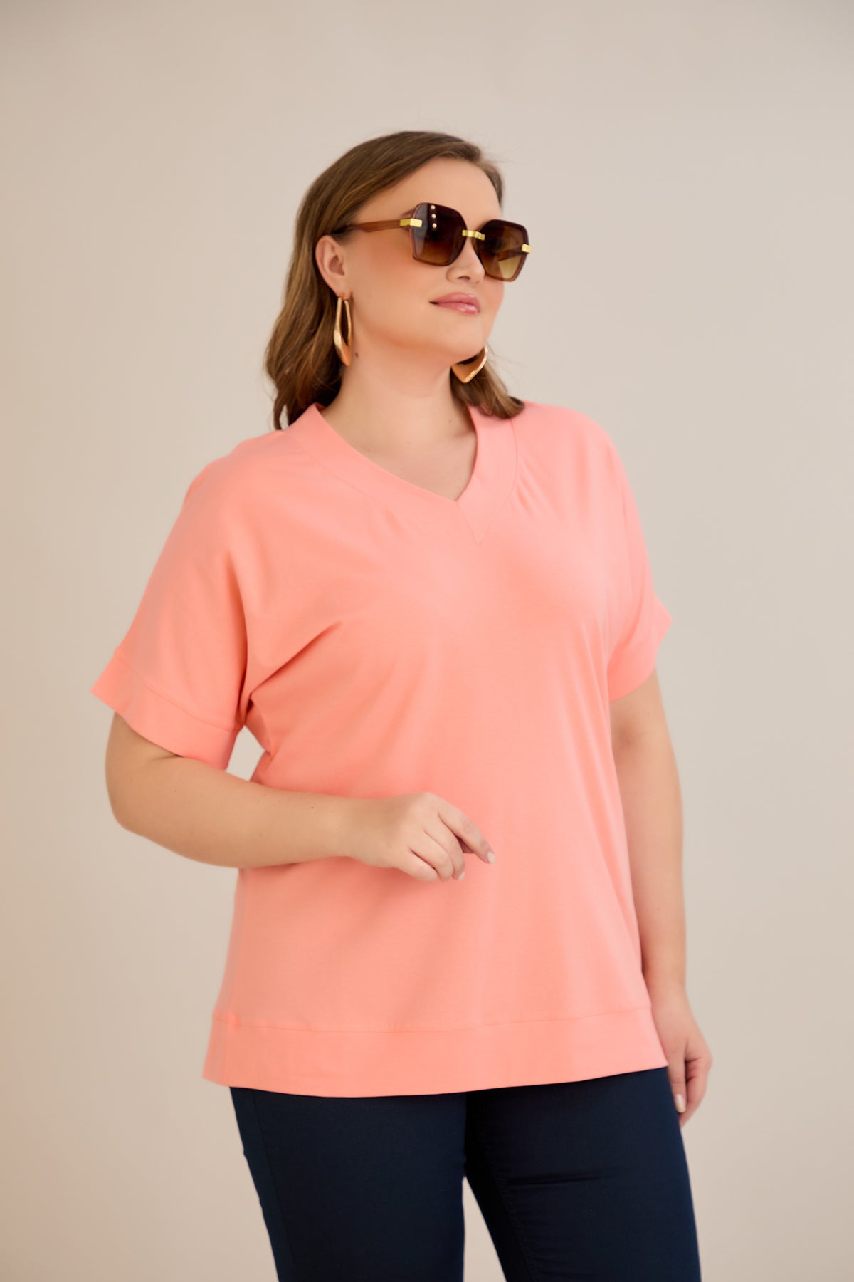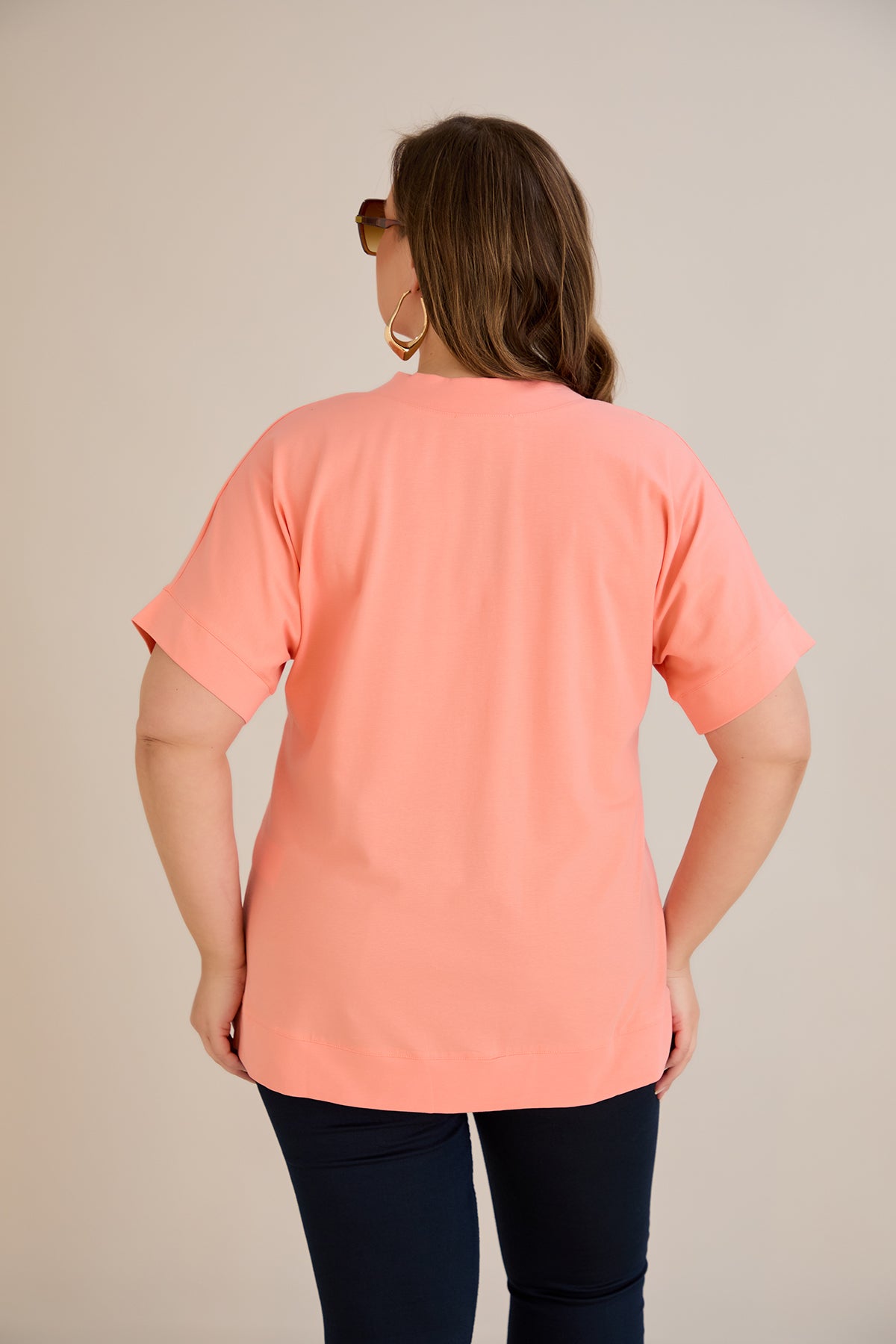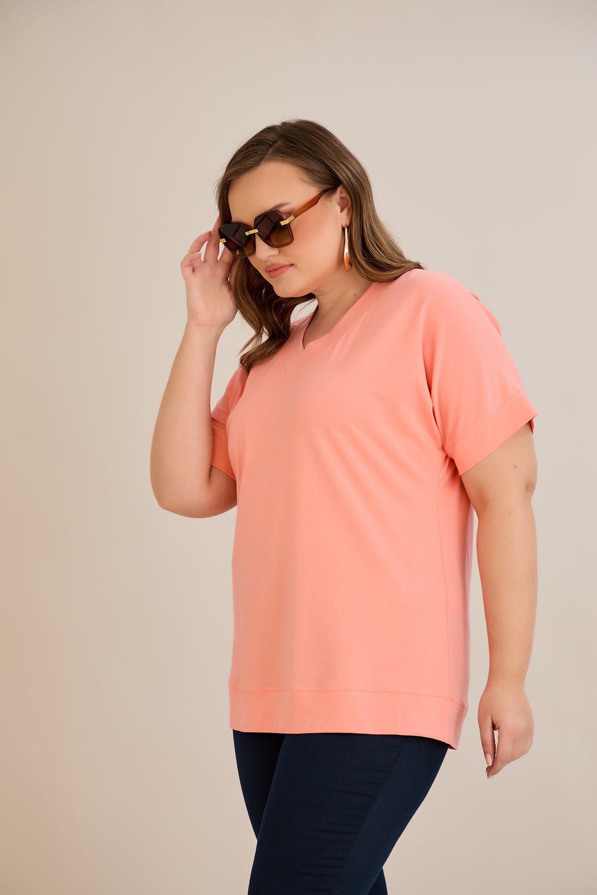 Βαμβακερό μπλουζάκι με V λαιμόκοψη - Ροδακινί