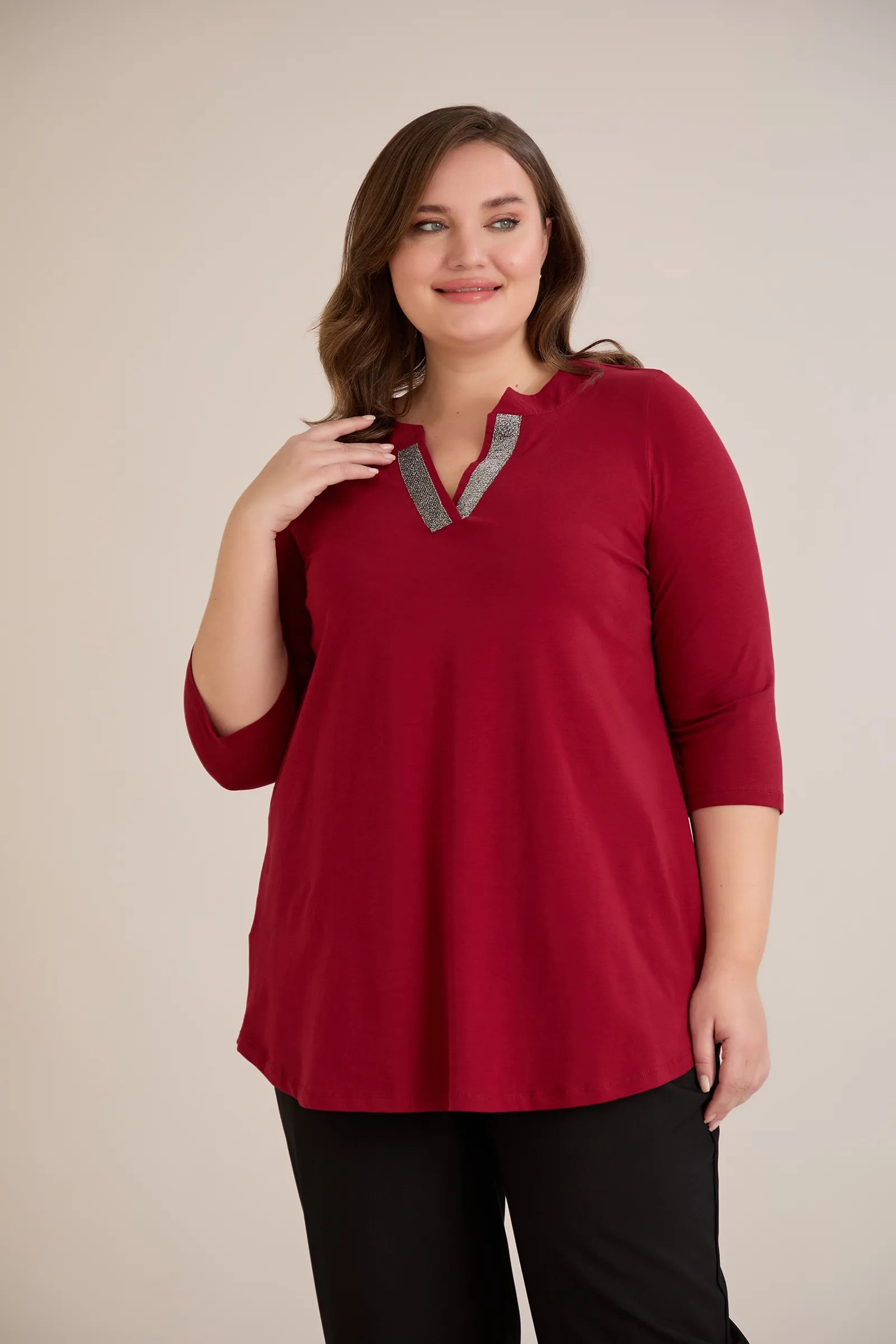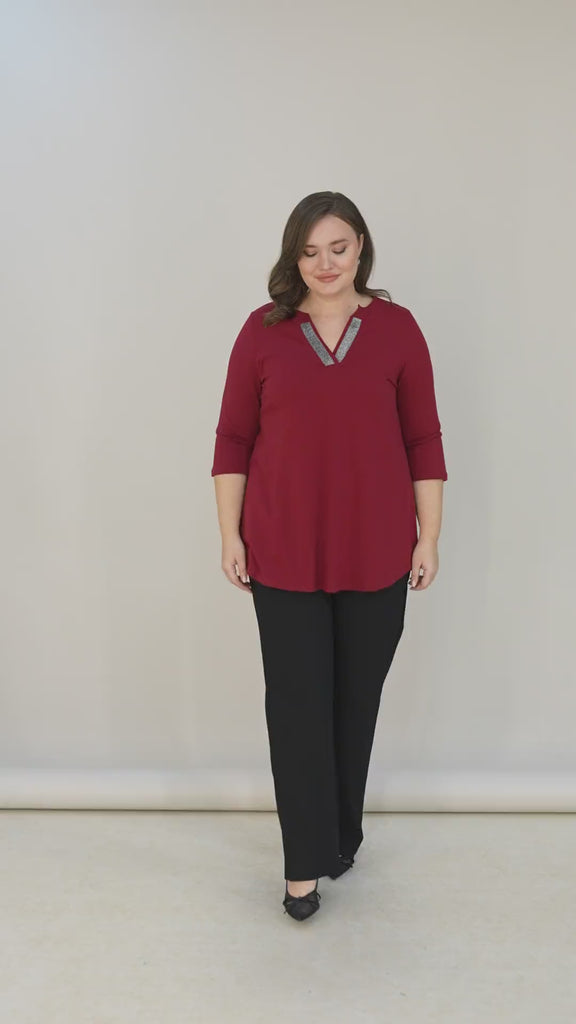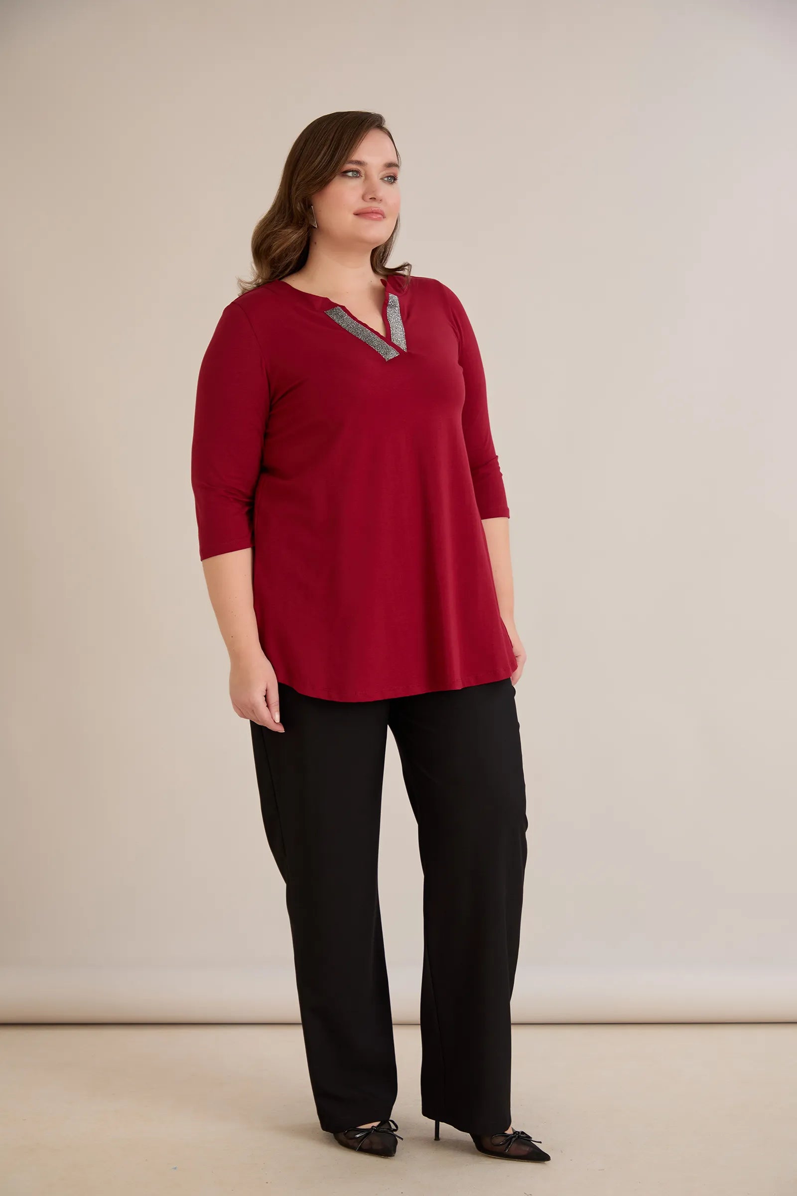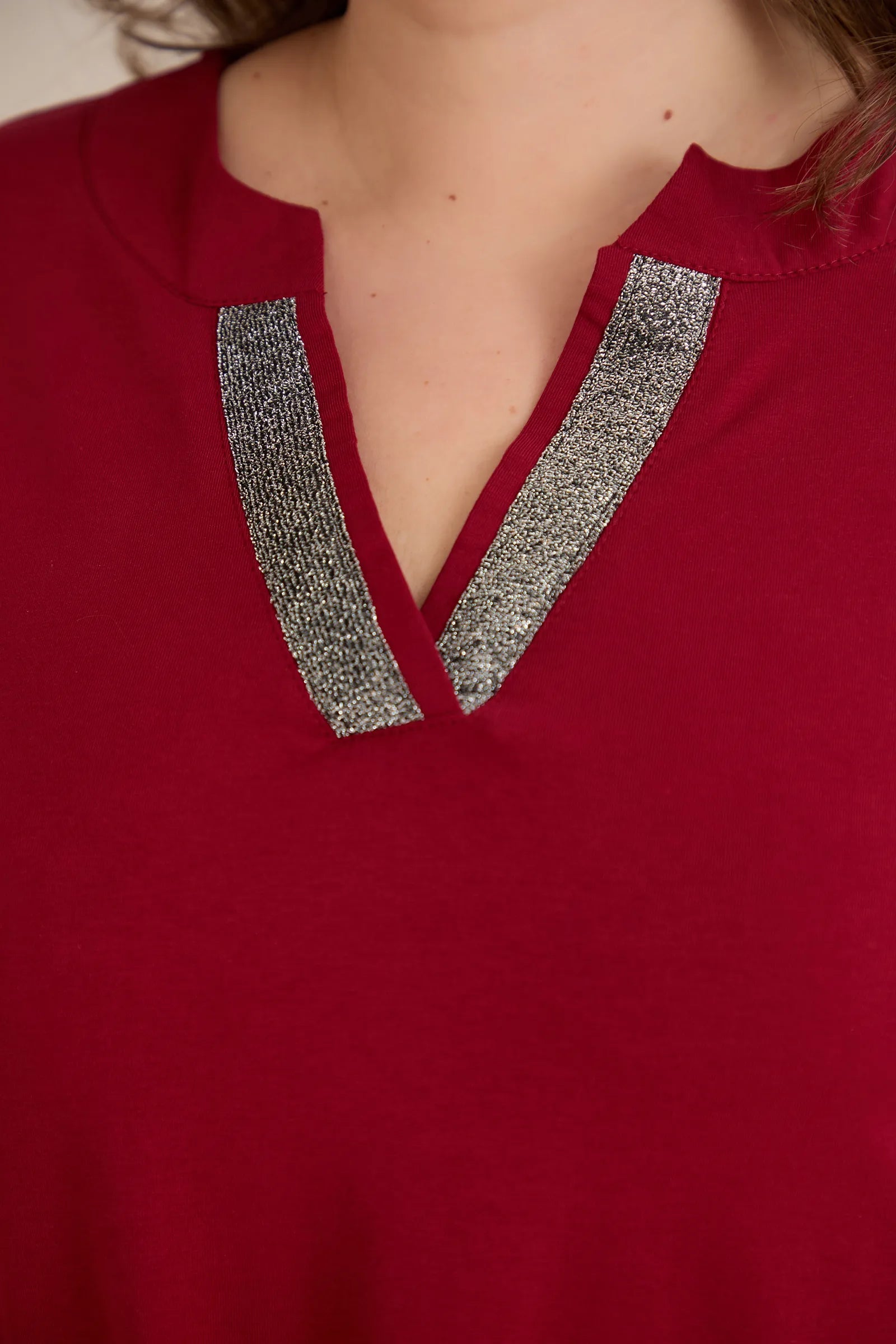 Βαμβακερό τουνίκ με λαμπερό ντεκολτέ σε Μπορντό χρώμα σε μεγάλα μεγέθη.
