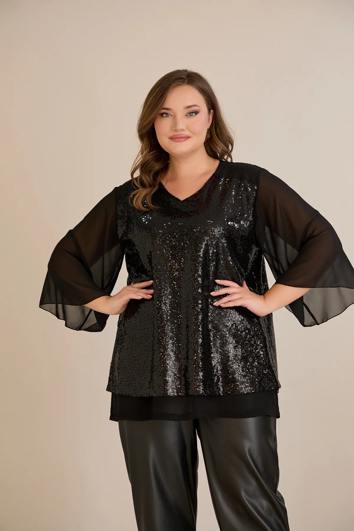 Γυναικείο μακρυμάνικο τουνίκ με ασημί λεπτομέρειες σε μεγάλα μεγέθη- Μαύρο/Ασημί