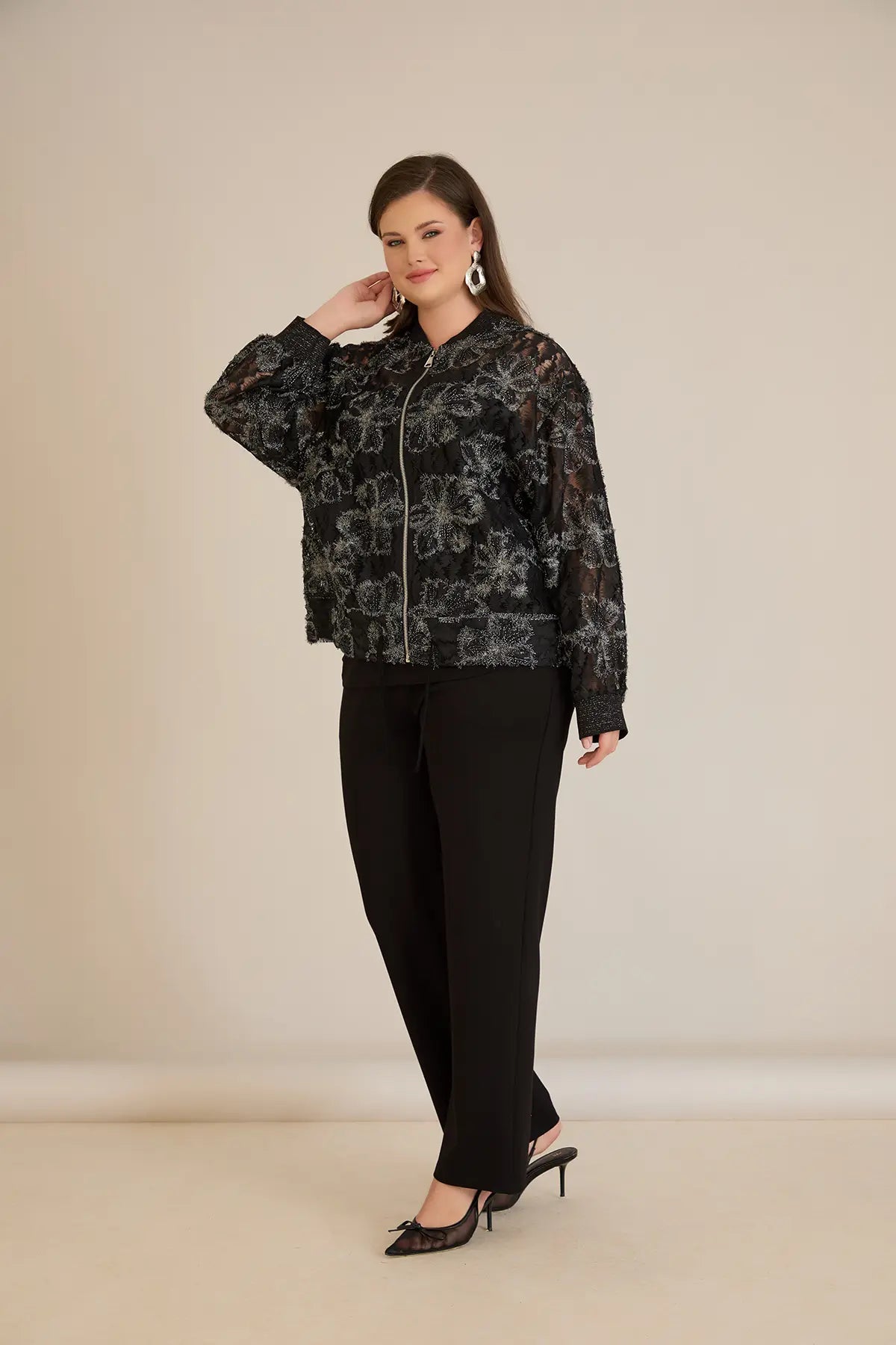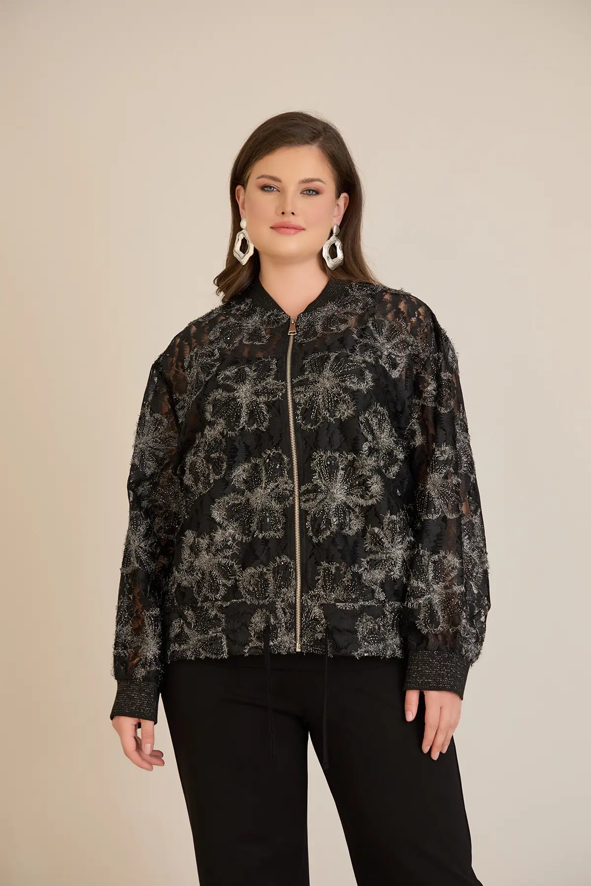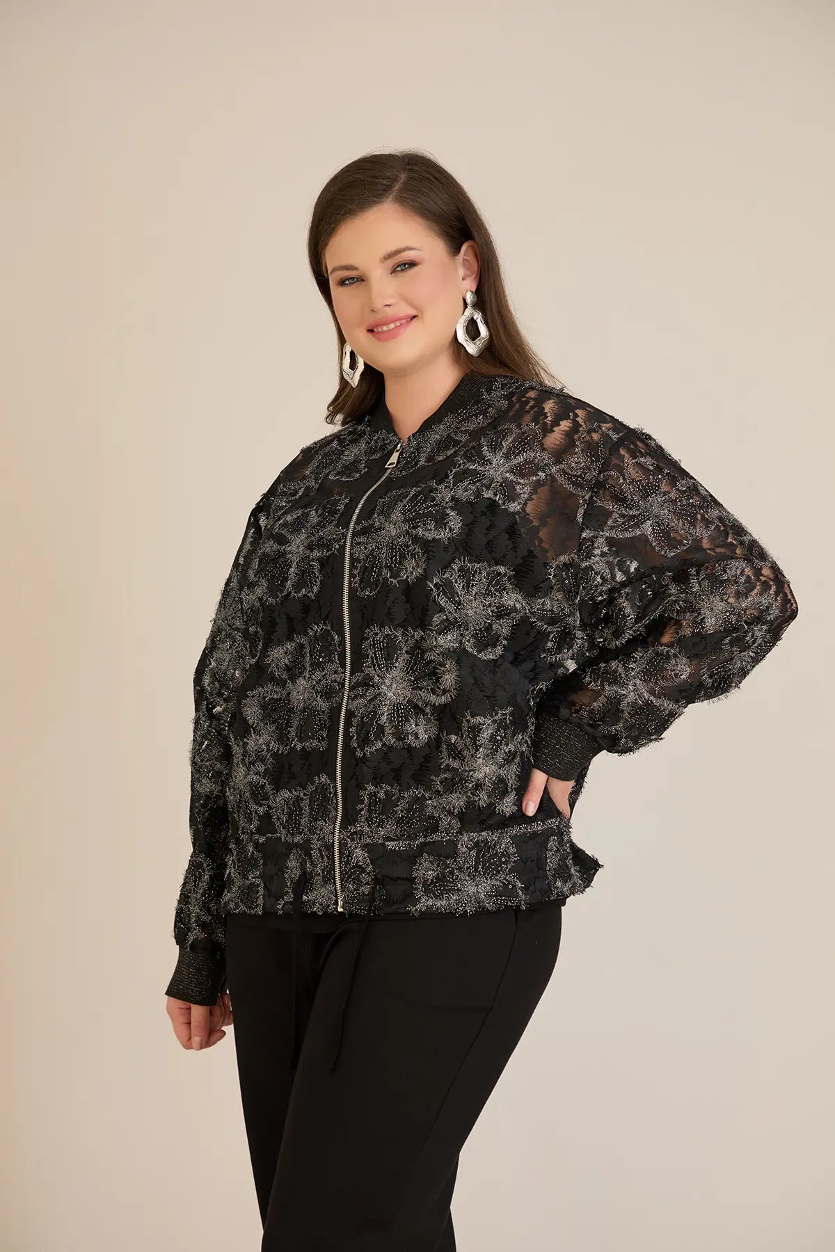Στυλάτο και εντυπωσιακό μπουφάν με μαύρη βάση και διακριτικά φλοράλ σχέδια με μεταλλικές λεπτομέρειες και παγιέτες.Ένας συνδυασμός εκλεπτυσμένης κομψότητας και μοντέρνου στυλ – απαραίτητο κομμάτι για βραδινές εξόδους ή ειδικές περιστάσεις.