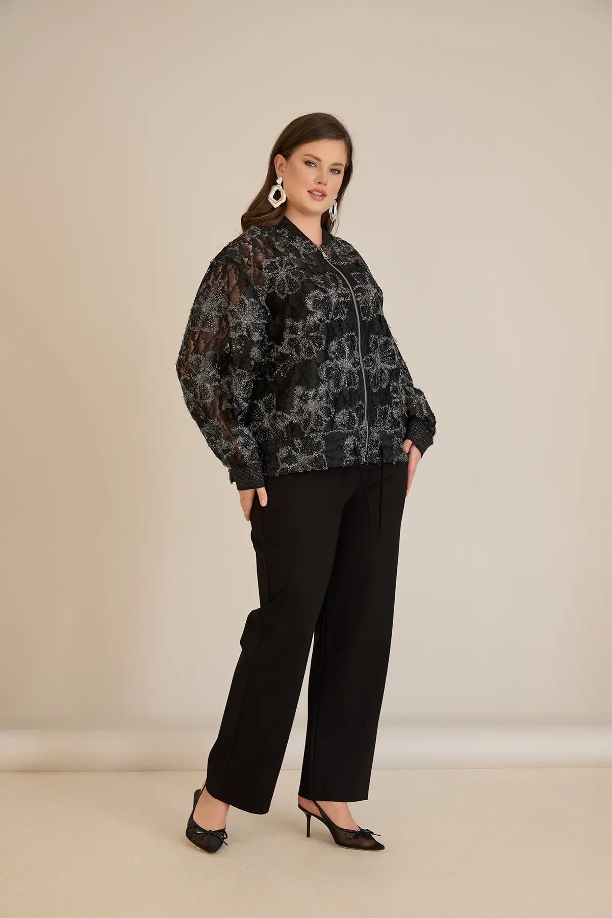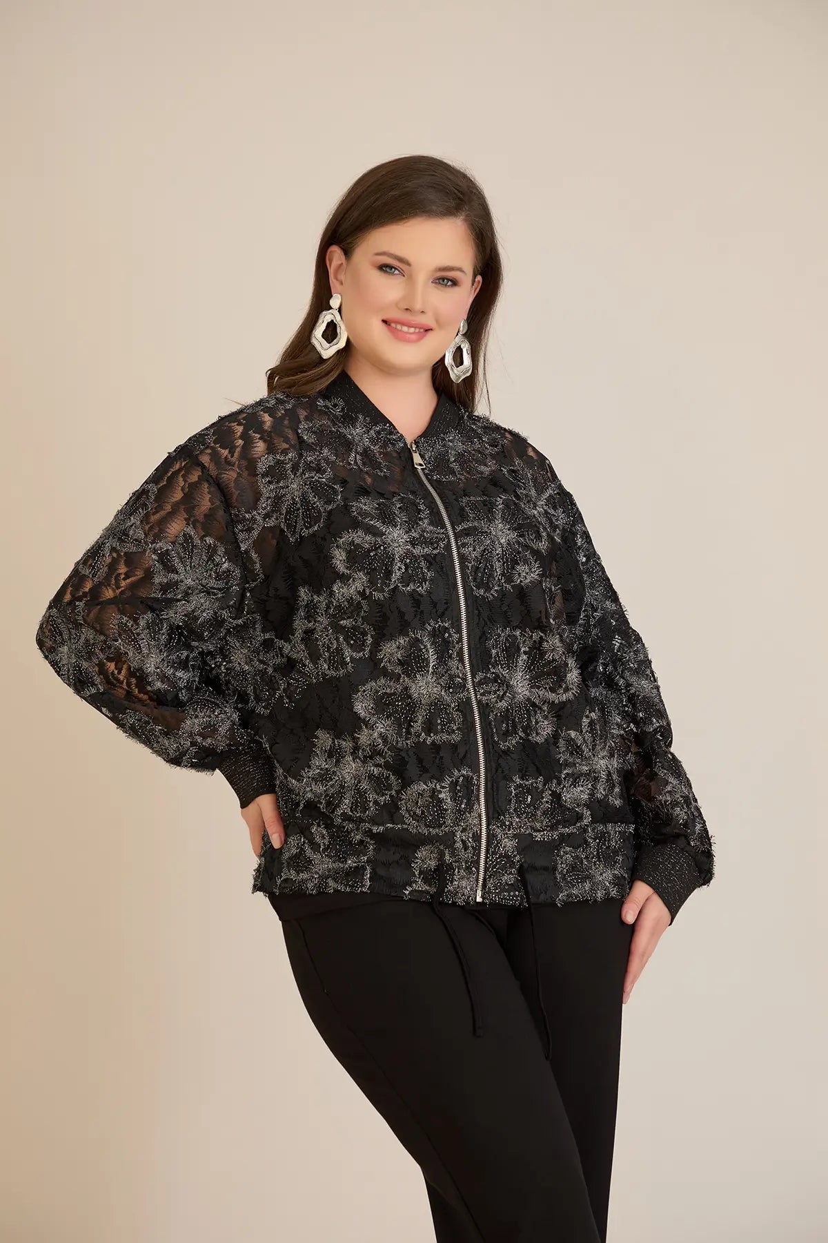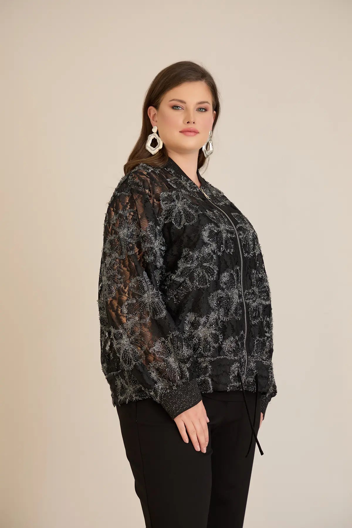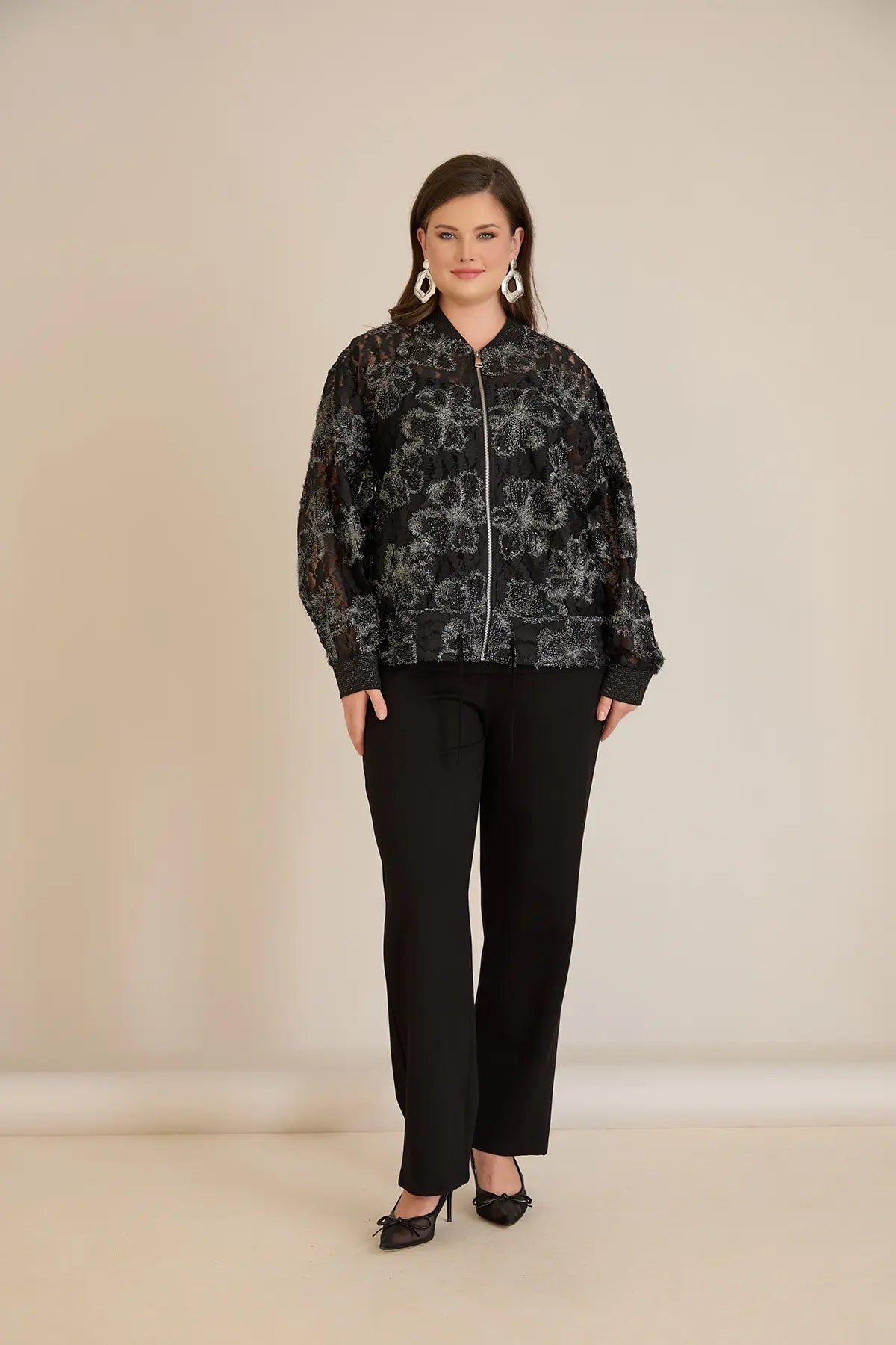 Στυλάτο και εντυπωσιακό μπουφάν με μαύρη βάση και διακριτικά φλοράλ σχέδια με μεταλλικές λεπτομέρειες και παγιέτες.Ένας συνδυασμός εκλεπτυσμένης κομψότητας και μοντέρνου στυλ – απαραίτητο κομμάτι για βραδινές εξόδους ή ειδικές περιστάσεις.