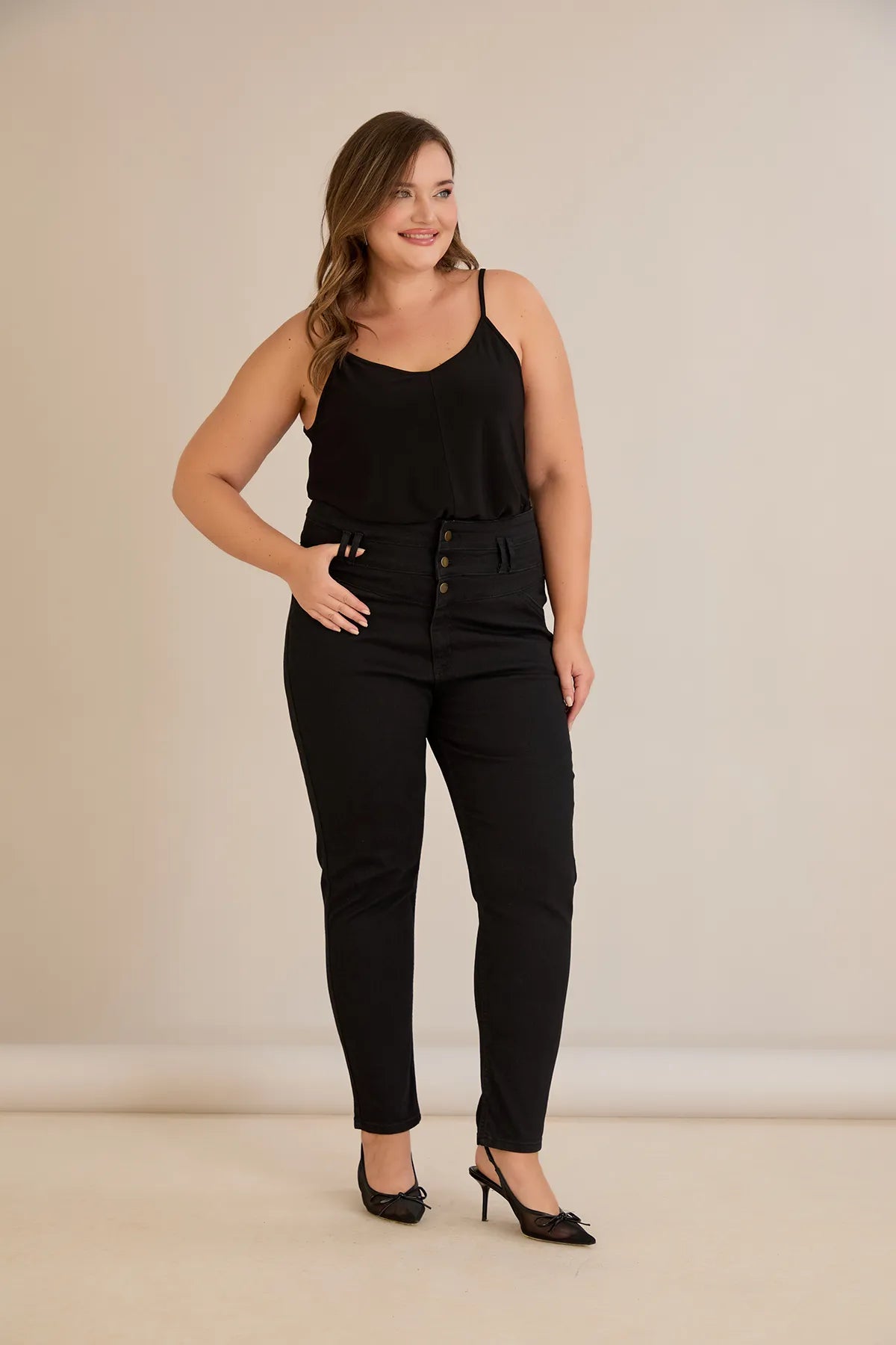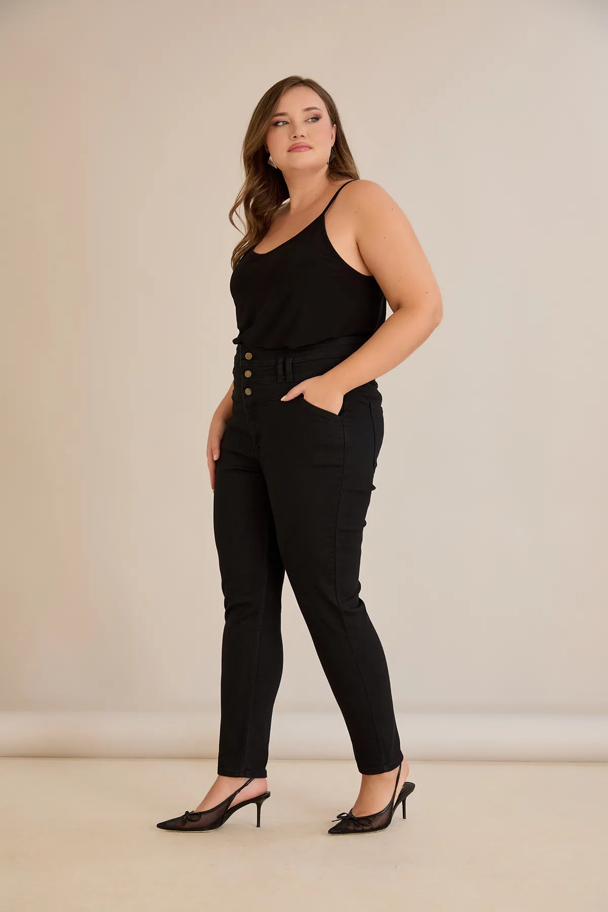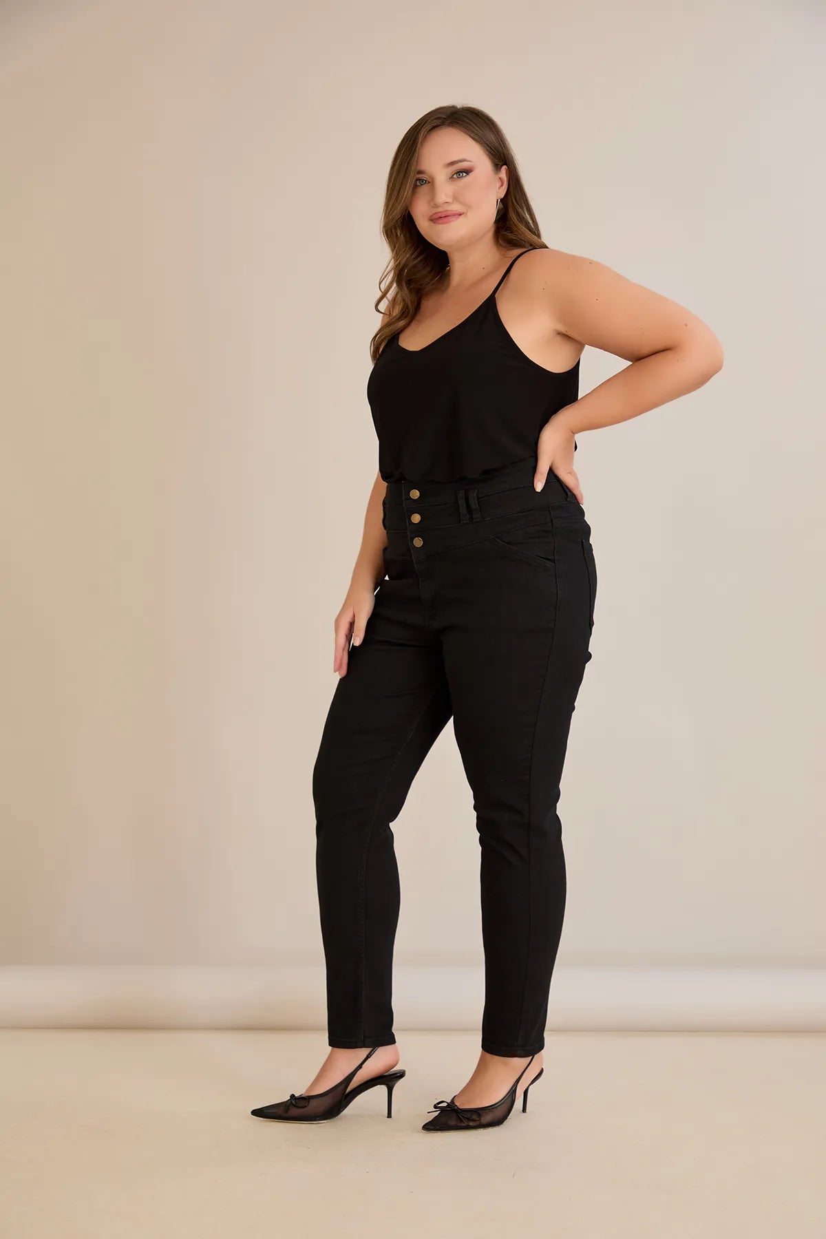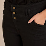 Ψηλόμεσο ελαστικό τζιν και κουμπιά σε μαύρο χρώμα σε μεγάλα μεγέθη