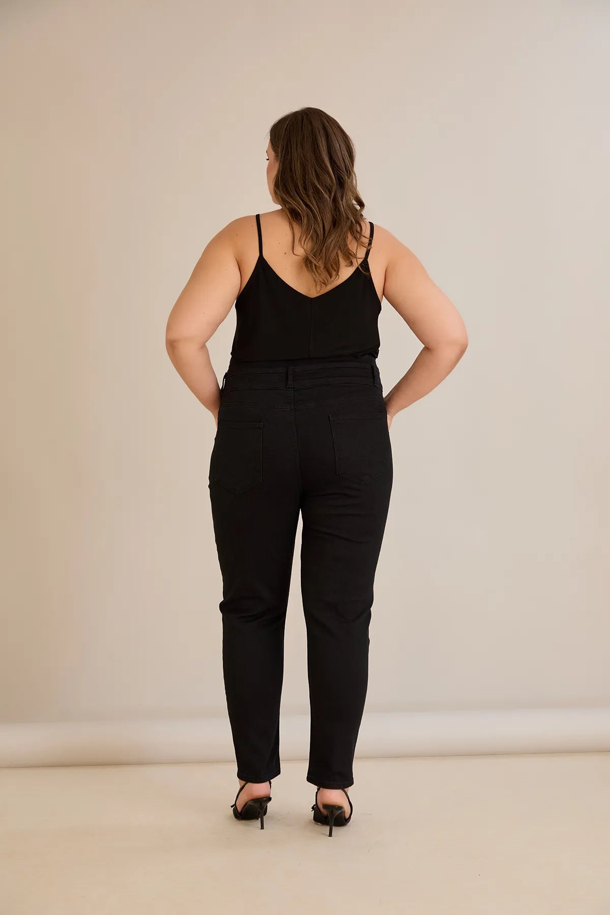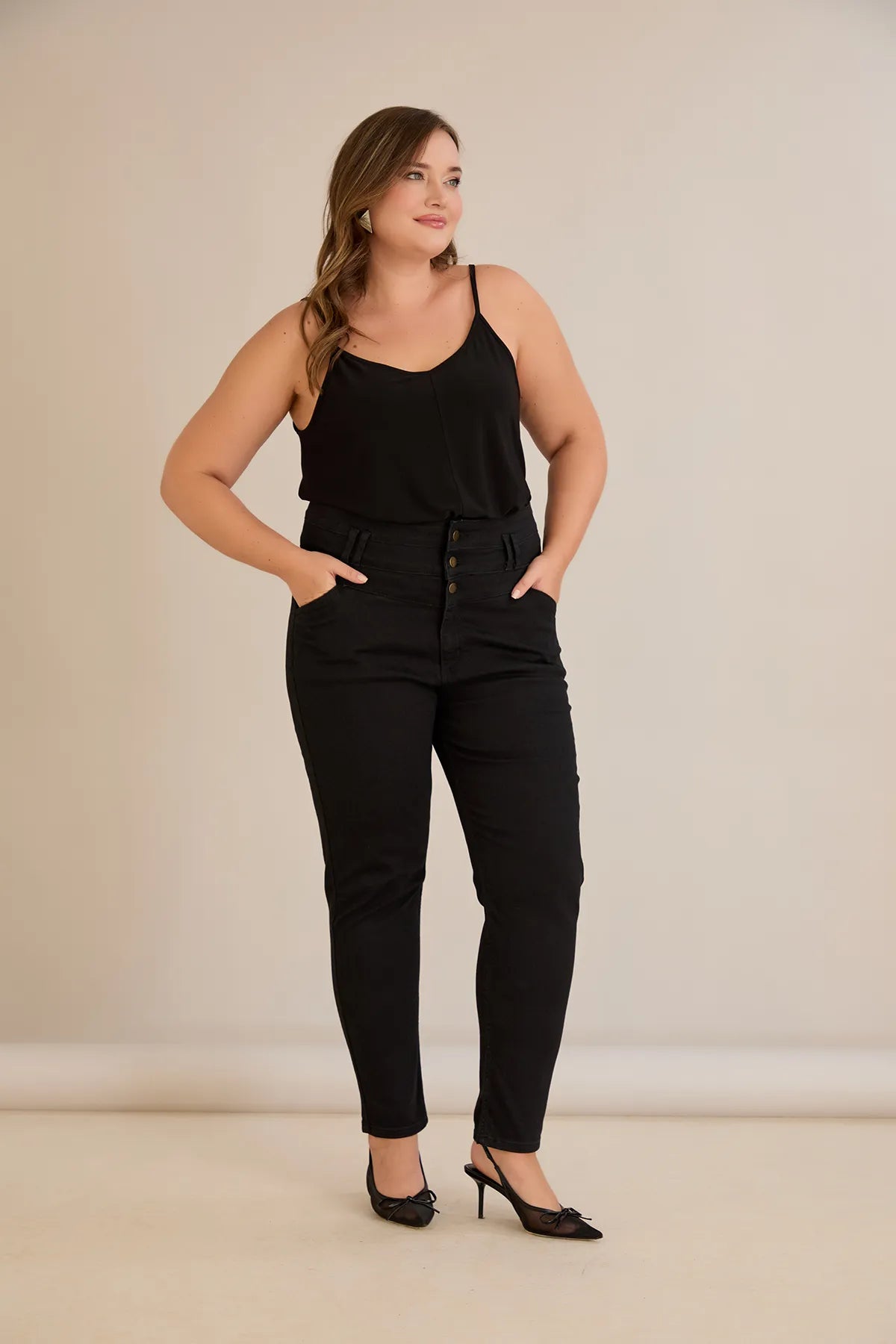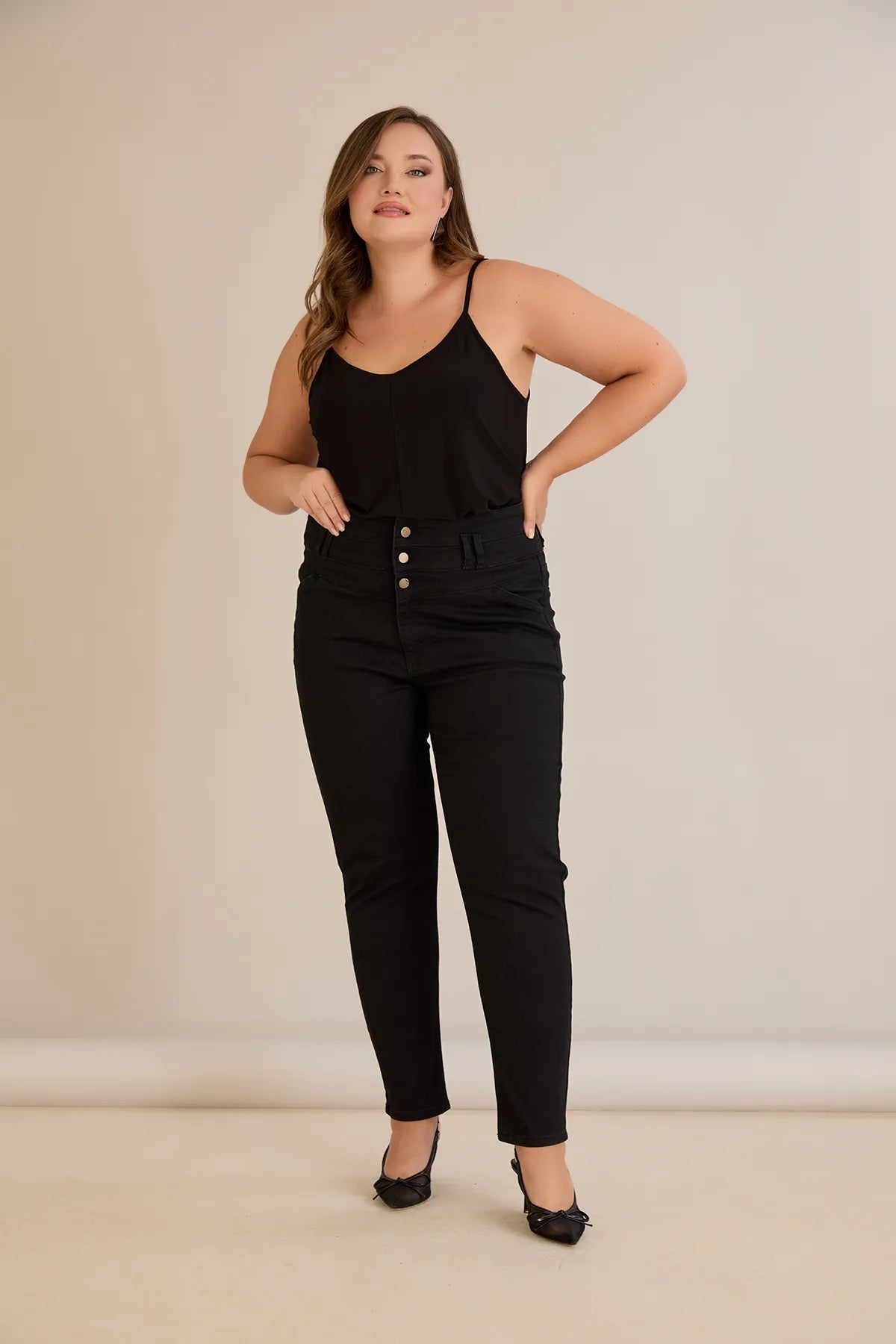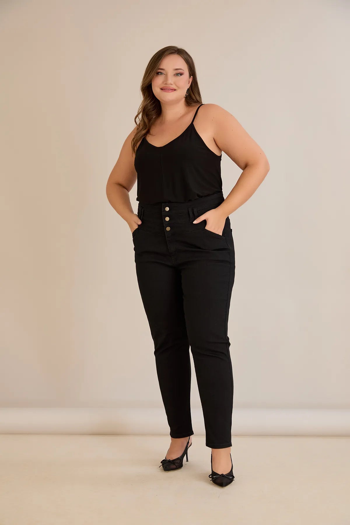Ψηλόμεσο ελαστικό τζιν και κουμπιά σε μαύρο χρώμα σε μεγάλα μεγέθη