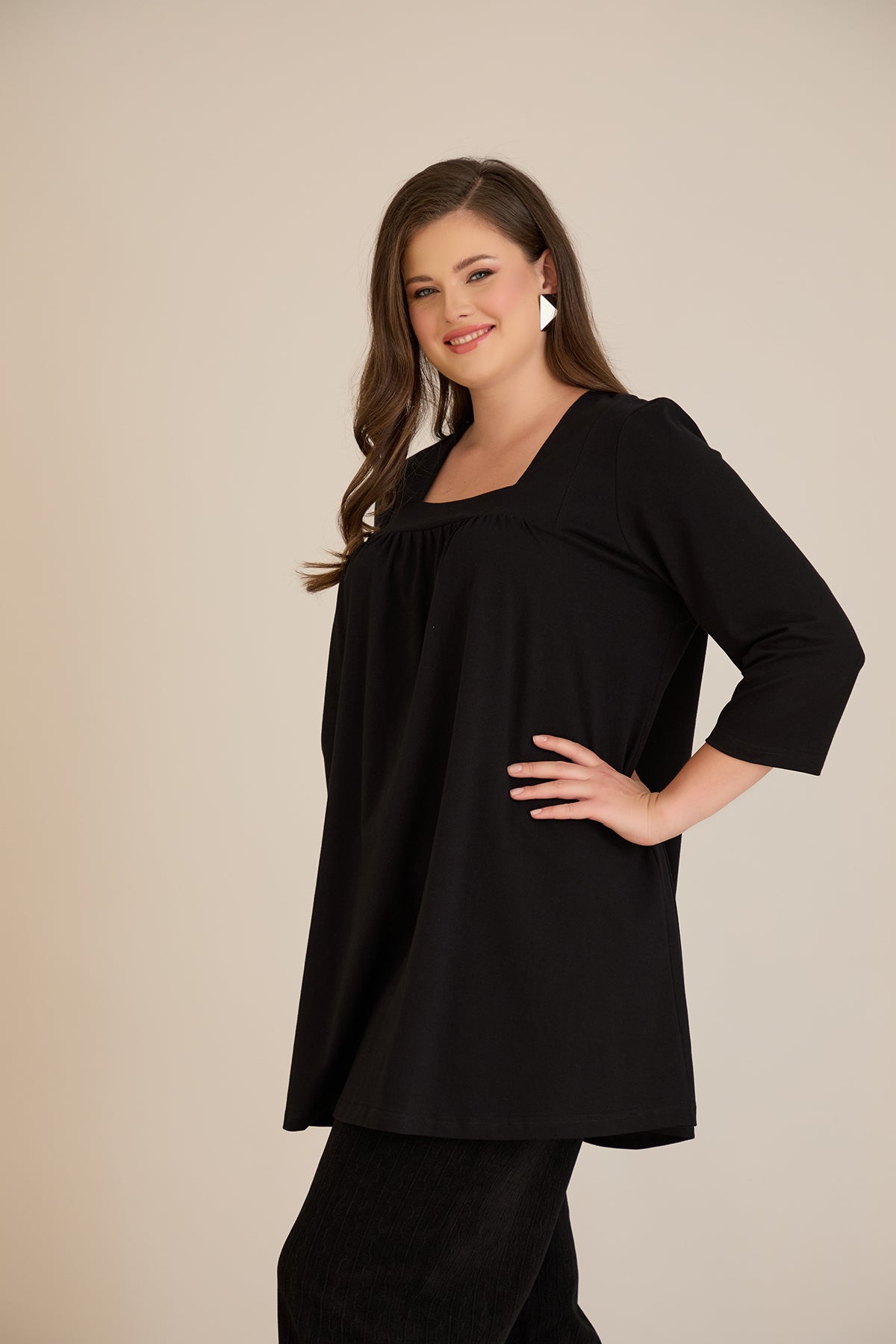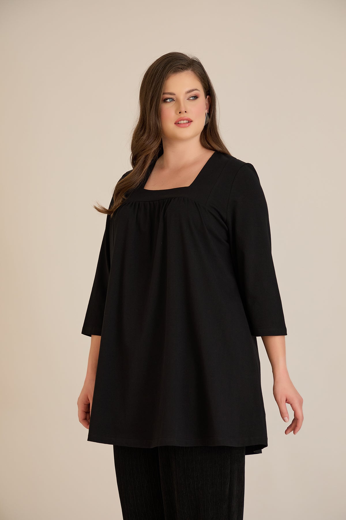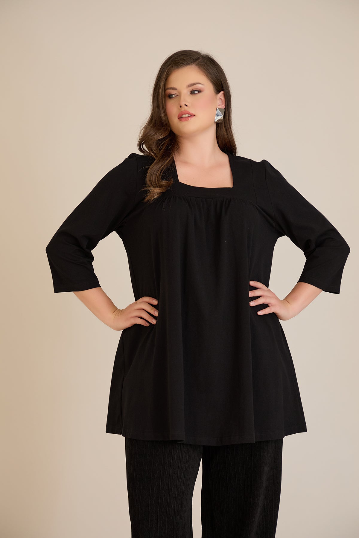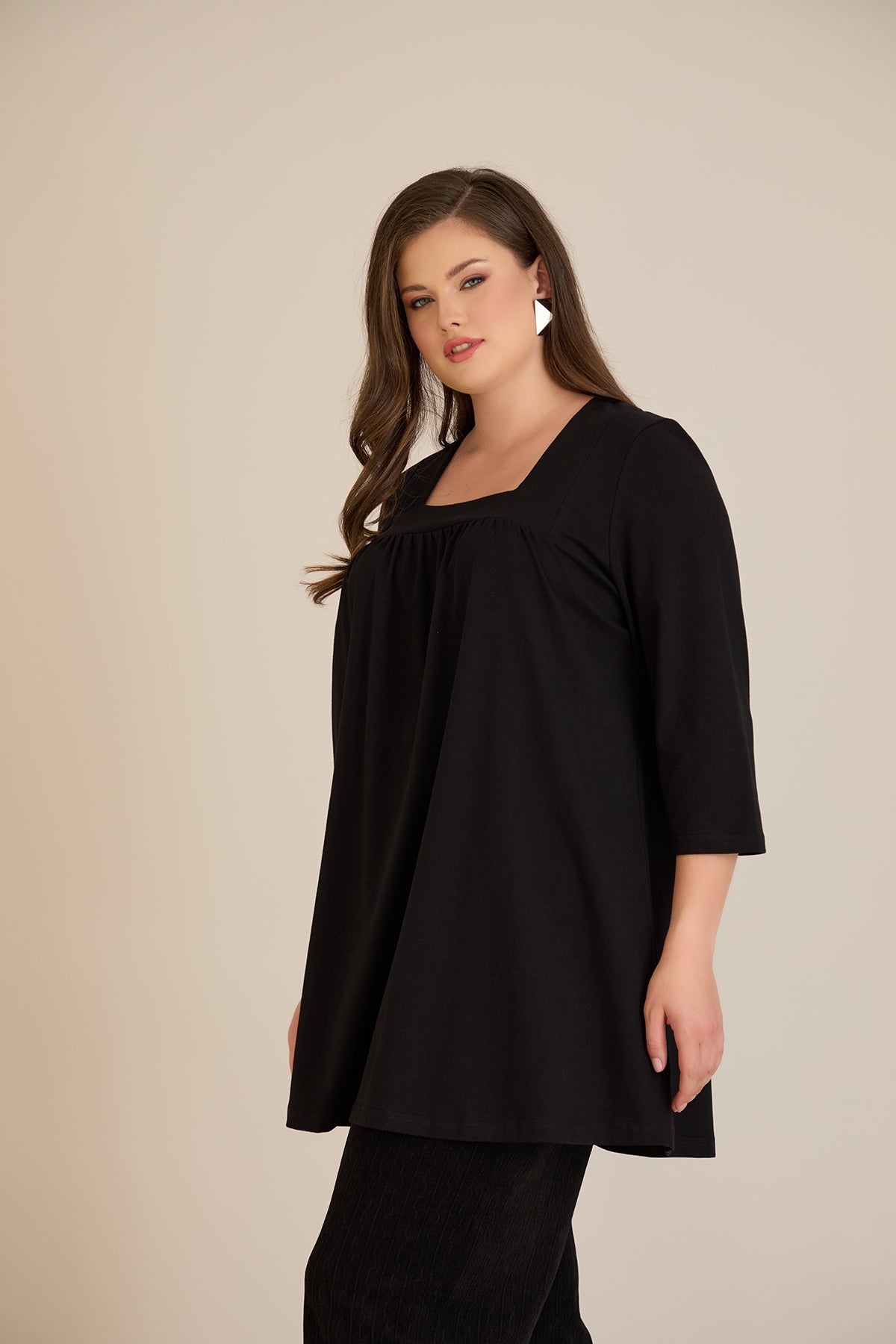 Βαμβακερή τουνίκ με σούρα και τετράγωνο ντεκολτέ σε Μαύρο χρώμα σε μεγάλα μεγέθη