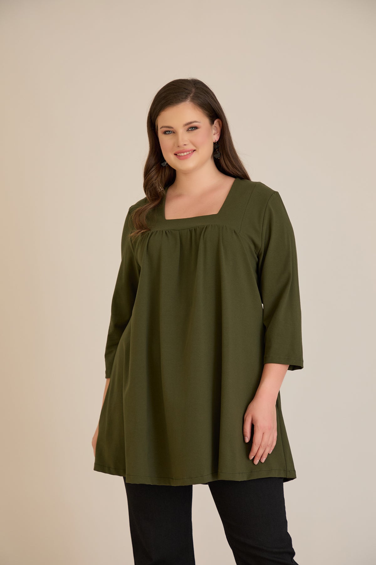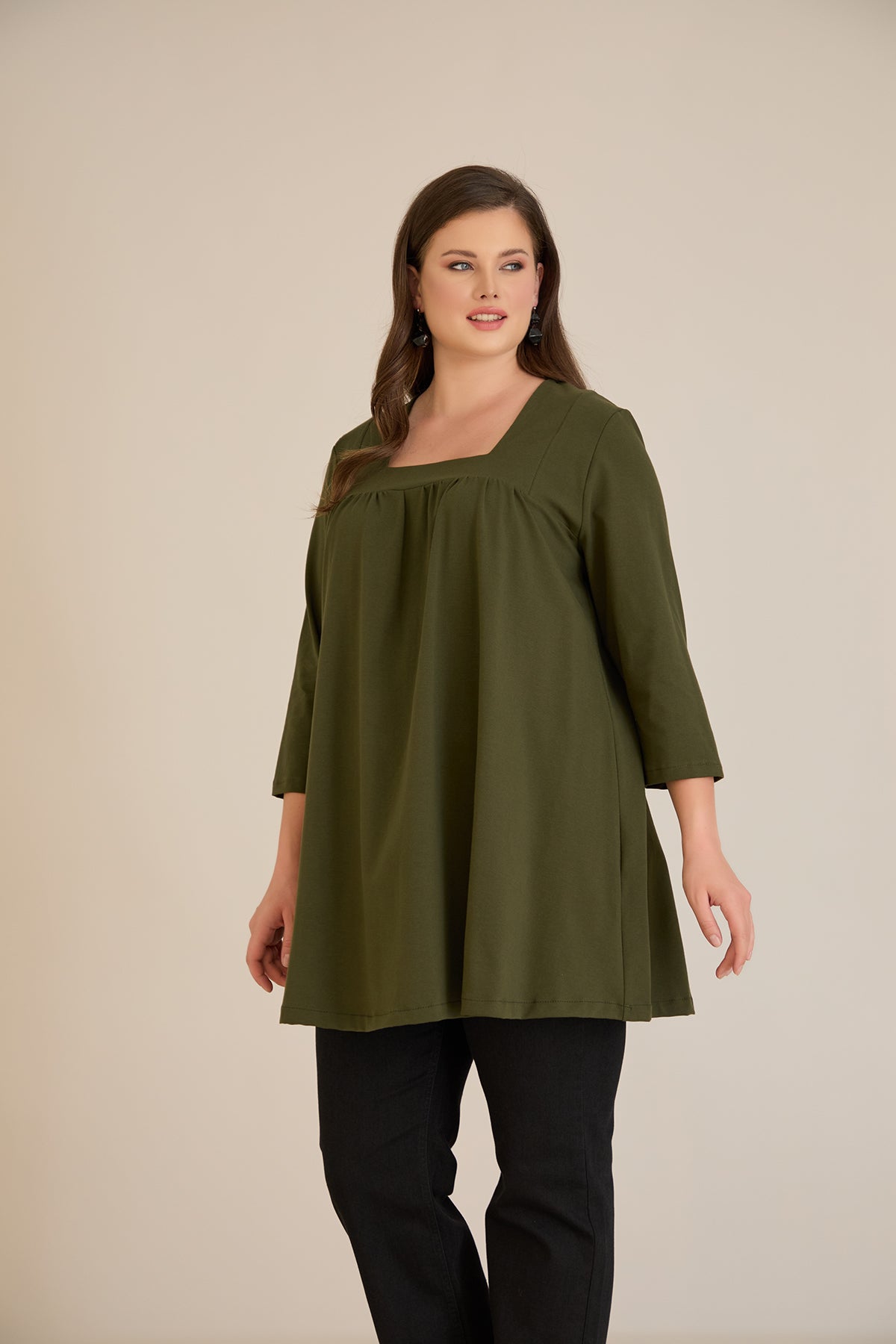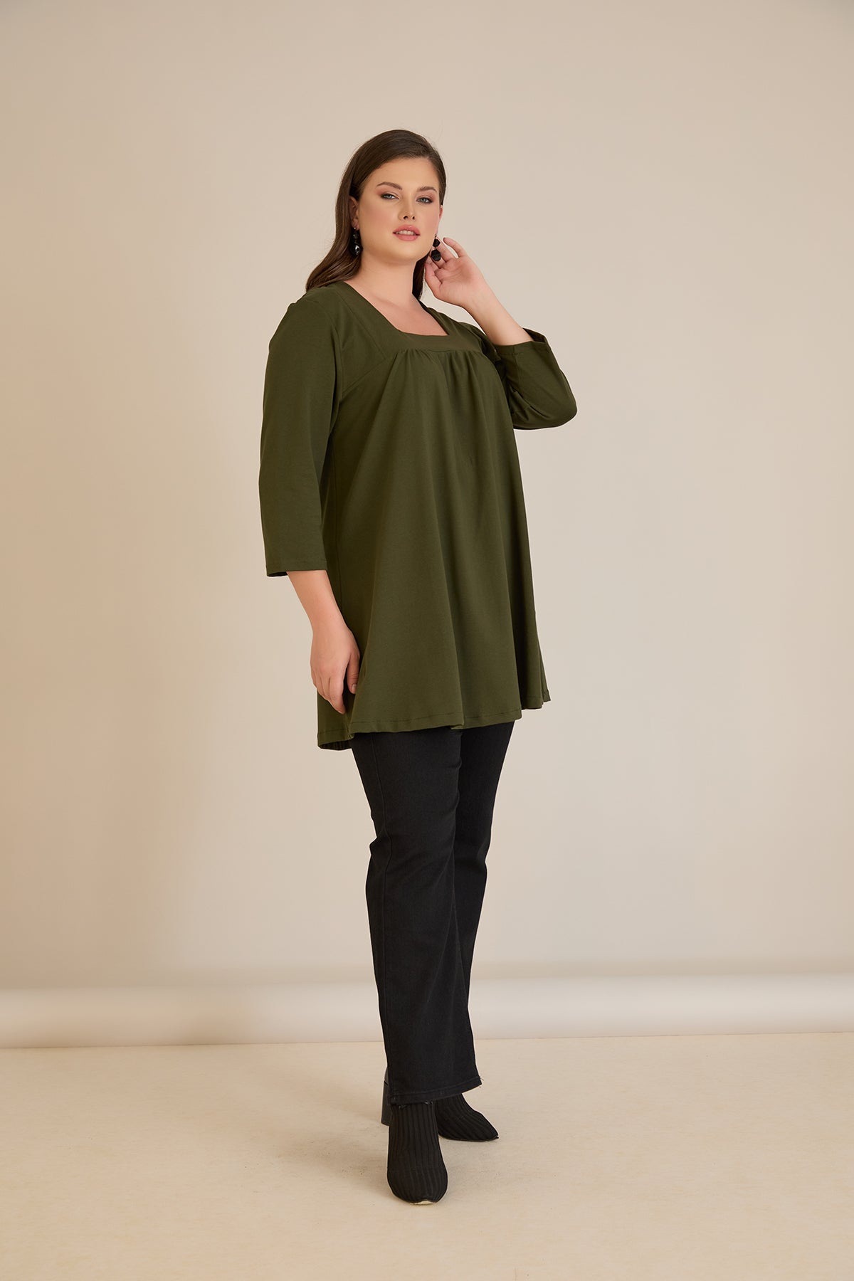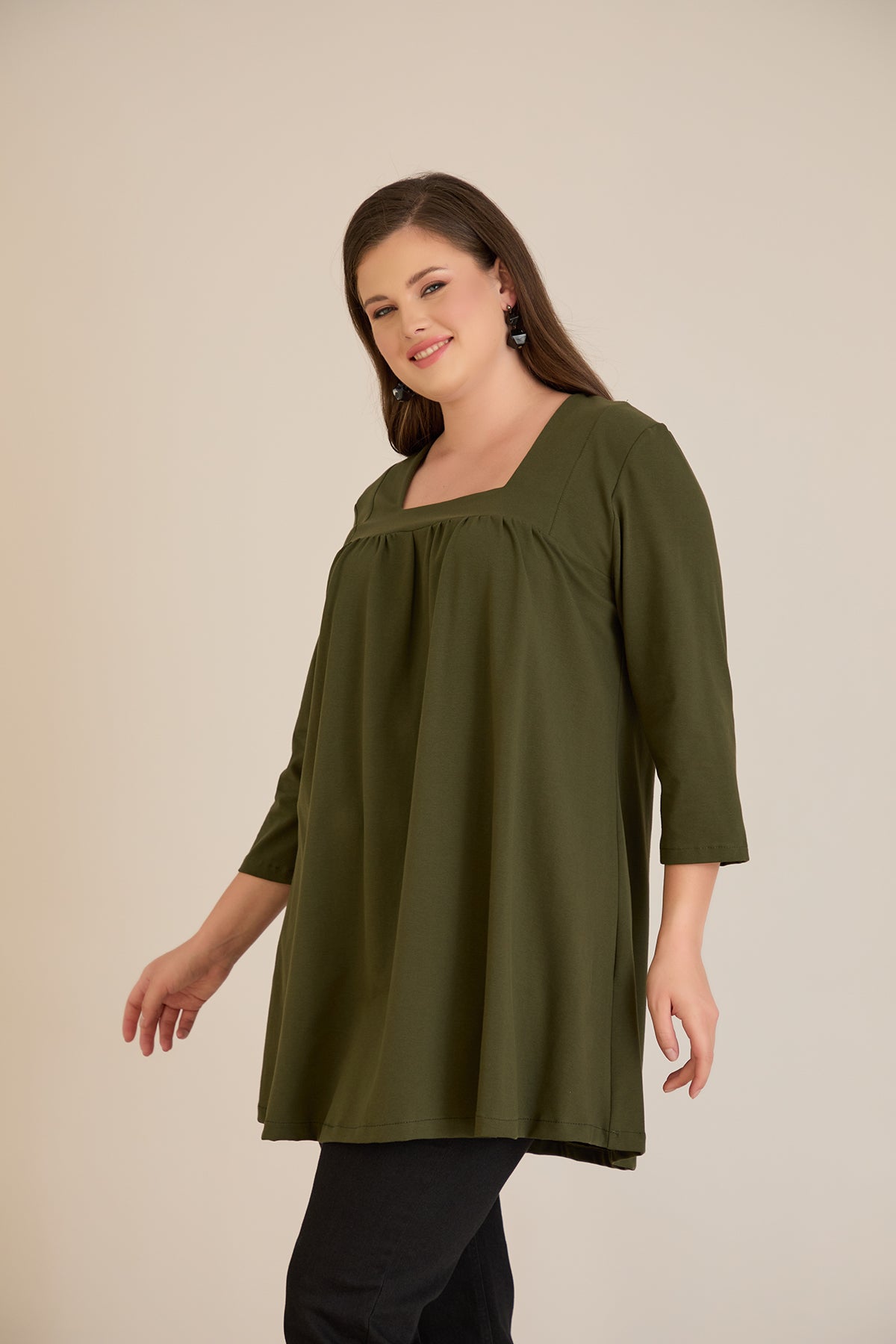 Βαμβακερή τουνίκ με σούρα και τετράγωνο ντεκολτέ σε Χακί χρώμα σε μεγάλα μεγέθη