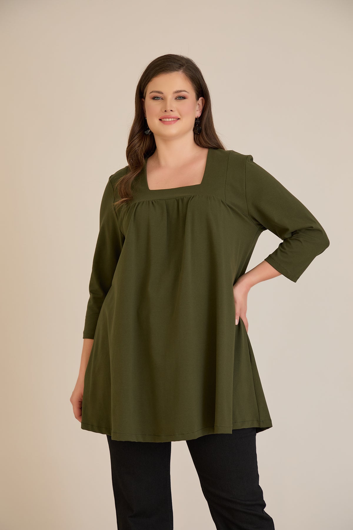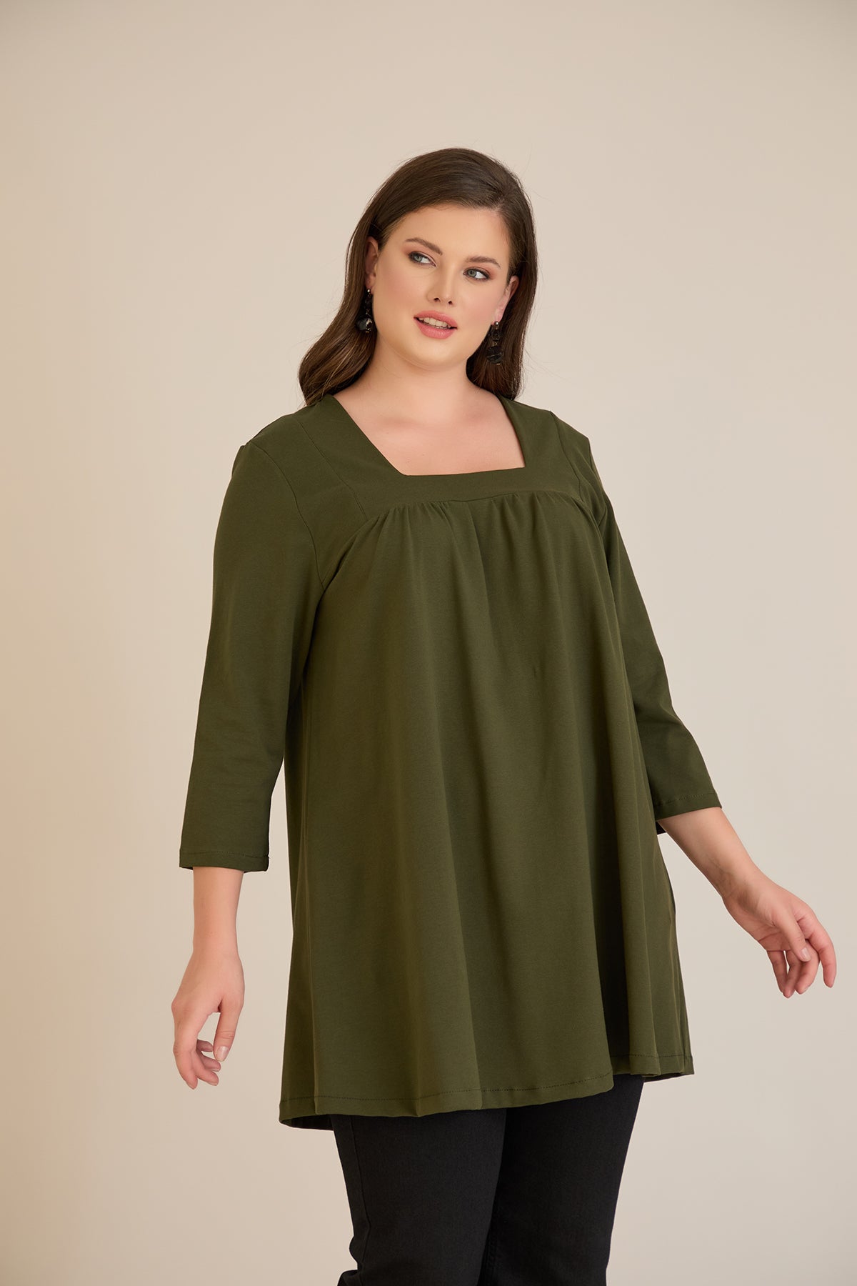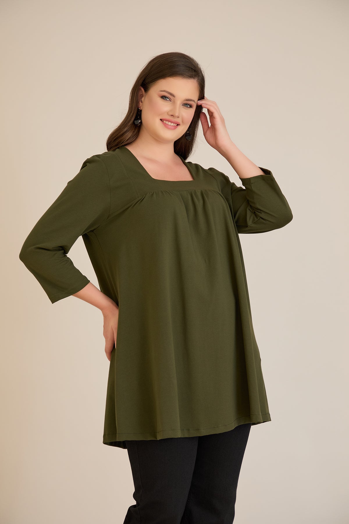 Βαμβακερή τουνίκ με σούρα και τετράγωνο ντεκολτέ σε Χακί χρώμα σε μεγάλα μεγέθη