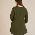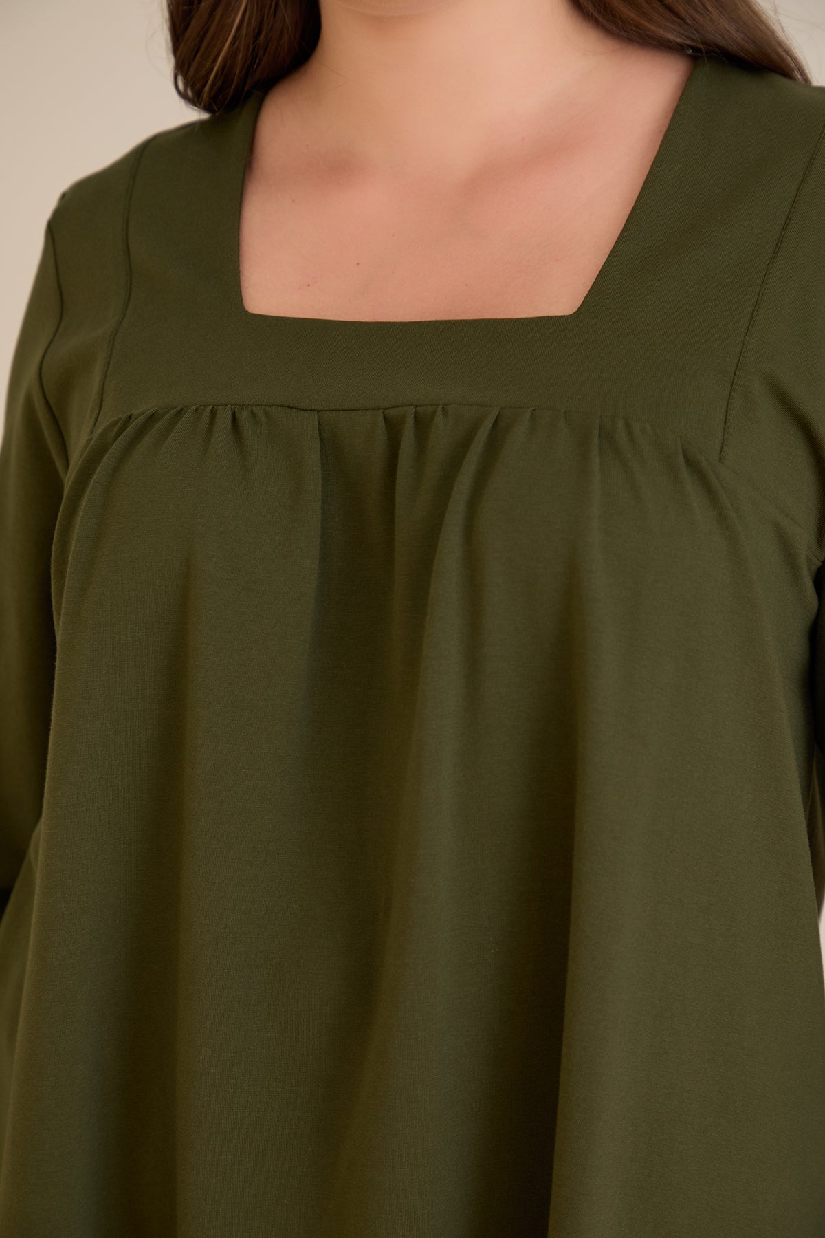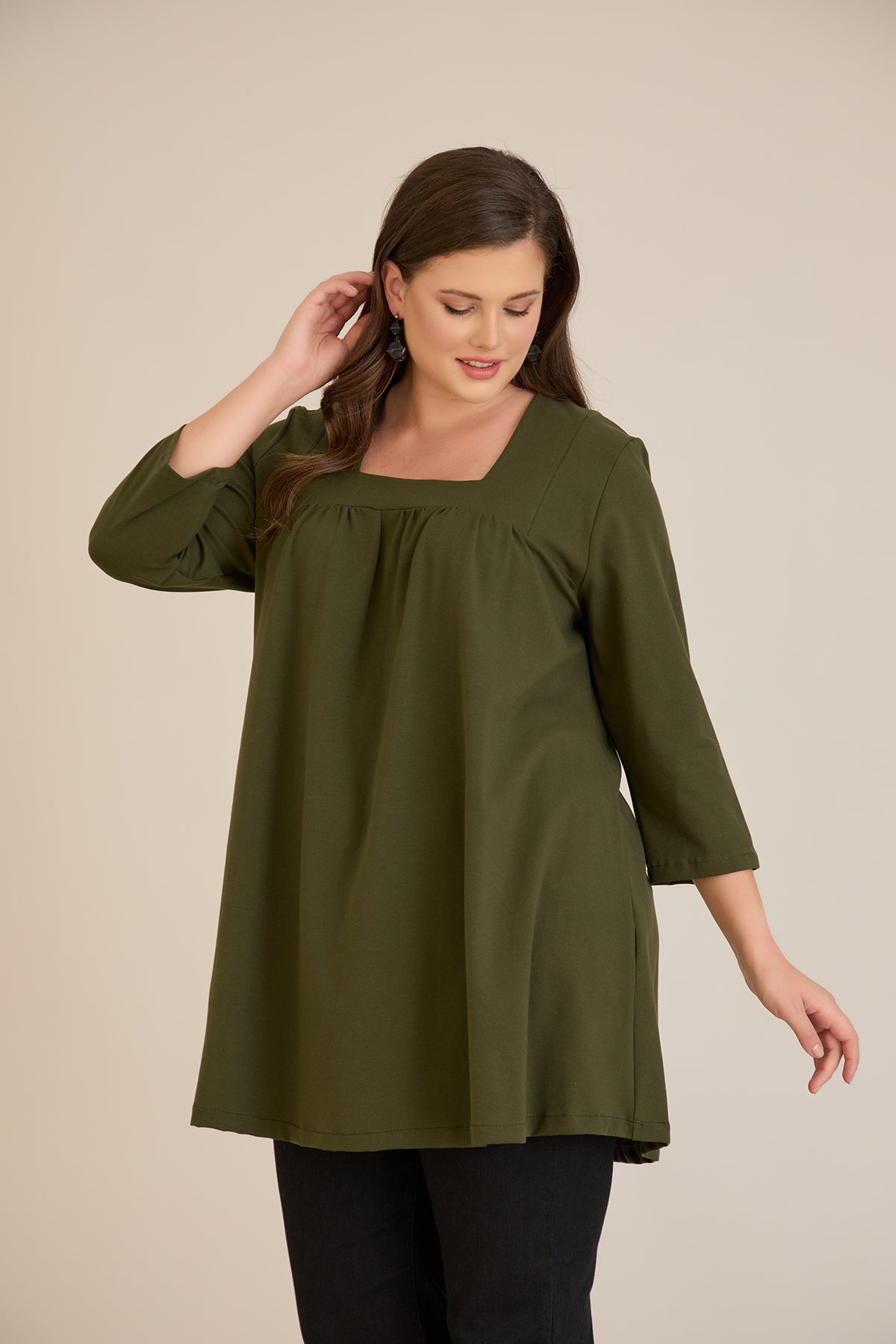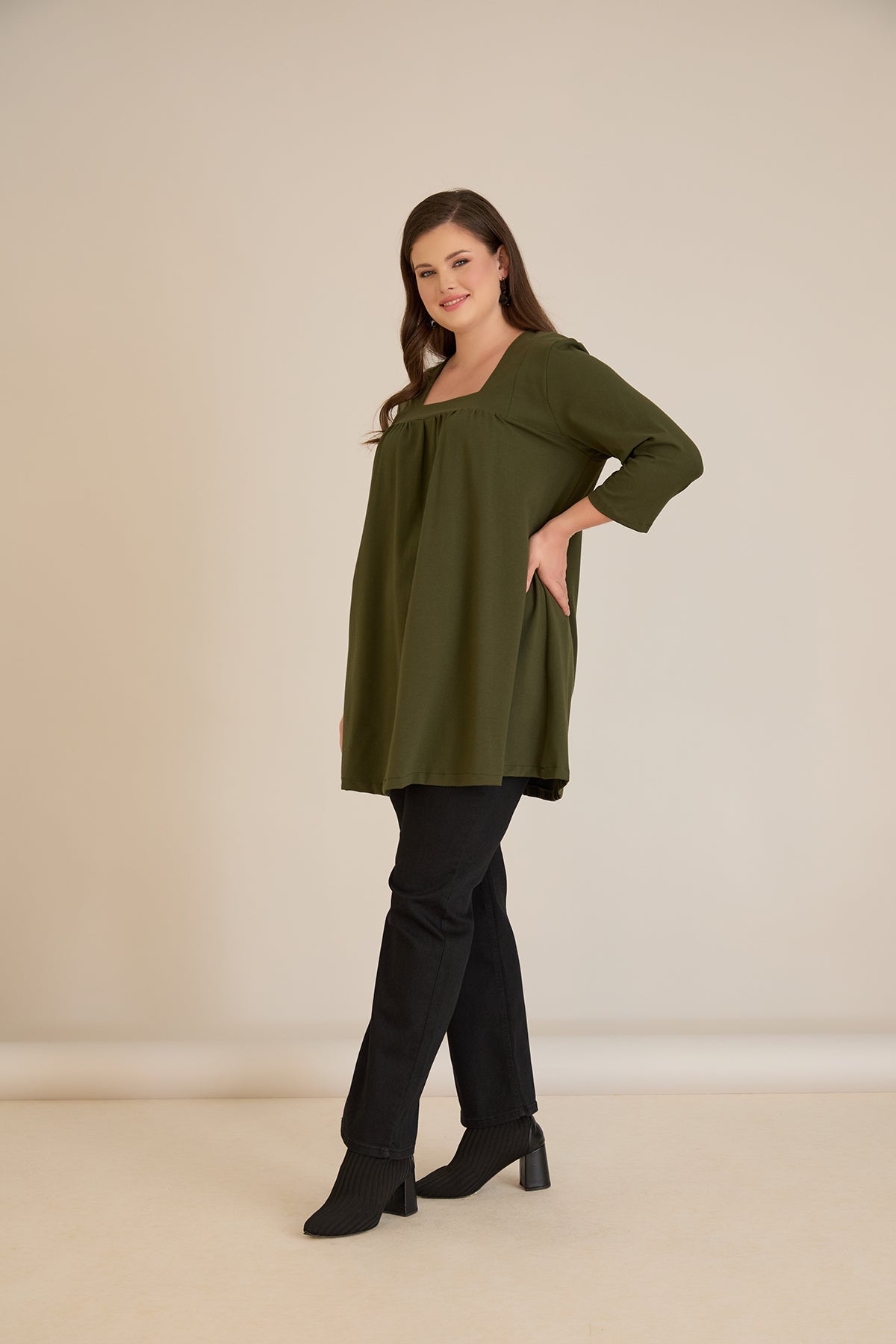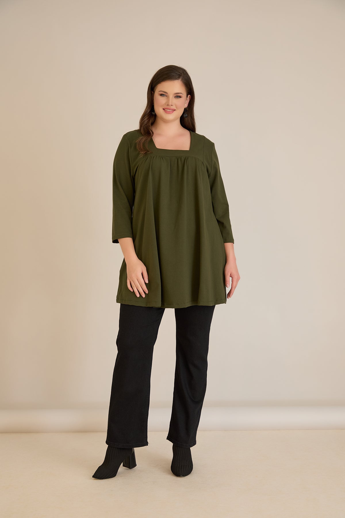 Βαμβακερή τουνίκ με σούρα και τετράγωνο ντεκολτέ σε Χακί χρώμα σε μεγάλα μεγέθη