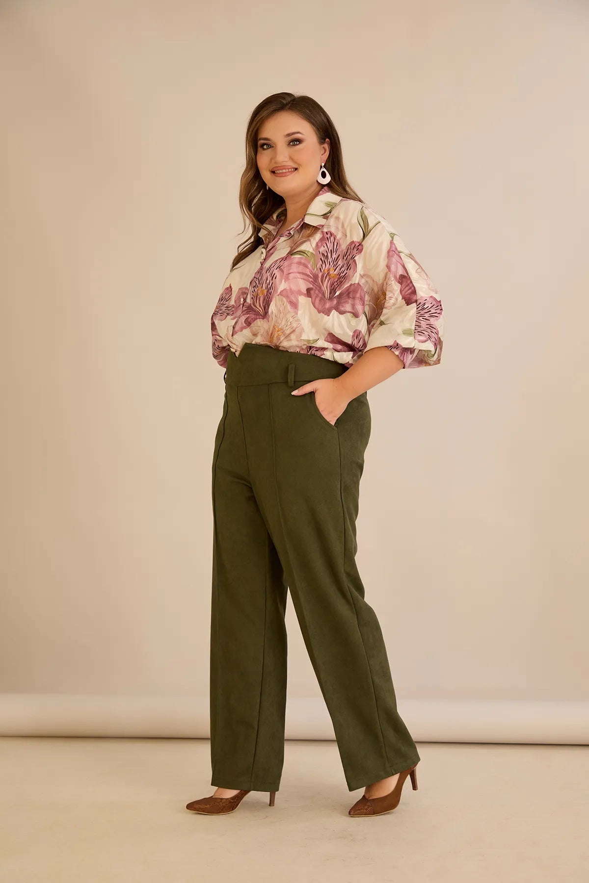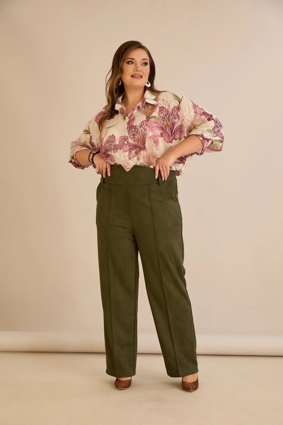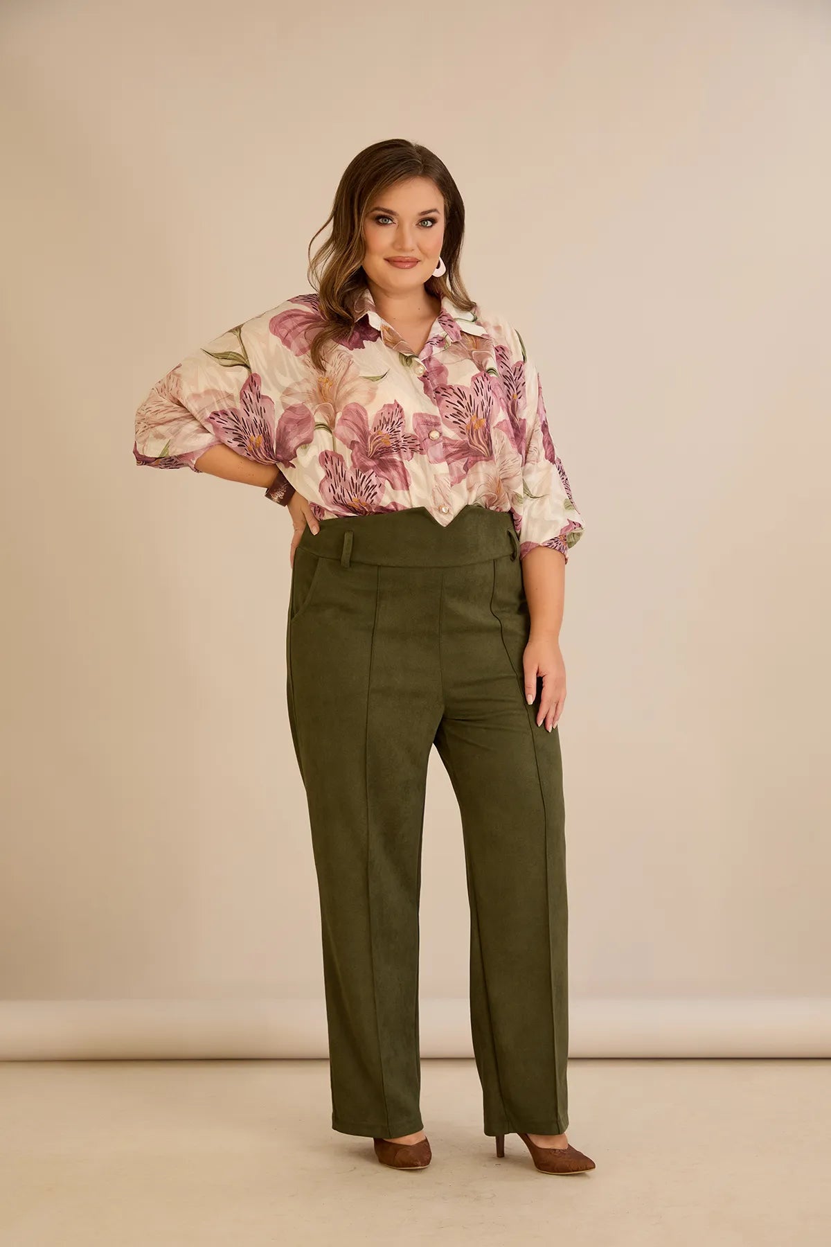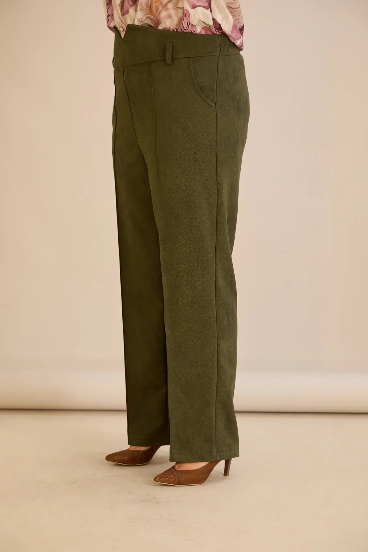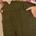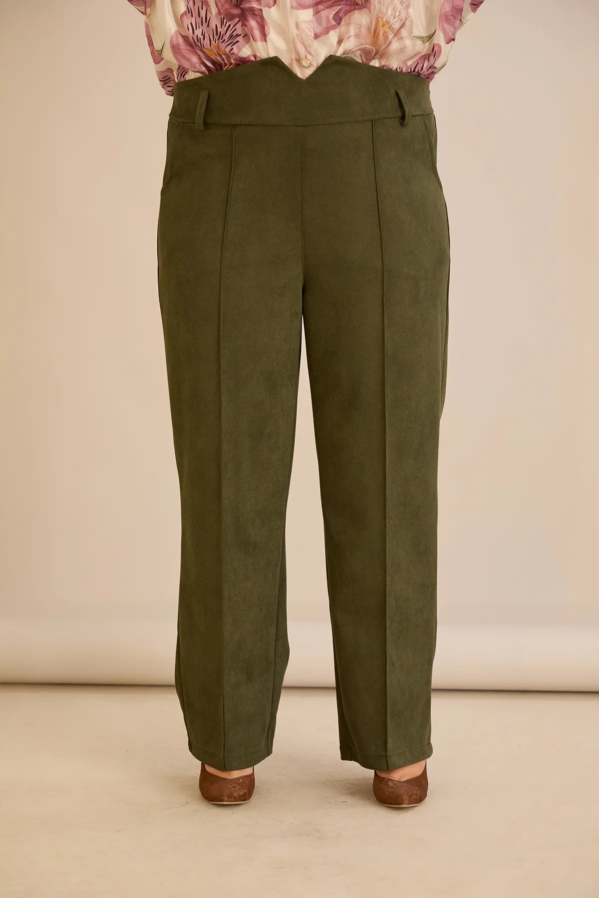 Κομψό παντελόνι με μπροστινή ραφή και ψηλή μέση σε Χακί χρώμα σε μεγάλα μεγέθη