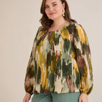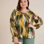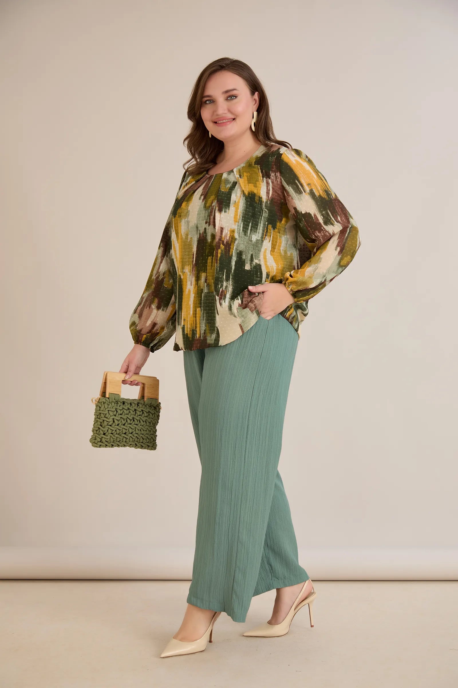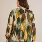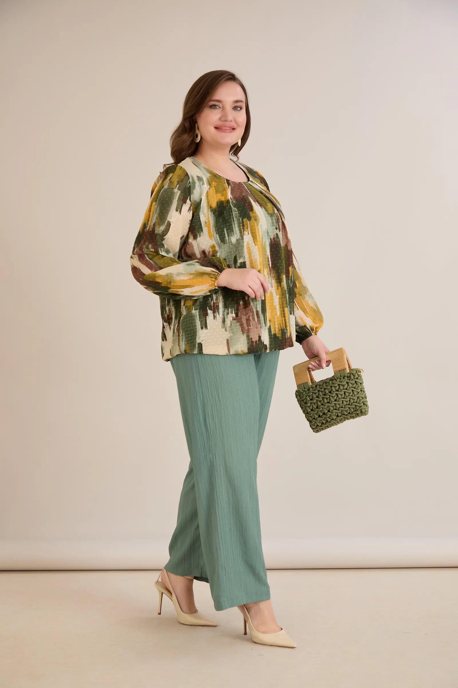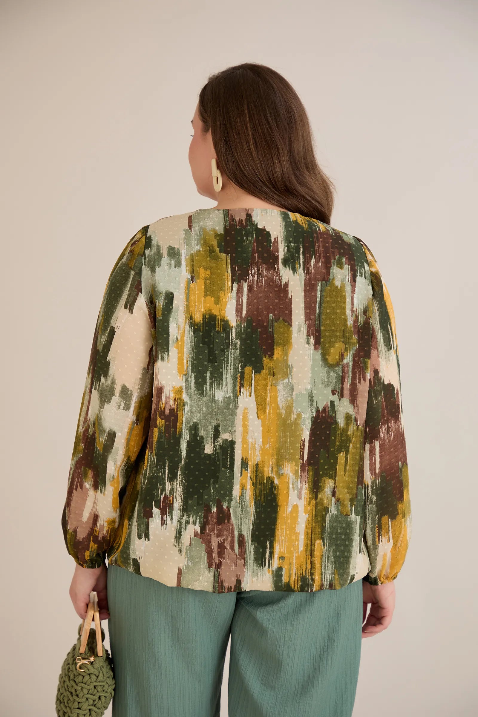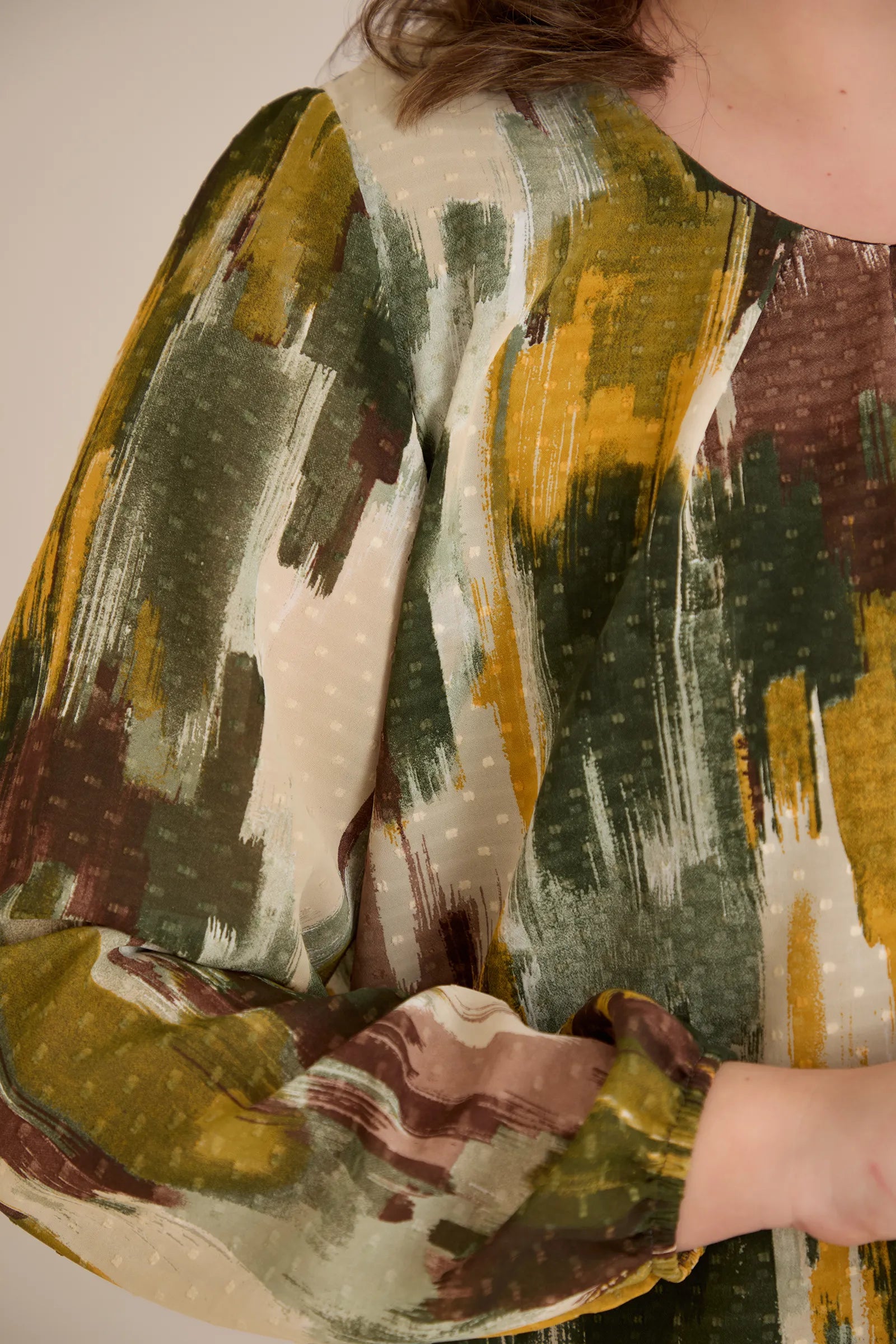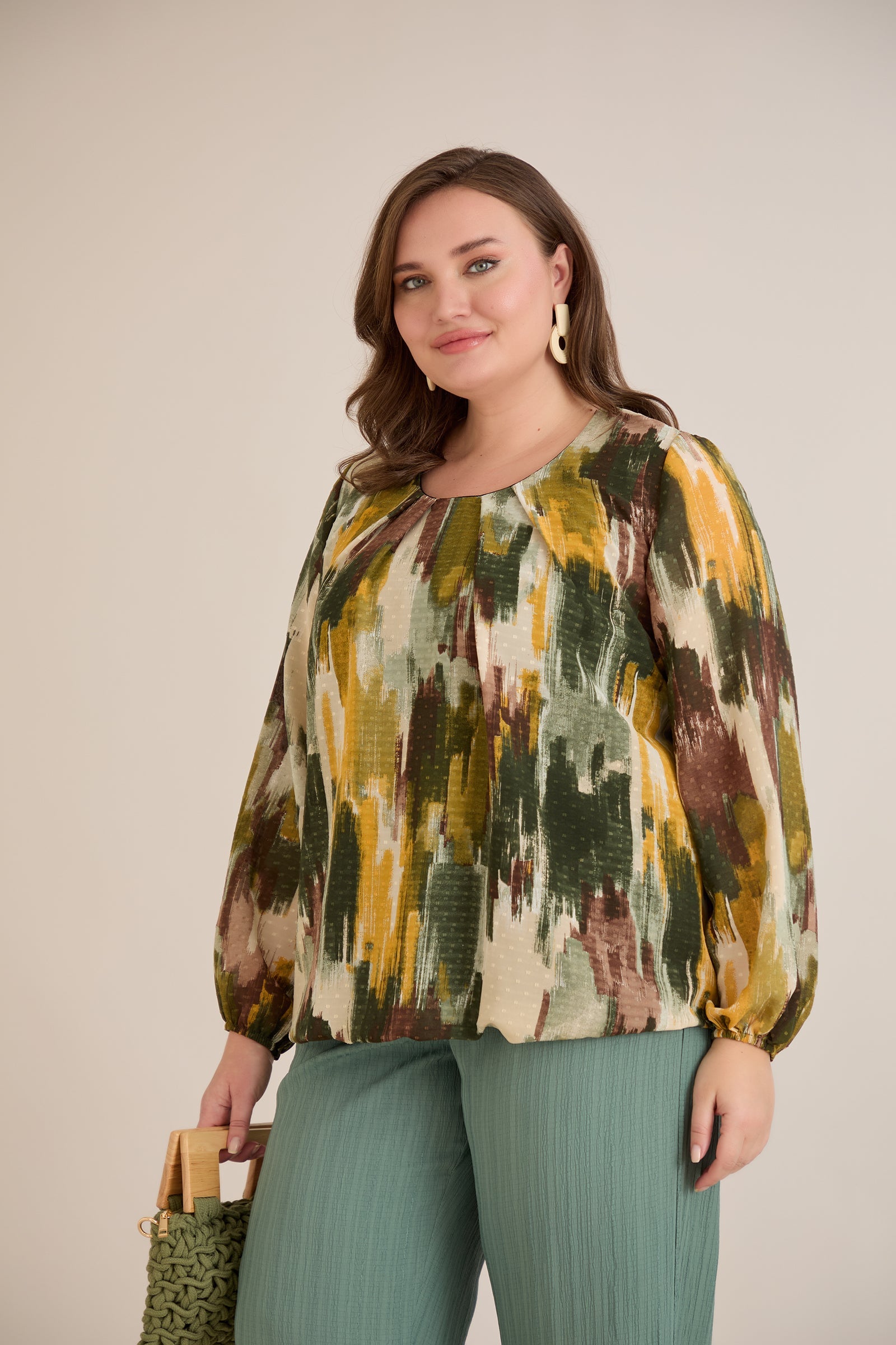 Πολύχρωμη μπλούζα σε άνετη γραμμή από μουσελίνα με χακί απόχρωση σε μεγάλα μεγέθη
