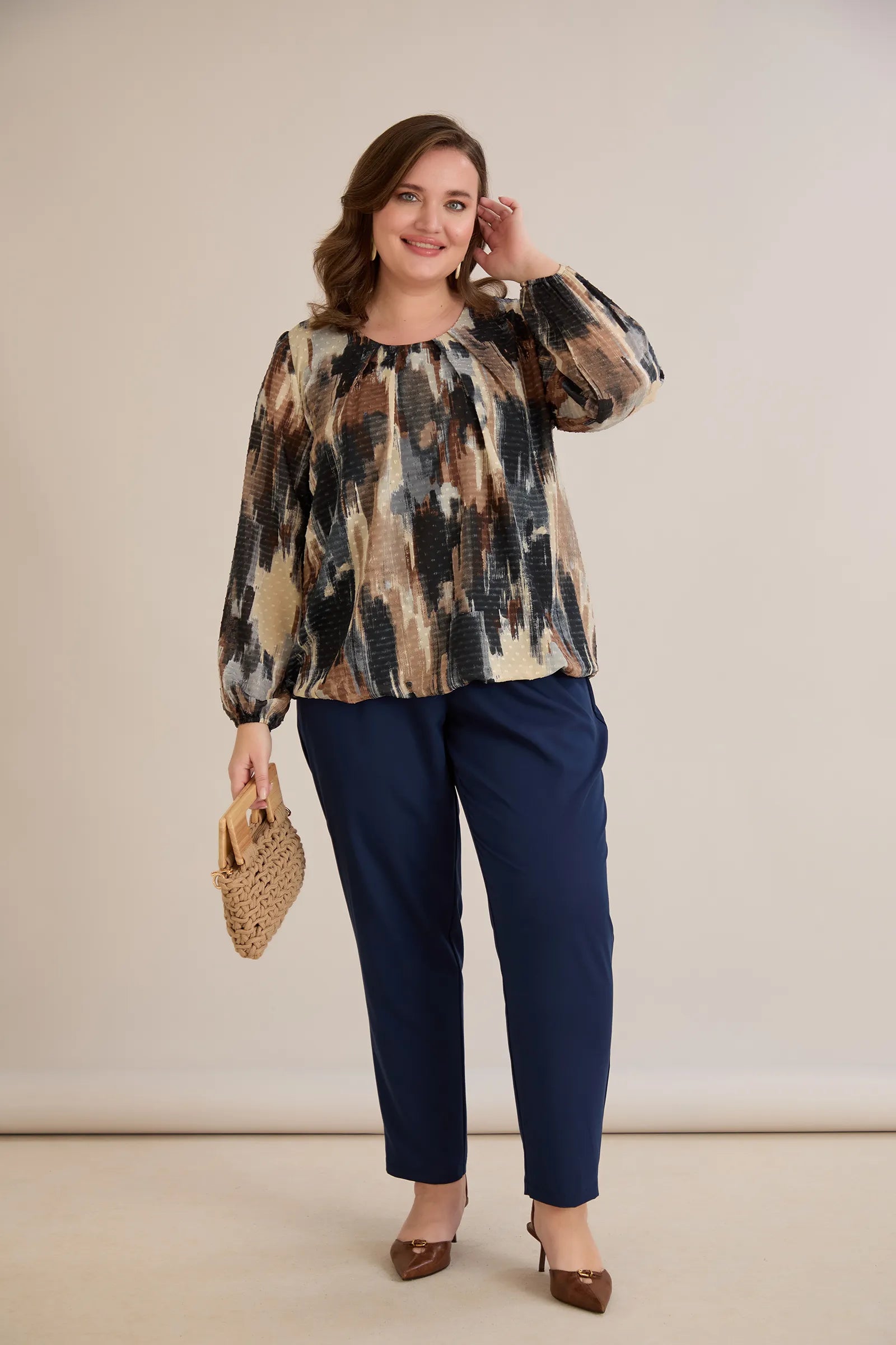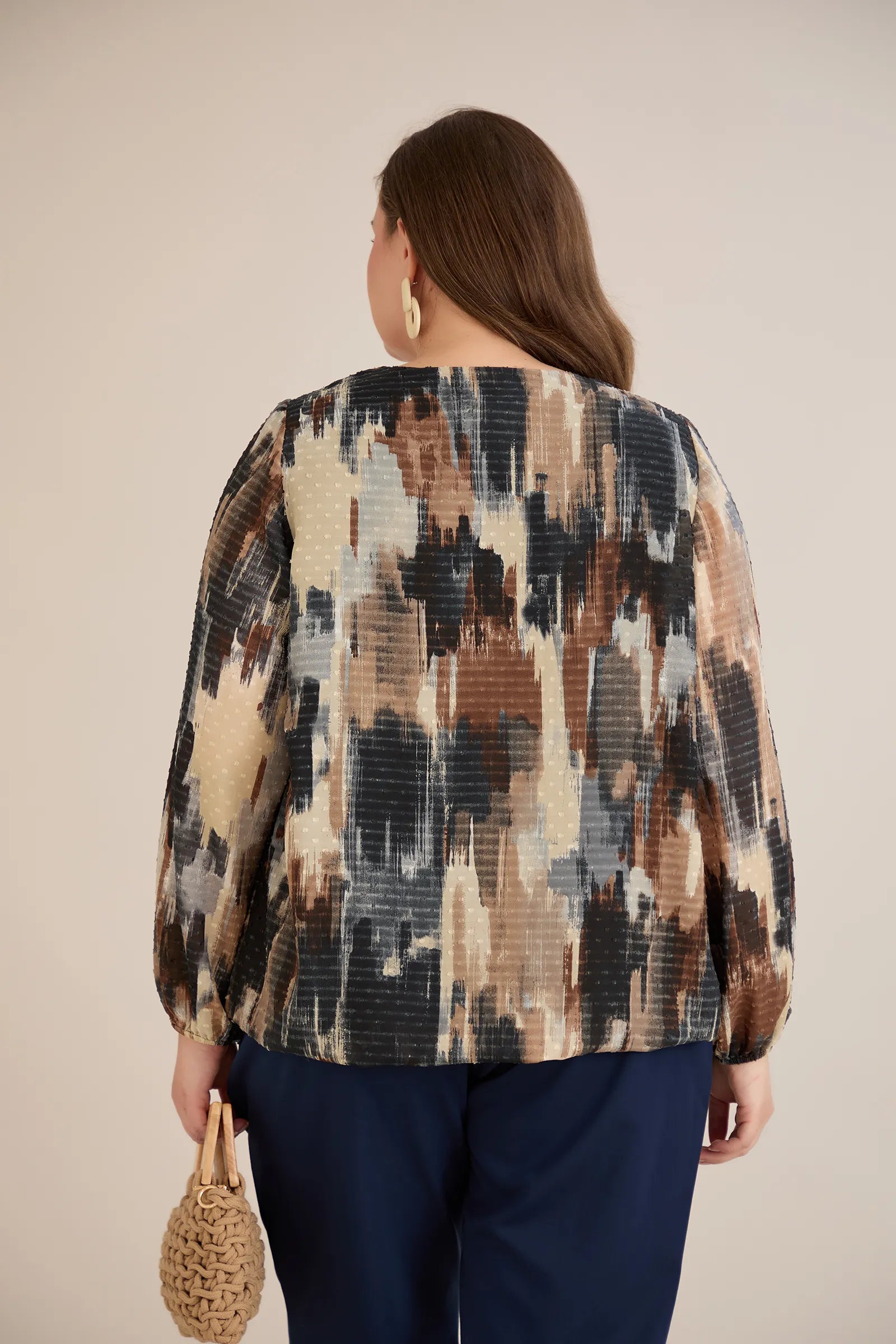 Πολύχρωμη μπλούζα σε άνετη γραμμή από μουσελίνα με Μόκα απόχρωση σε μεγάλα μεγέθη