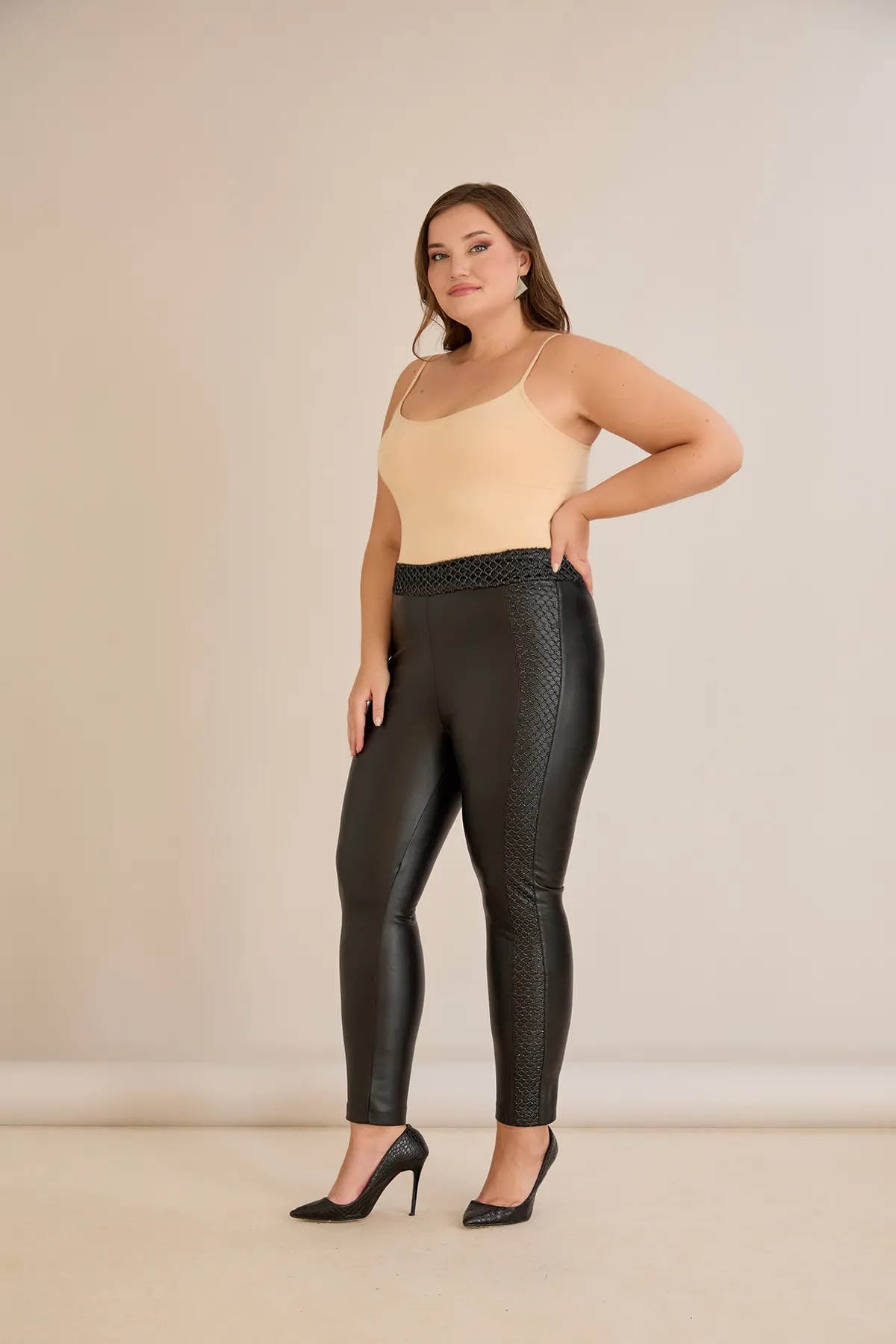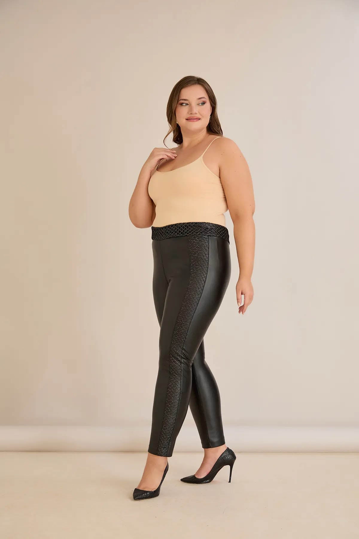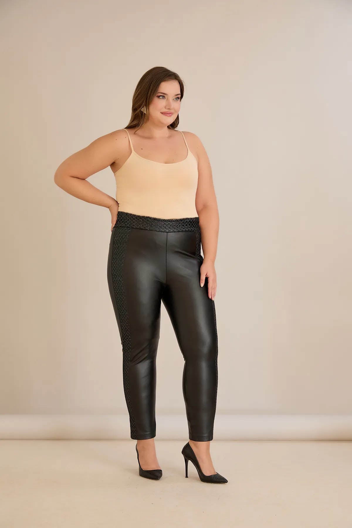 Ψηλόμεσο κολάν δερματίνης με επένδυση και εντυπωσιακή διακόσμηση με δίχτυ σε μαύρο χρώμα σε μεγάλα μεγέθη