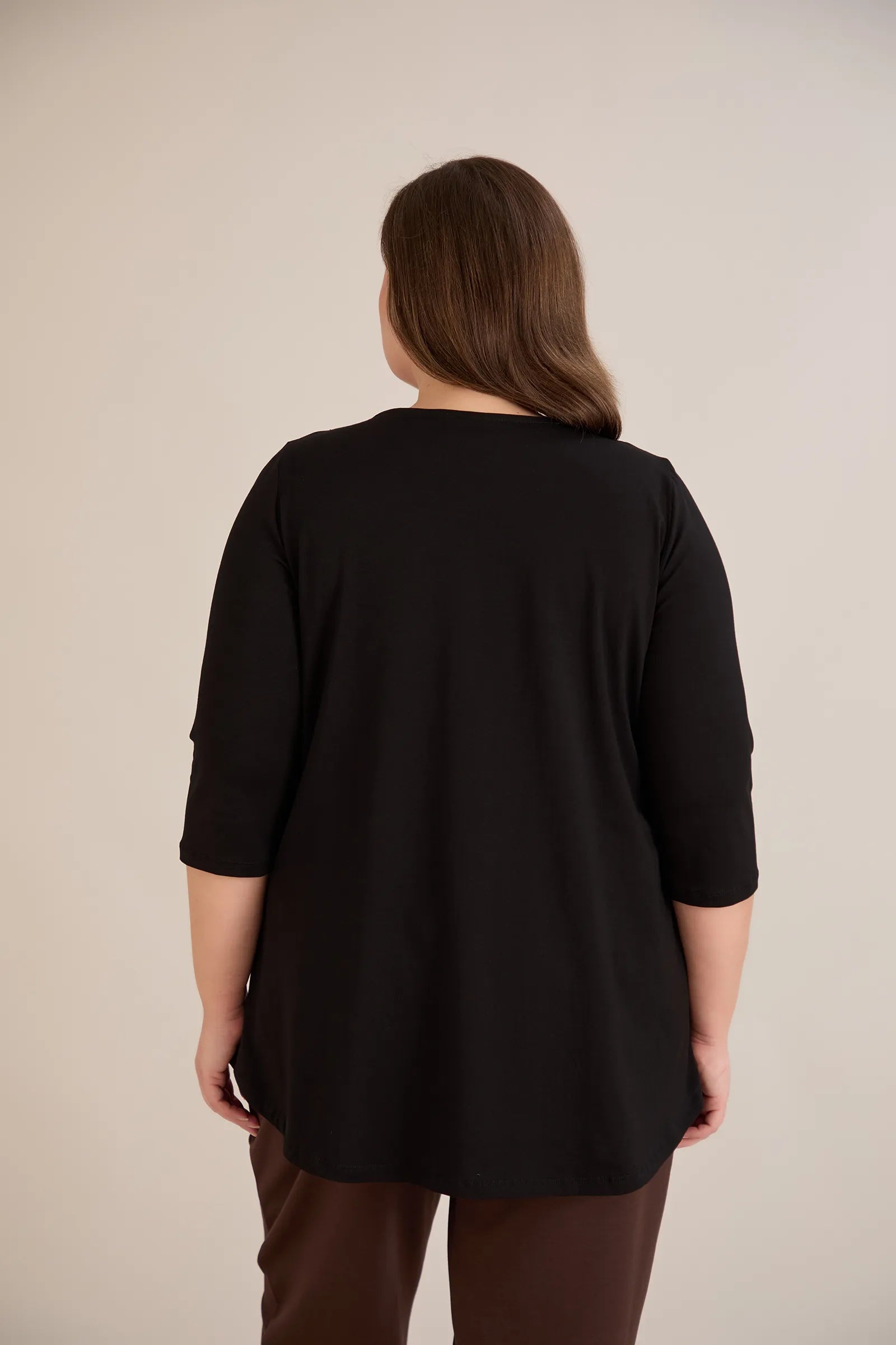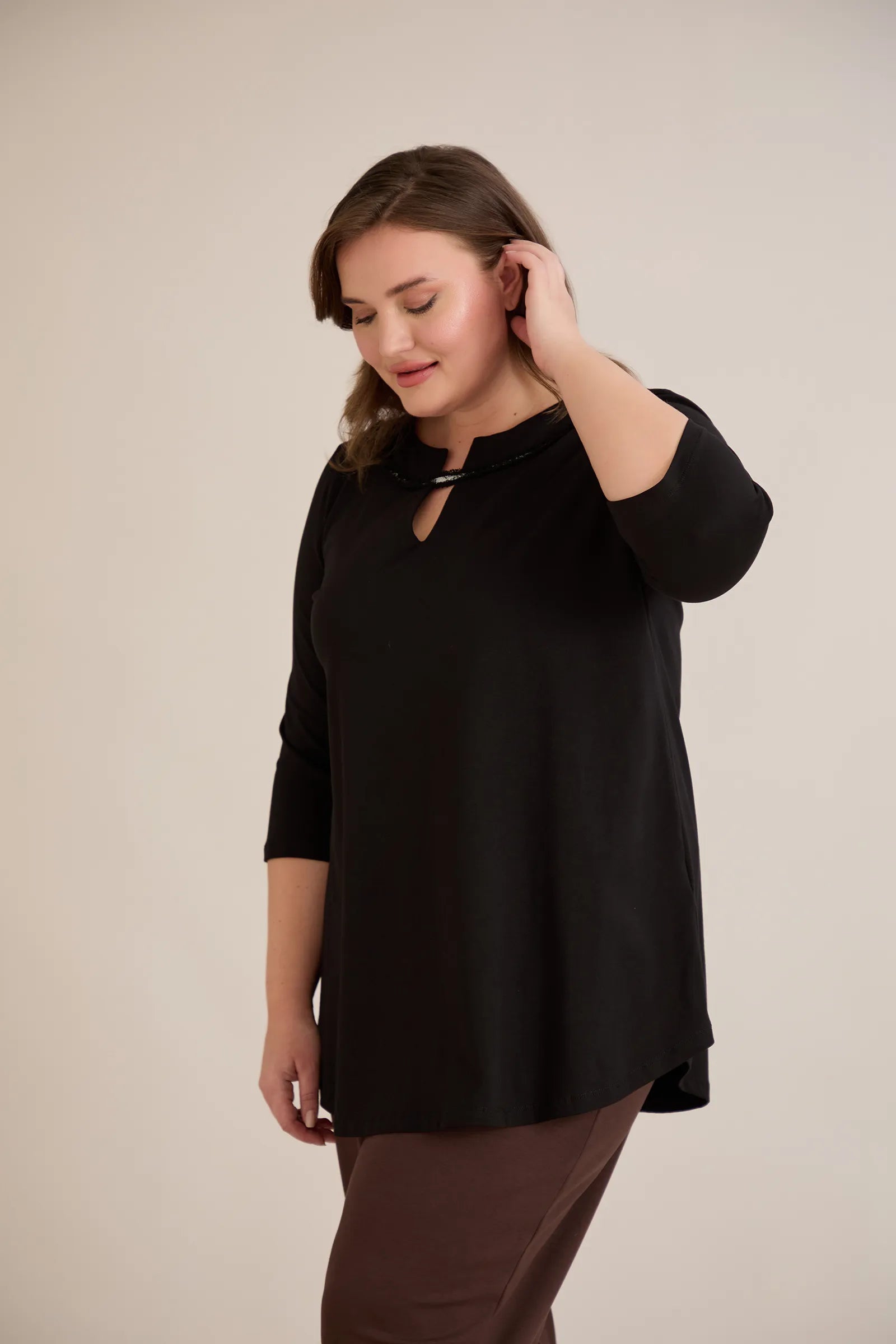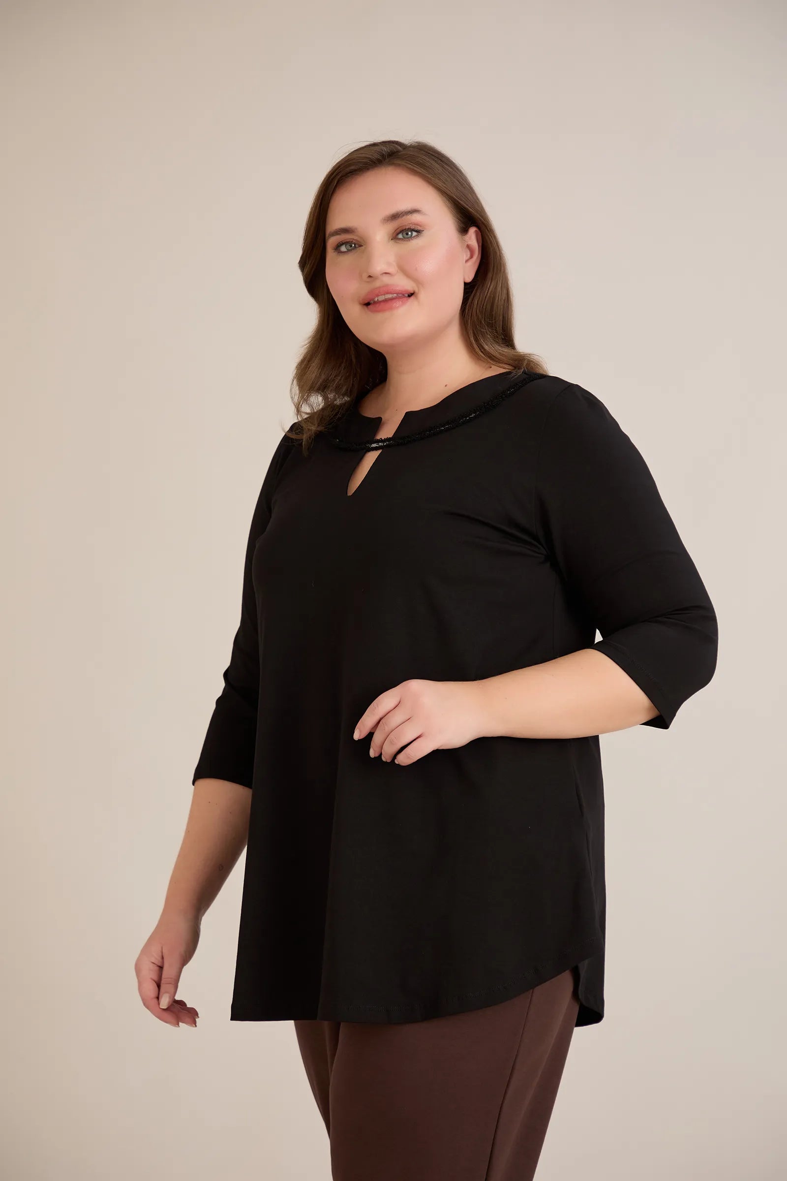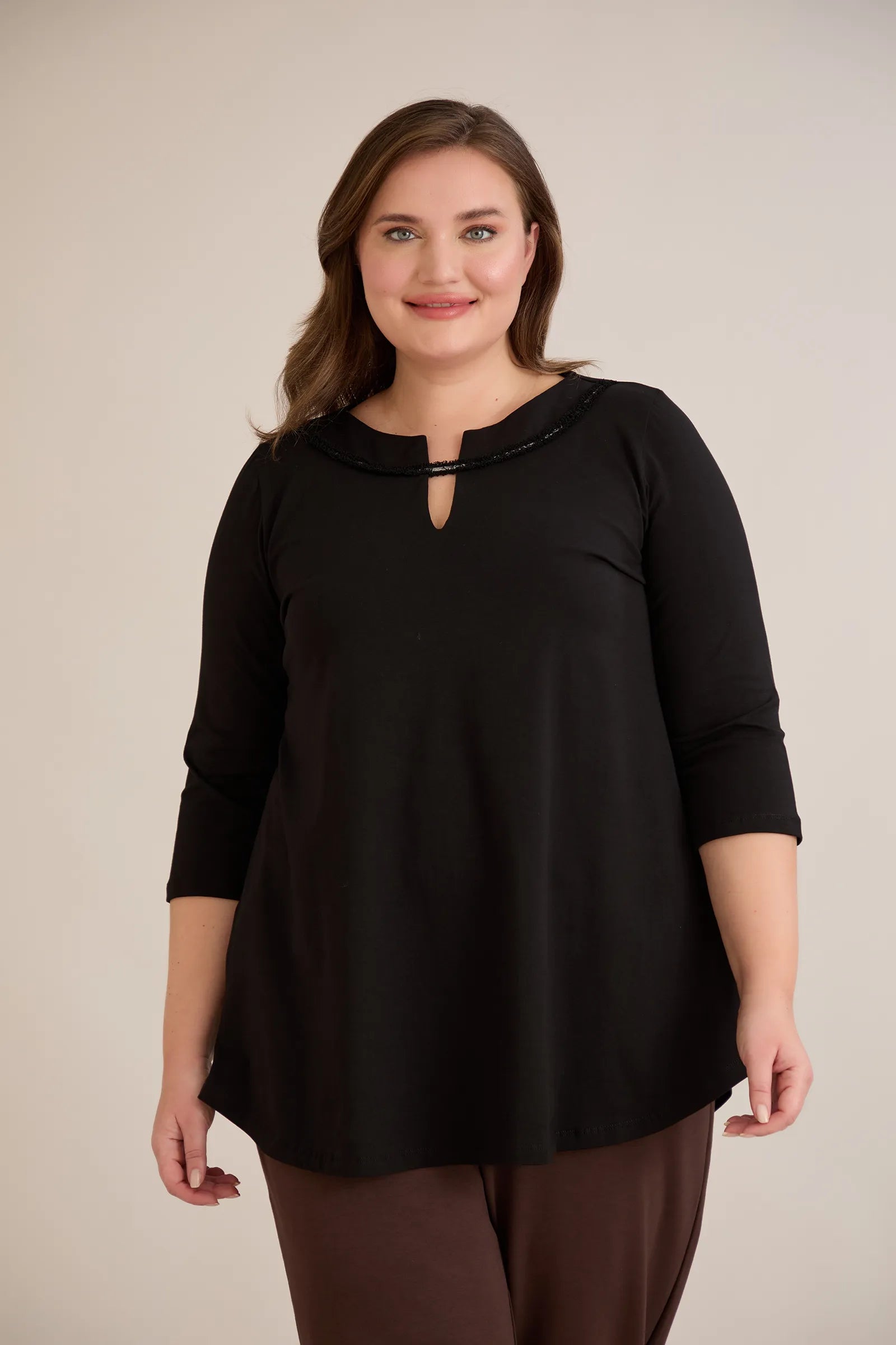 Βαμβακερή τουνίκ με εντυπωσιακό ντεκολτέ με ασημί λεπτομέρεια σε μαύρο χρώμα σε μεγάλα μεγέθη
